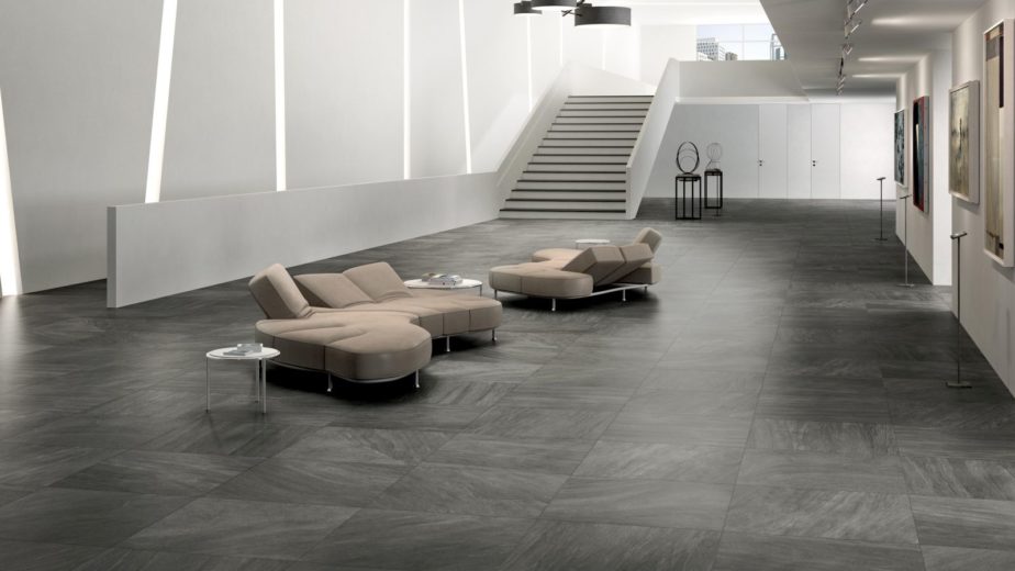 • Carreau en grès blanc de grande taille, notamment 120×120 cm. Ces dimensions sont généralement suggérées pour les pièces avec de grands espaces, car elles apportent de la luminosité épurent et agrandissent visuellement une pièce.