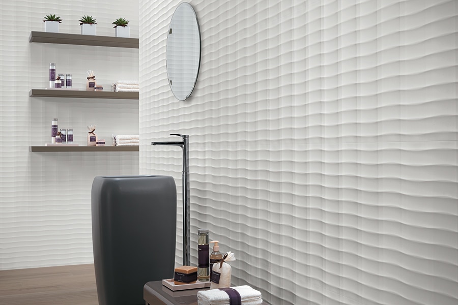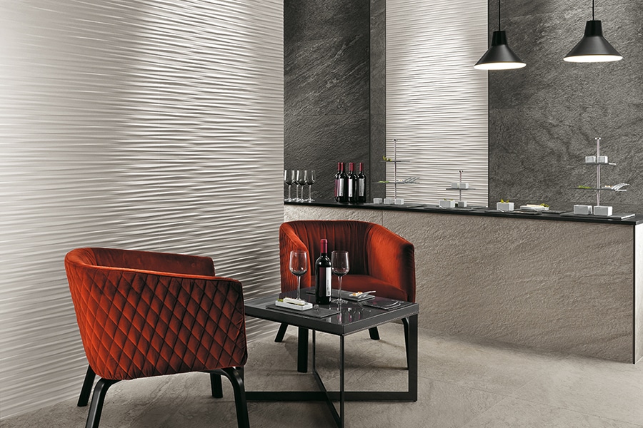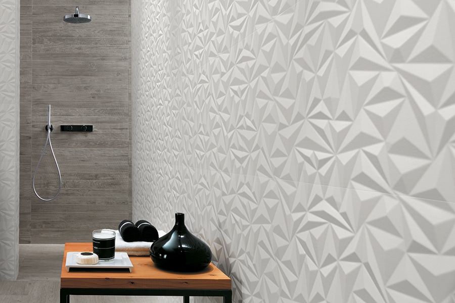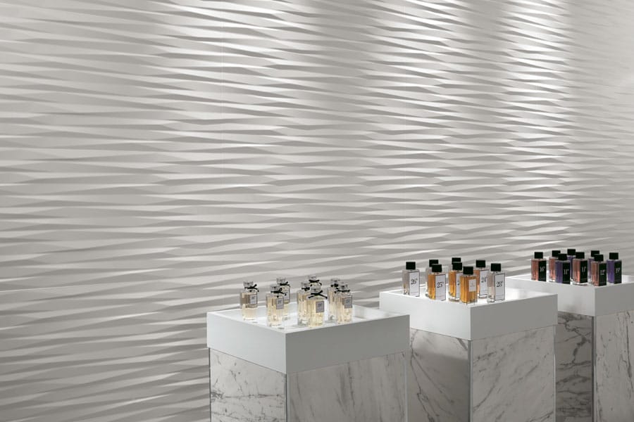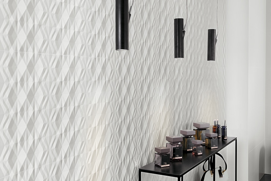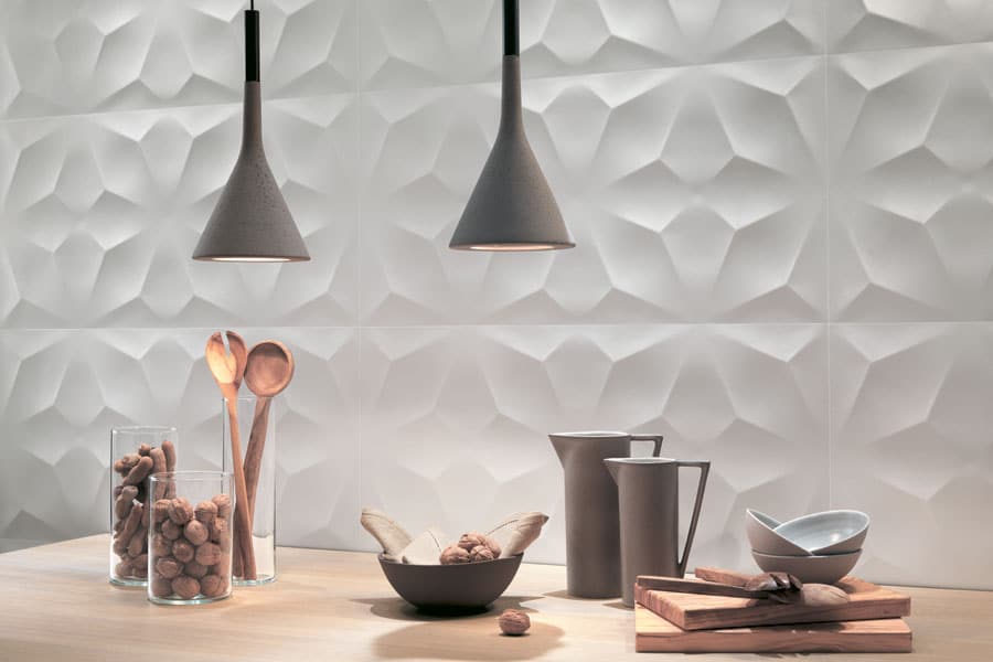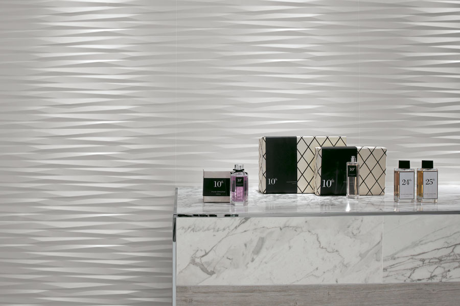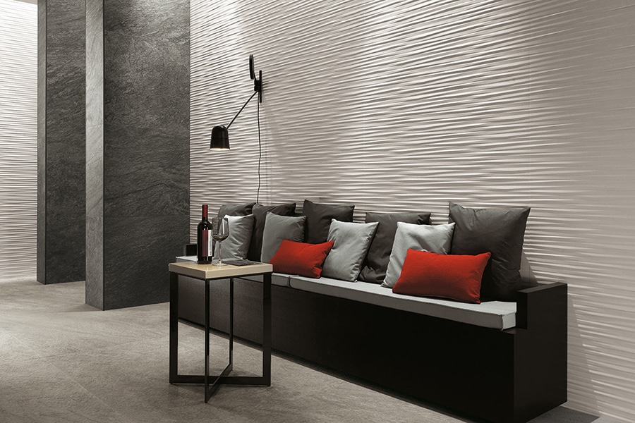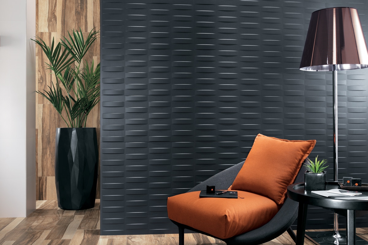 La ligne 3D riche de ses surfaces en céramique reliefs créent des murs décoratifs esthétiquement captivants et dynamiques. Les innombrables reliefs de la surface, équilibre harmonieux de lignes droites et de profils anguleux, offre un effet 3D de revêtement se transformant selon la direction et l’influence de la lumière.