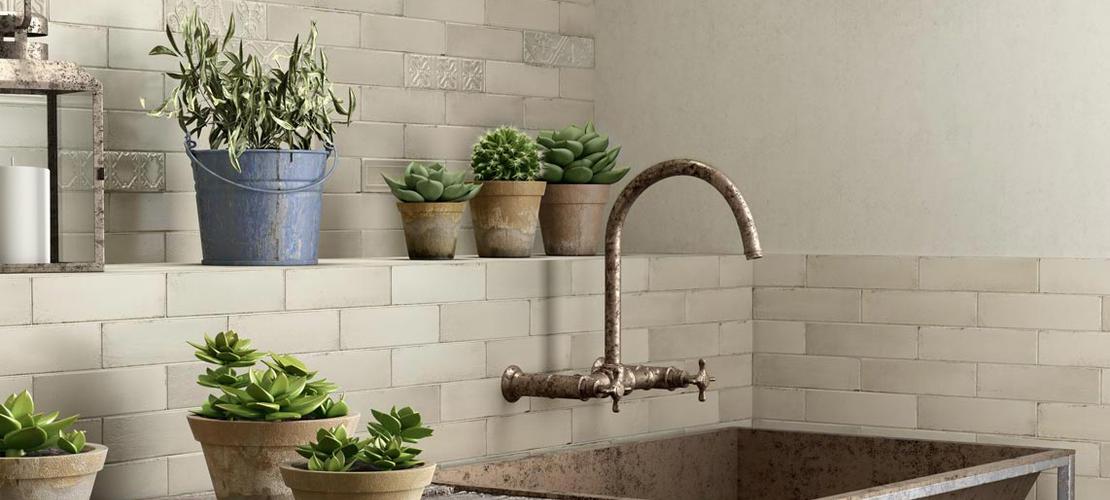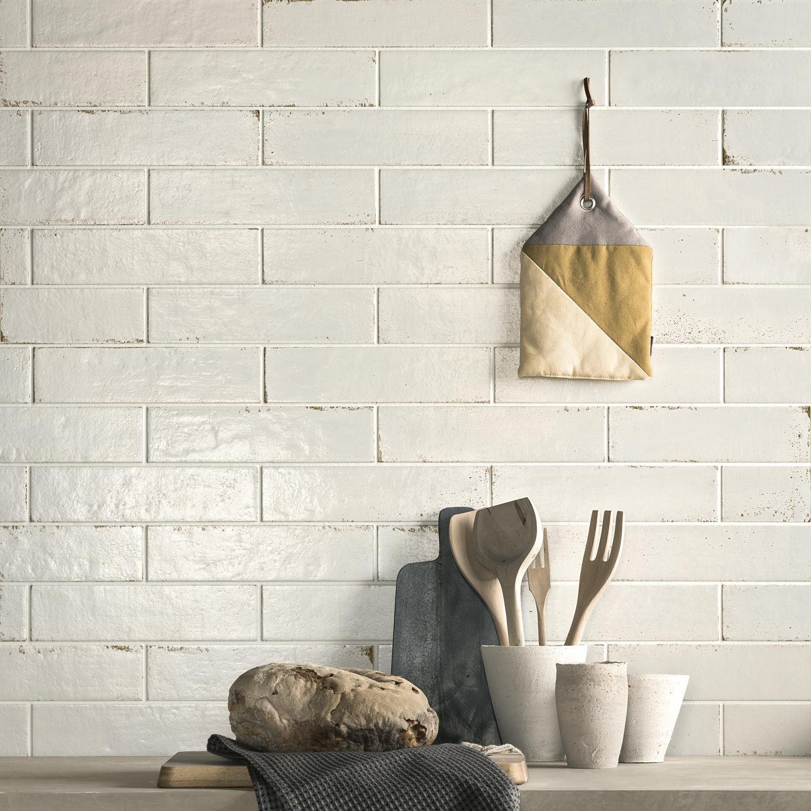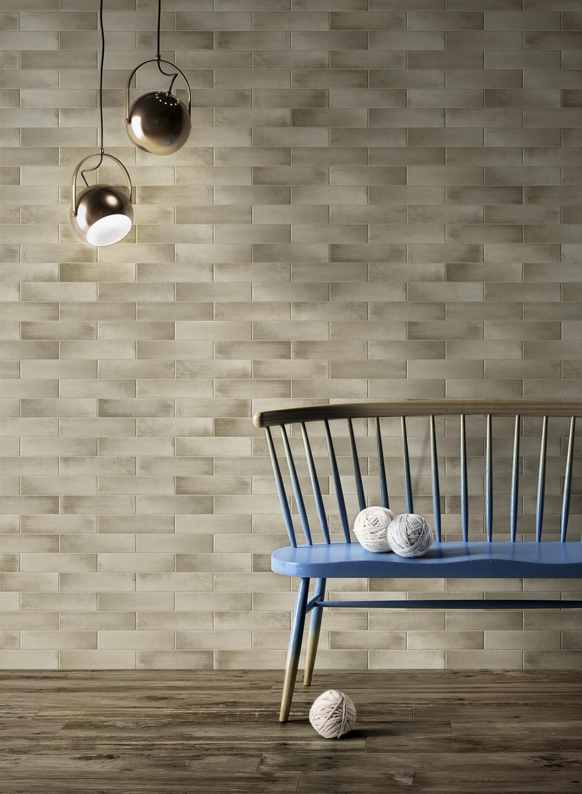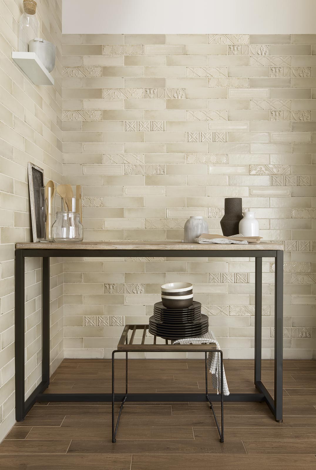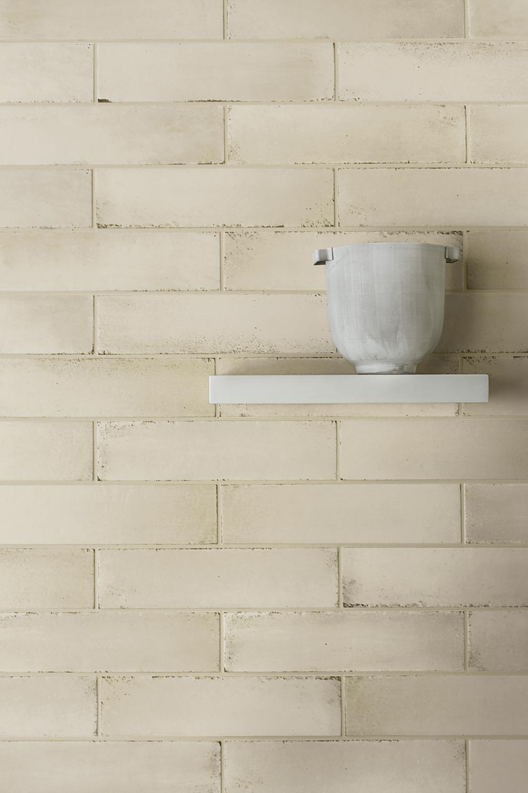 Une briquette revêtue de faïence à l’aspect ciré (7×28 cm). Les variations de couleurs ton sur ton et les bords abîmés portent les traces du temps et deviennent les décors qui donnent du caractère. Les couleurs neutres rehaussent l’harmonie et le naturel des formes.