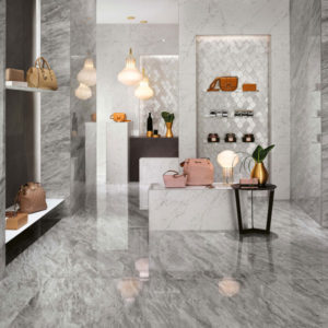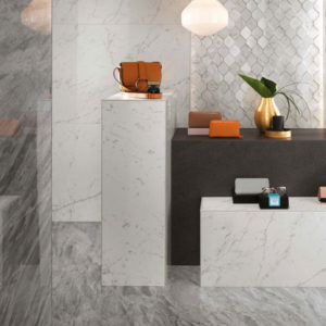 MARBLE STONE : Un projet de décoration marbre pour vos sols et murs qui combine des surfaces s’inspirant de pierres et de marbres, pour créer des lieux au design de grande elegance et de grand caractère. Le grès cérame effet marbre est interprété très légèrement et de manière contemporaine grâce à l’inspiration de la pierre, sobre et minimaliste.