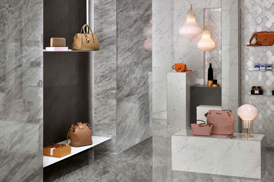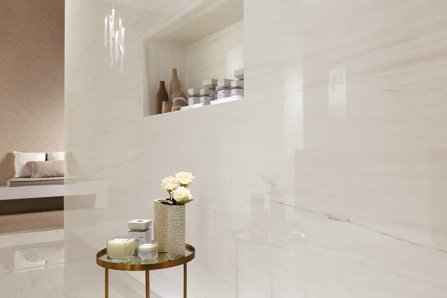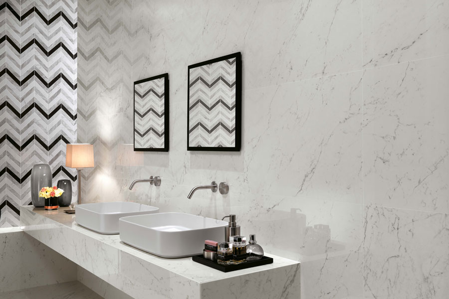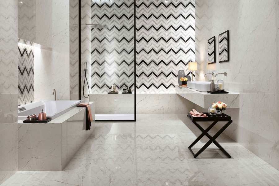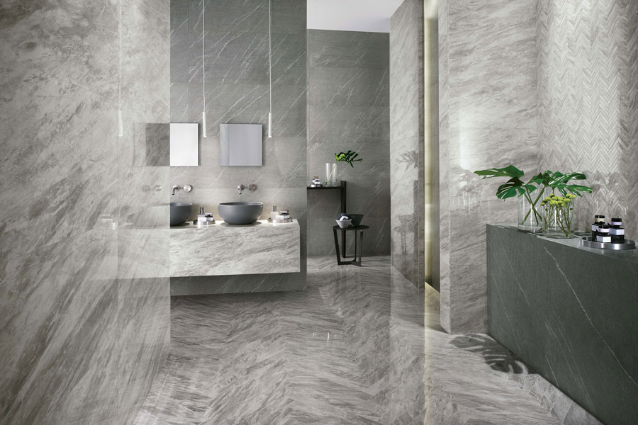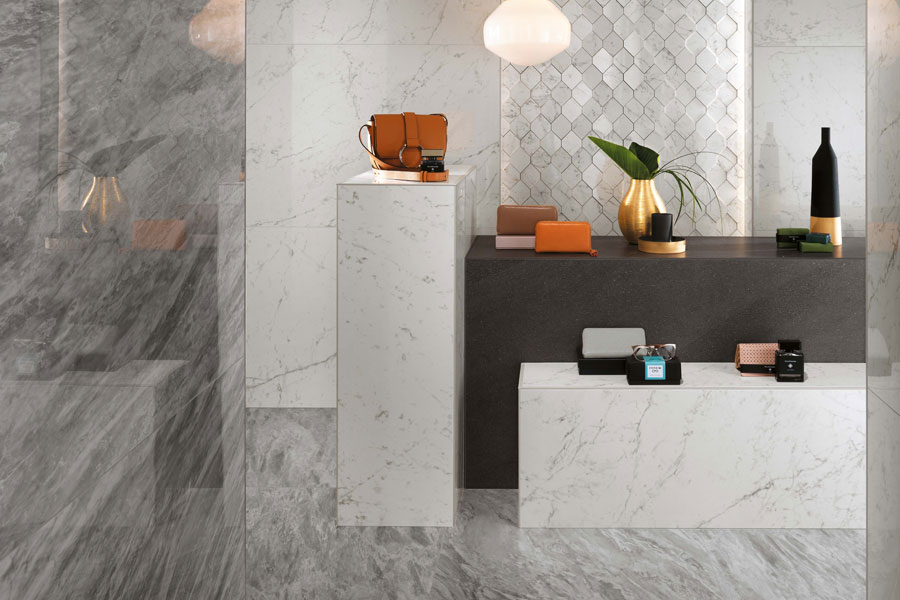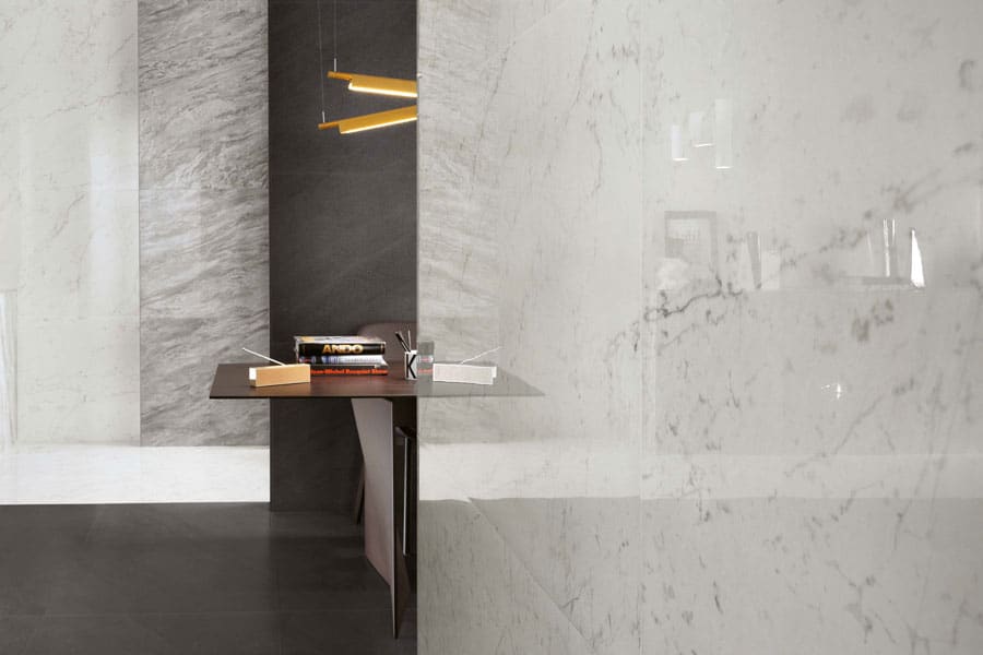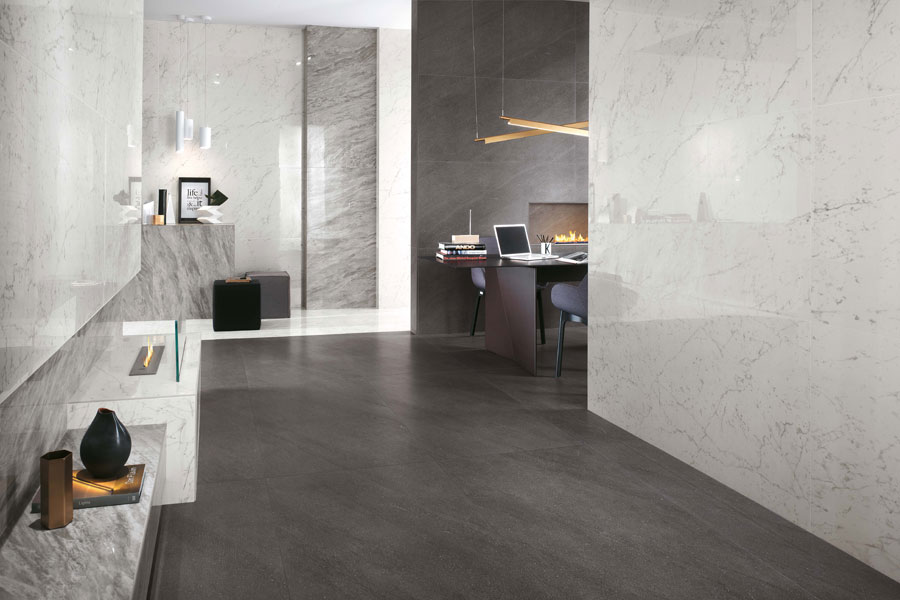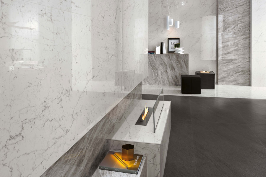 MARBLE STONE : Un projet de décoration marbre pour vos sols et murs qui combine des surfaces s’inspirant de pierres et de marbres, pour créer des lieux au design de grande elegance et de grand caractère. Le grès cérame effet marbre est interprété très légèrement et de manière contemporaine grâce à l’inspiration de la pierre, sobre et minimaliste.