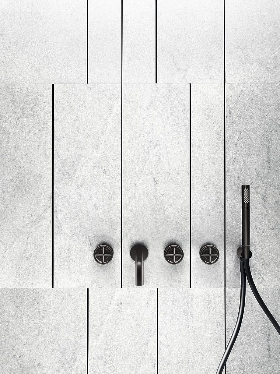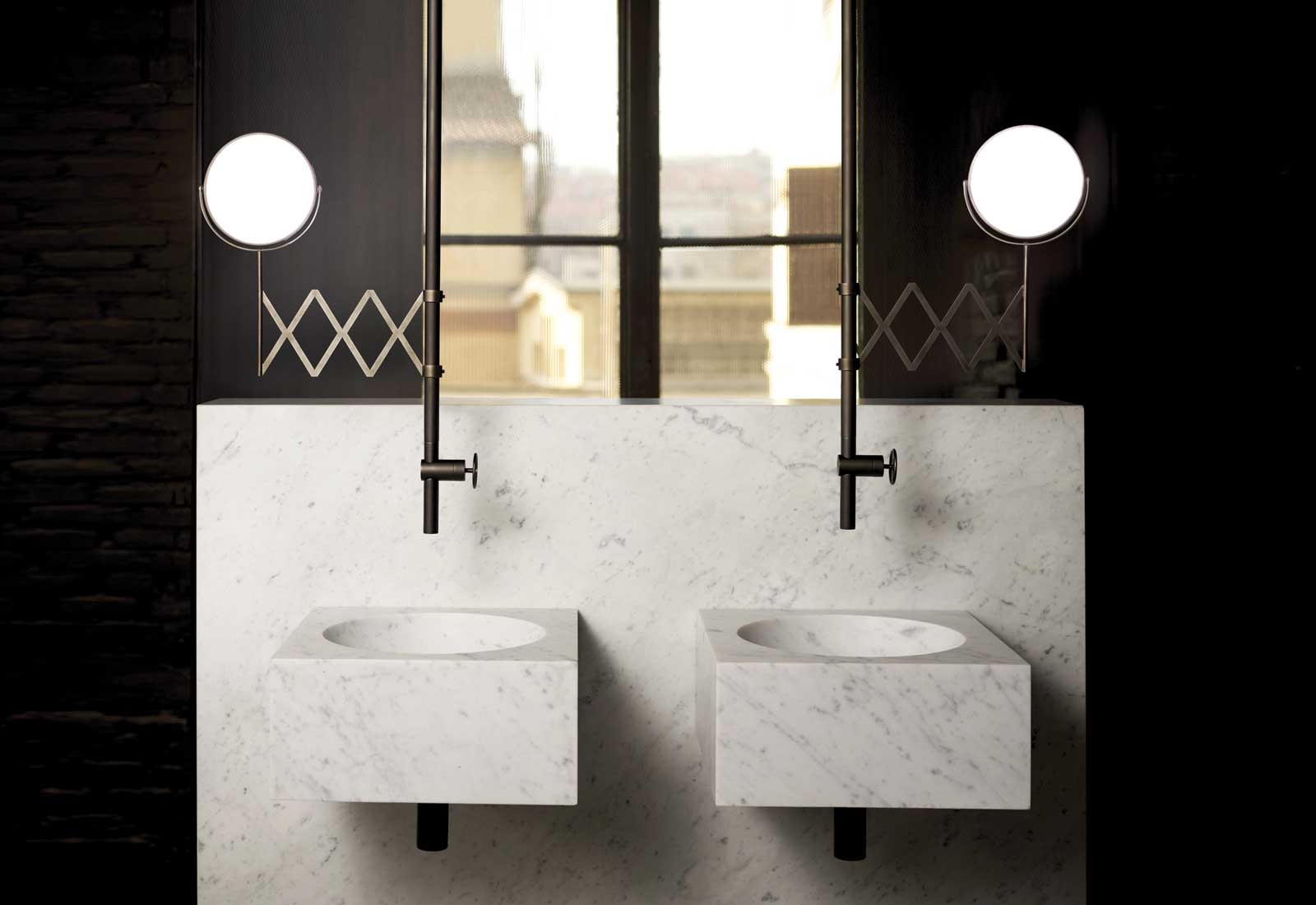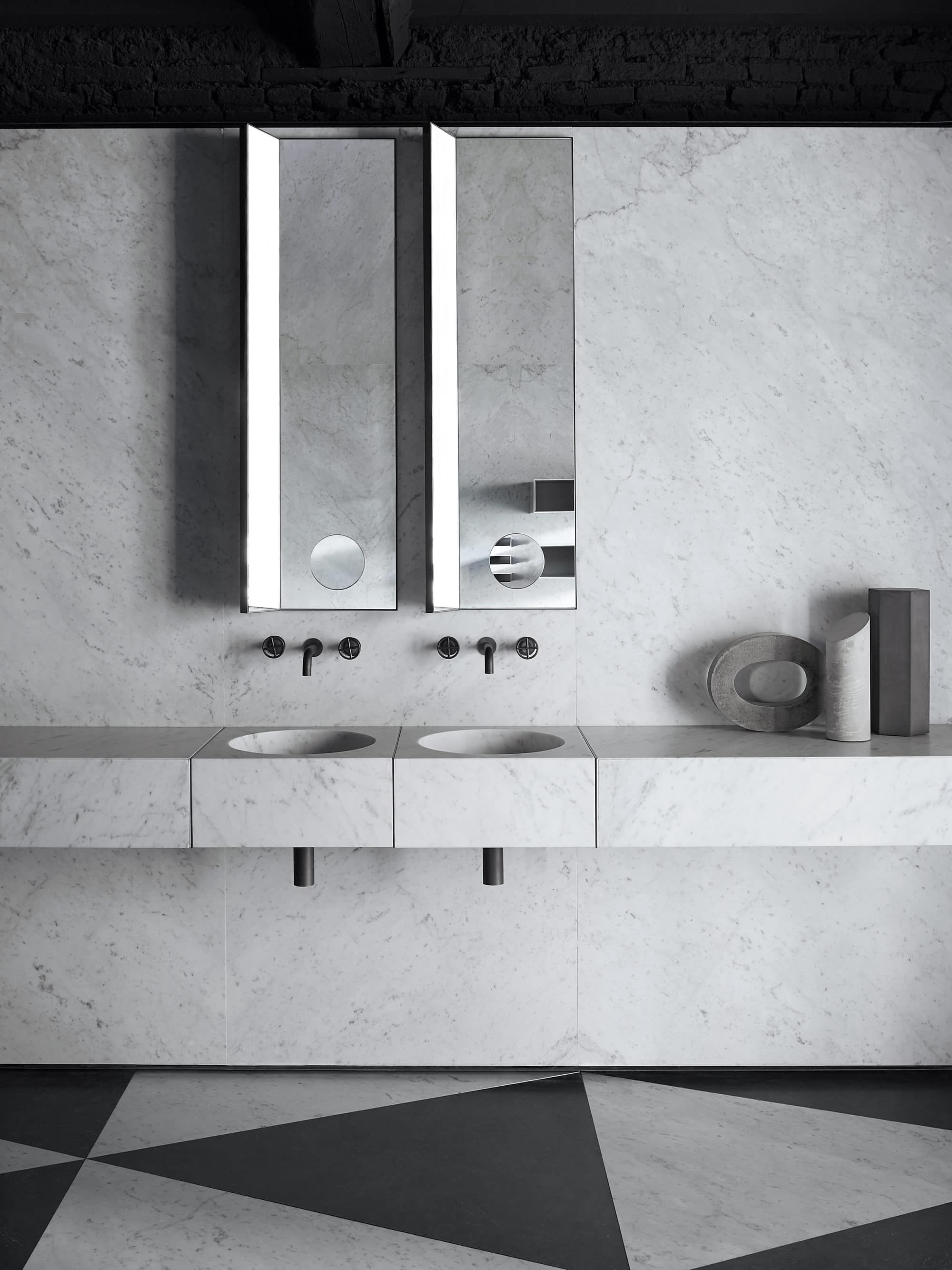 Le projet est né à la suite d’une recherche effectuée sur les formes archétypales traduites en géométrie pure et interprétées sous un jour contemporain. La richesse des matériaux, le marbre et les pierres destinés aux lavabos et la finition en Matt Gun Metal PVD enrichissent la pureté des formes. La collection FONTANE BIANCHE tire son nom d’une localité aux sables blancs en Sicile, appelée ainsi à cause des nombreuses fontaines naturelles d’eau douce qui jaillissent dans la mer.