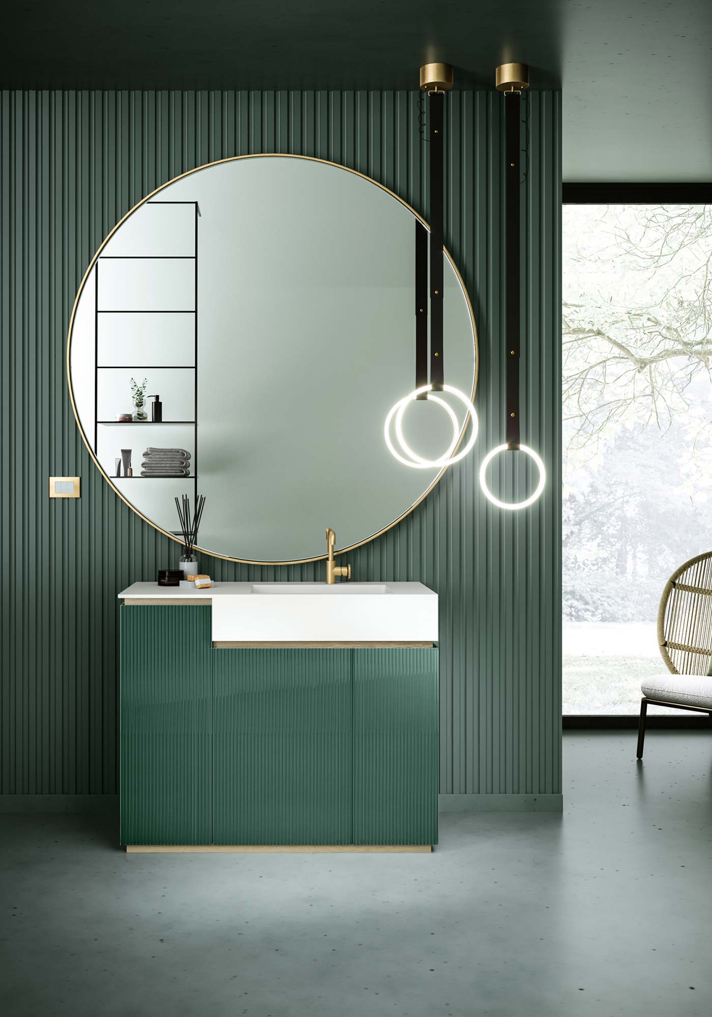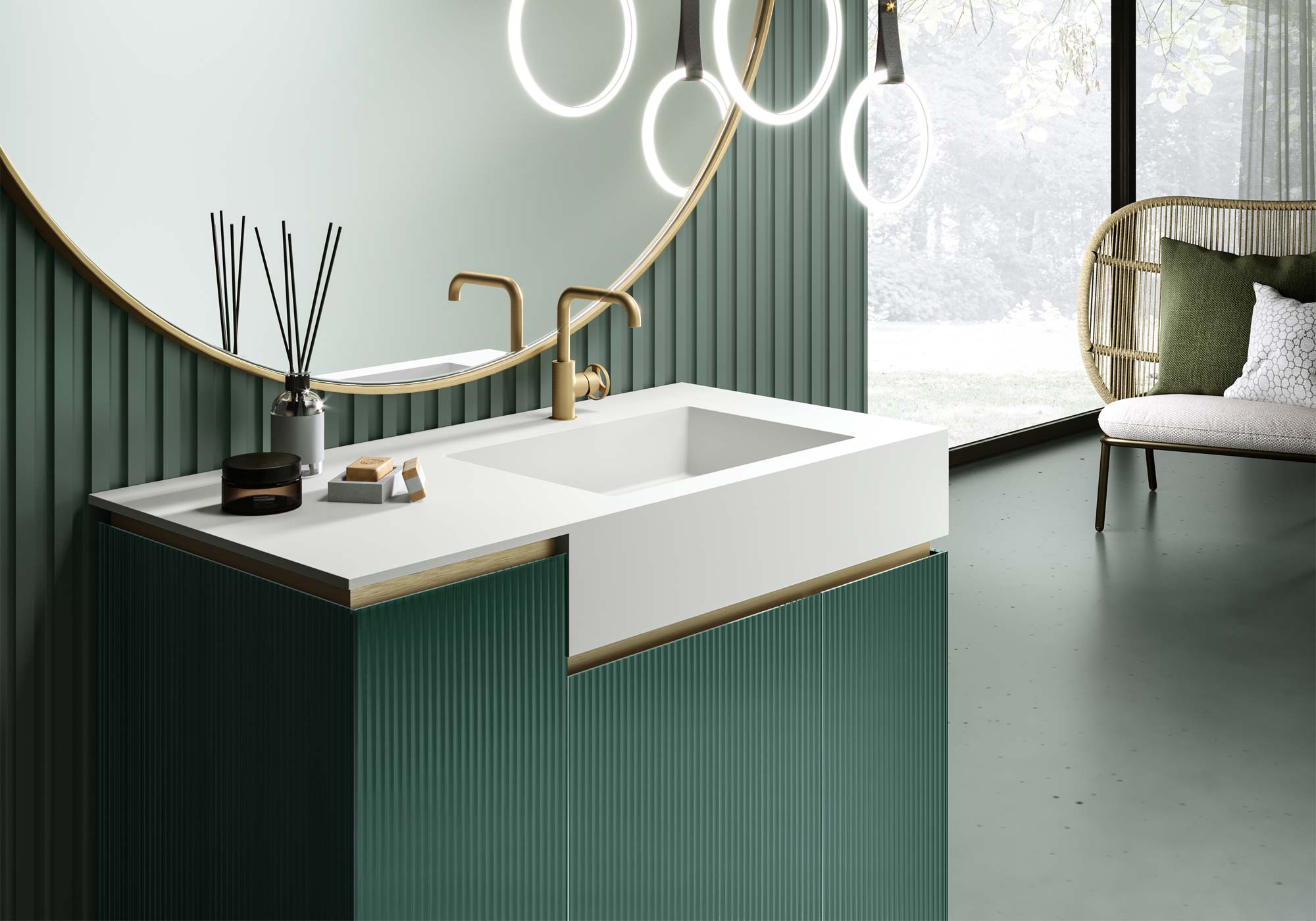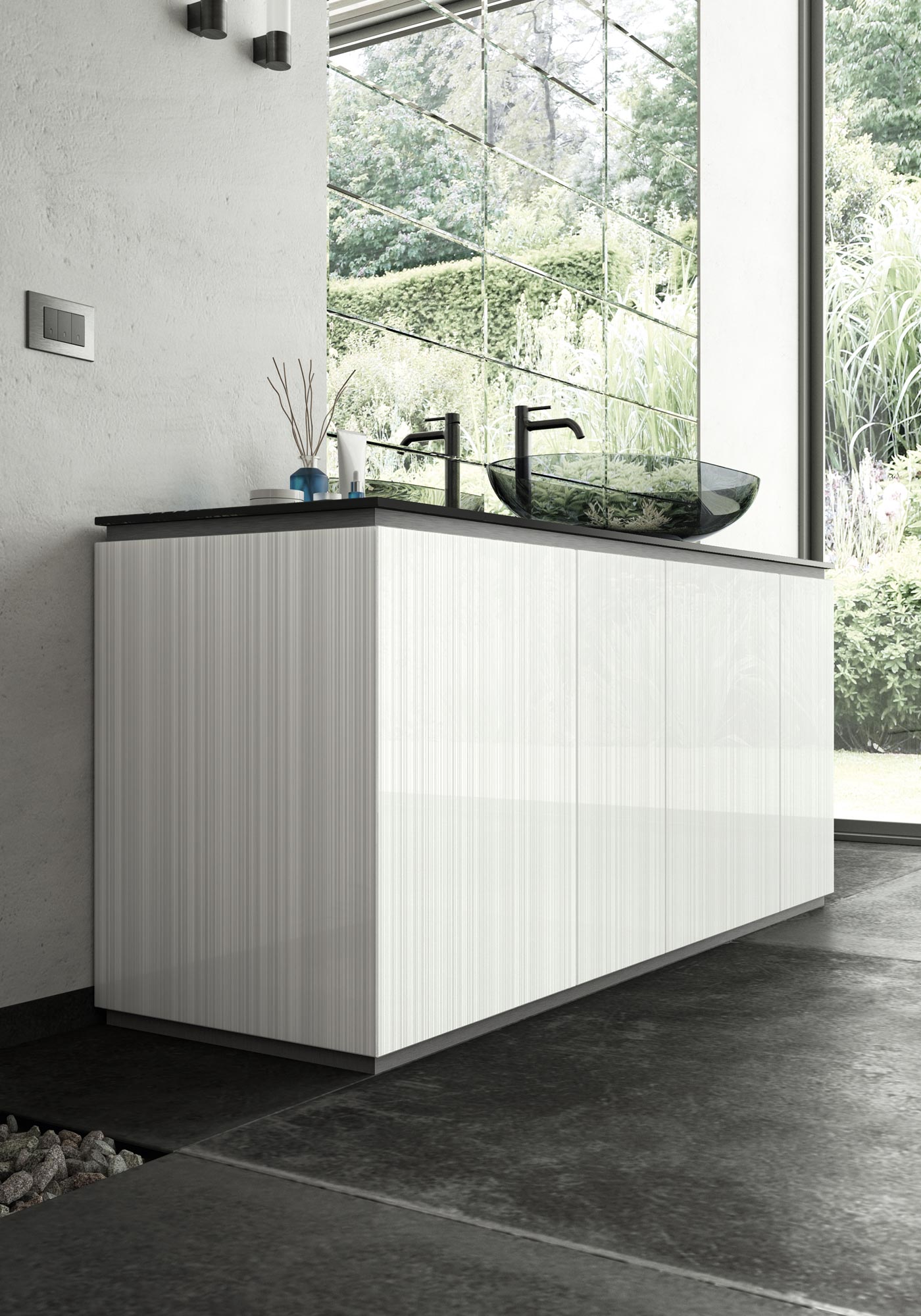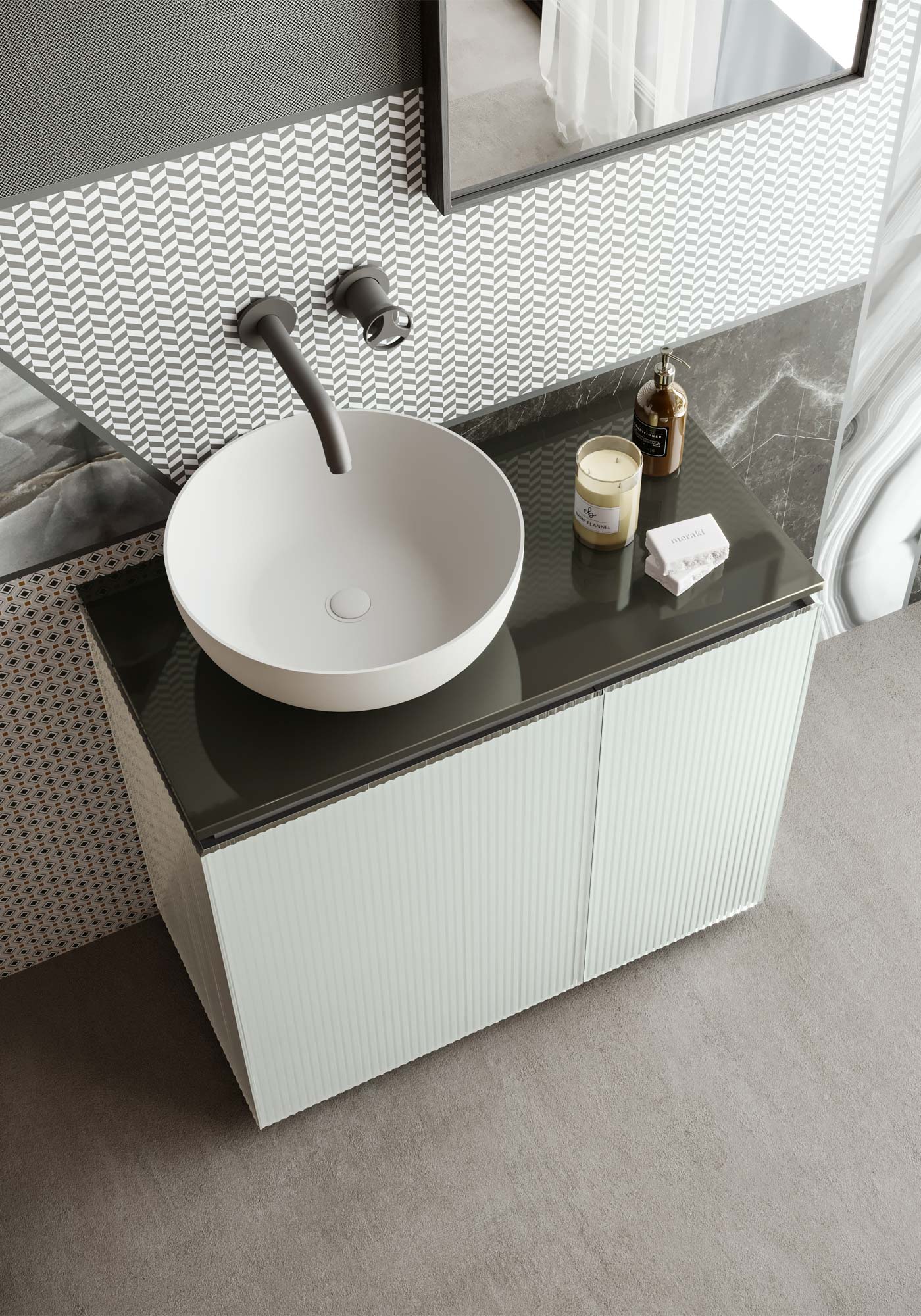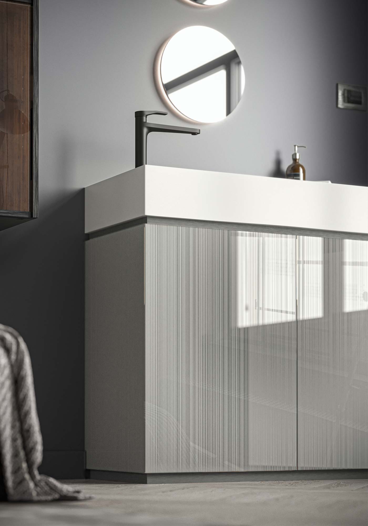 Meuble sous vasque posé au sol avec des formes simples et des lignes rigoureuses qui, même dans les dimensions les plus réduites, permet une bonne capacité de rangement. Le programme se développe avec des modules composables qui créent une modularité.