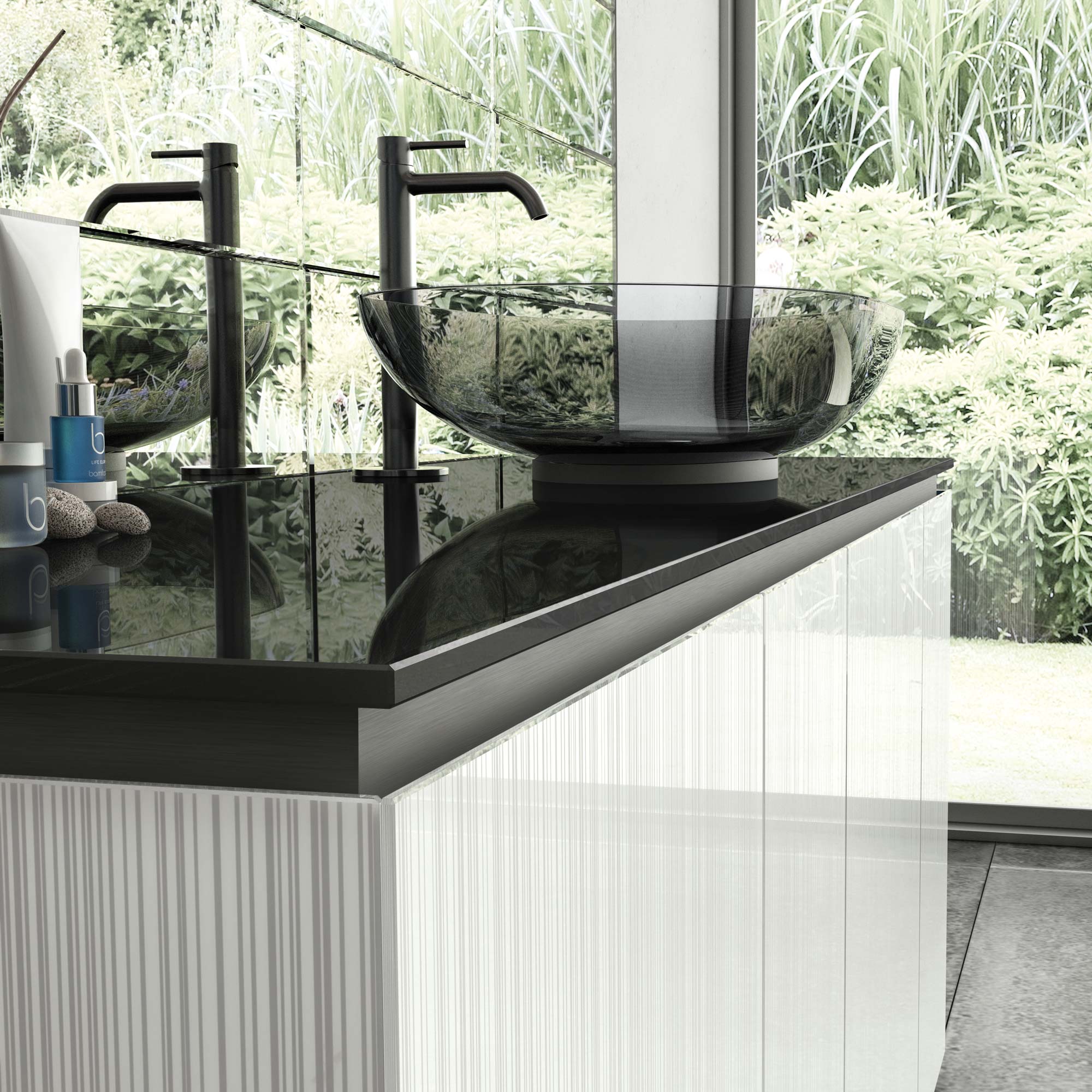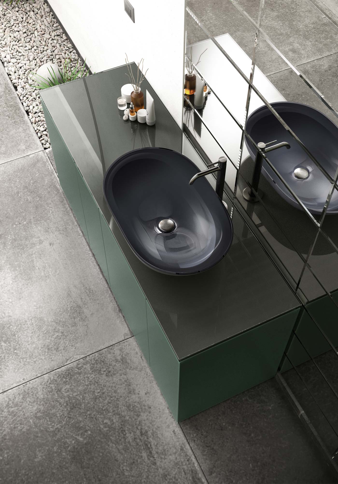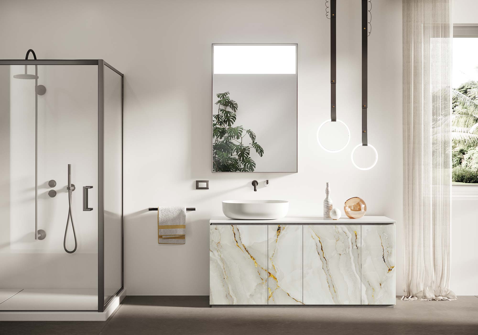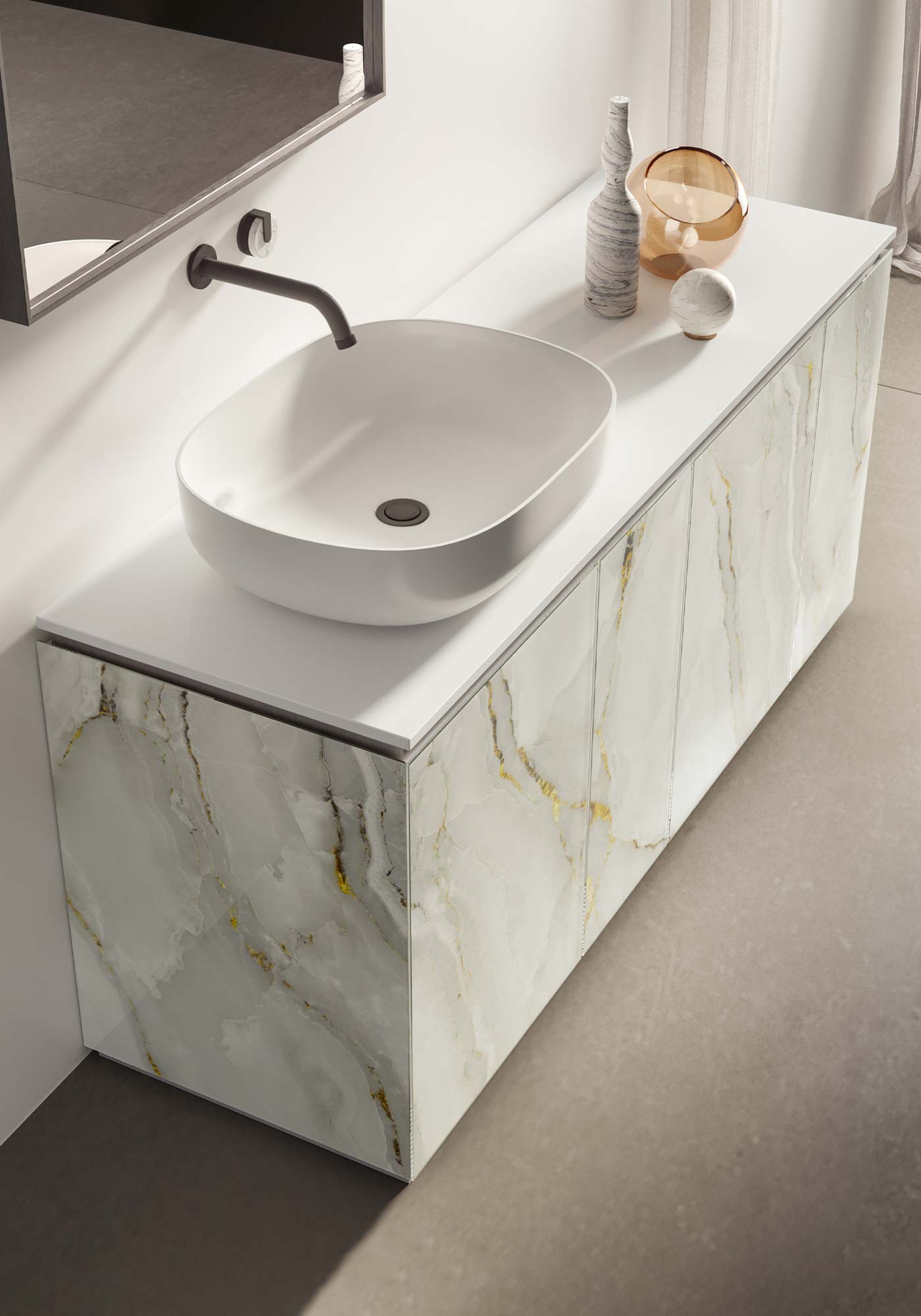 Meuble sous vasque posé au sol avec des formes simples et des lignes rigoureuses qui, même dans les dimensions les plus réduites, permet une bonne capacité de rangement. Le programme se développe avec des modules composables qui créent une modularité.
