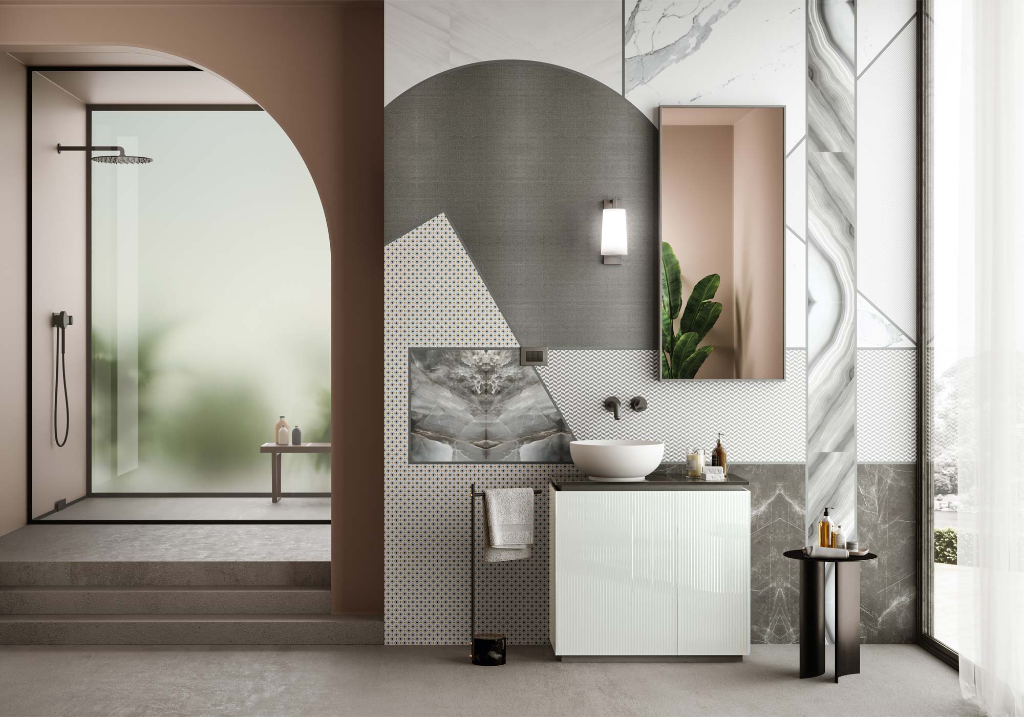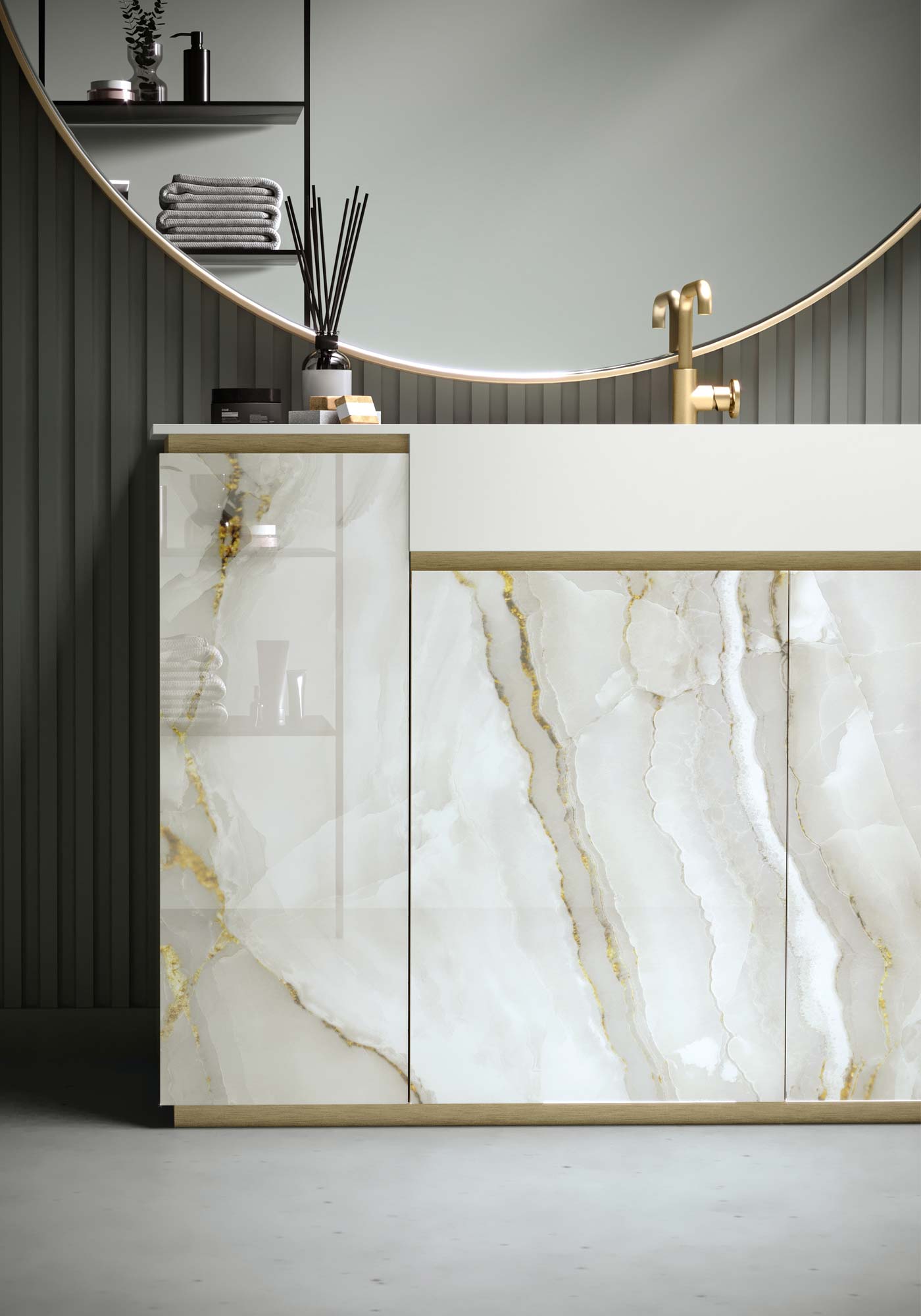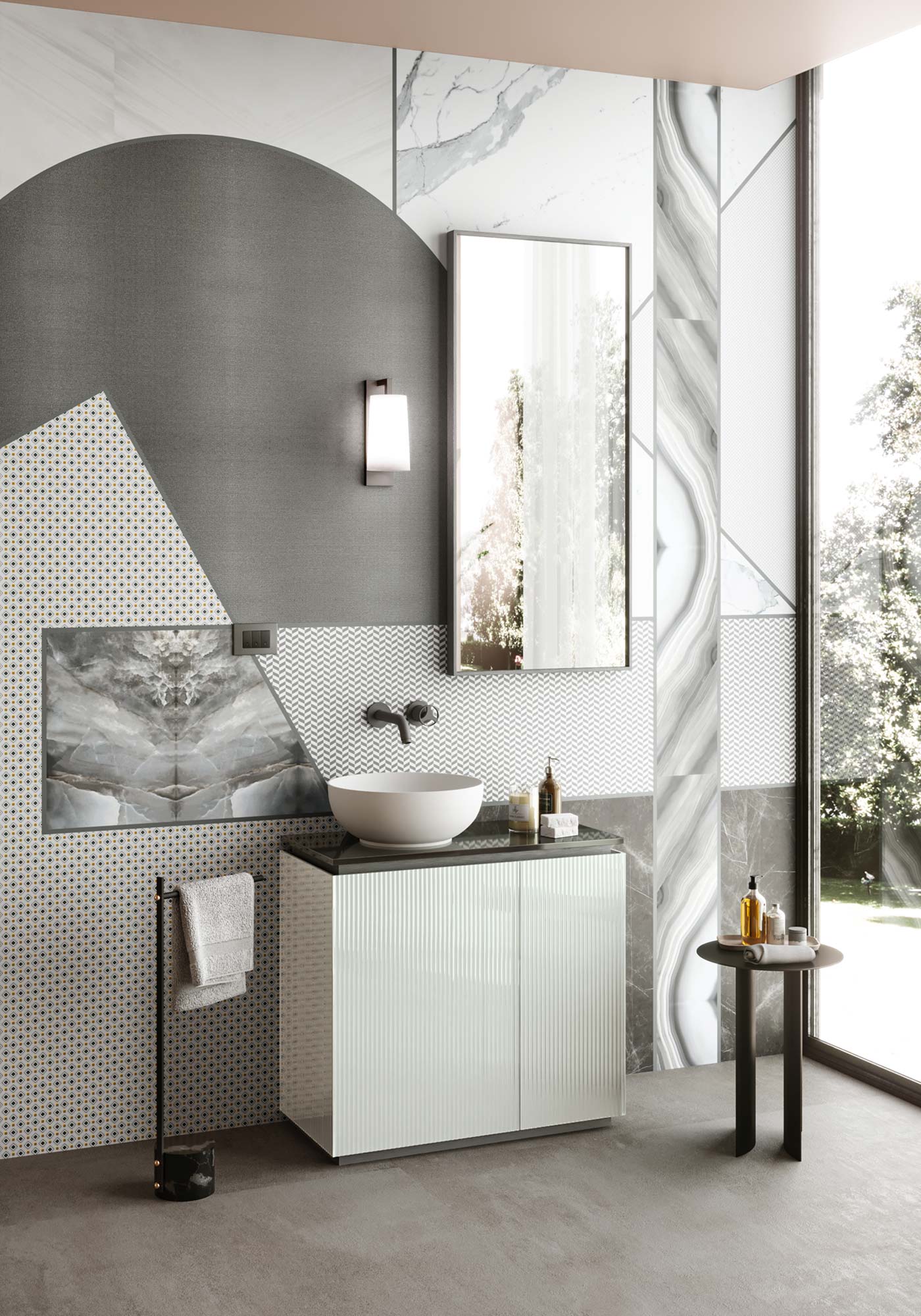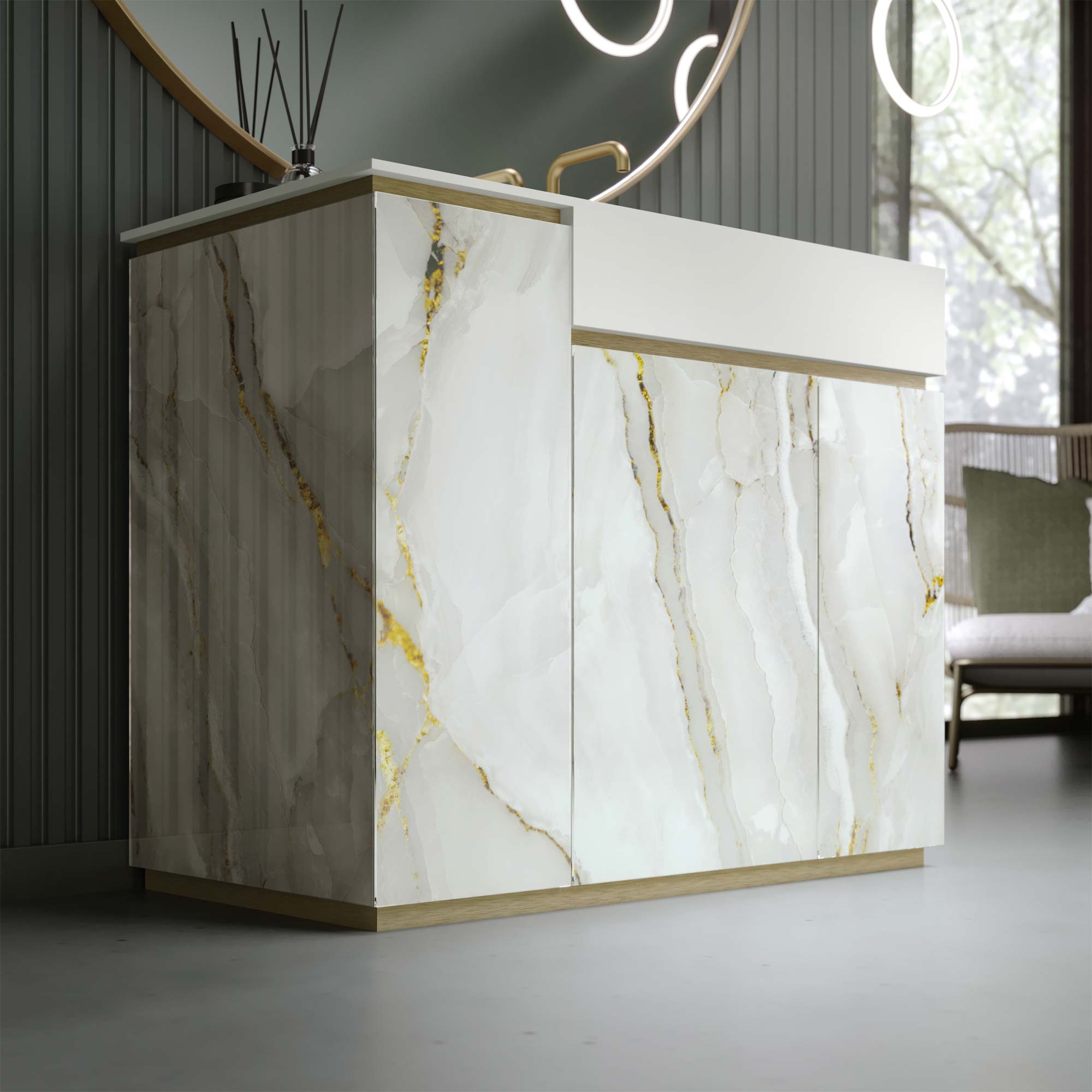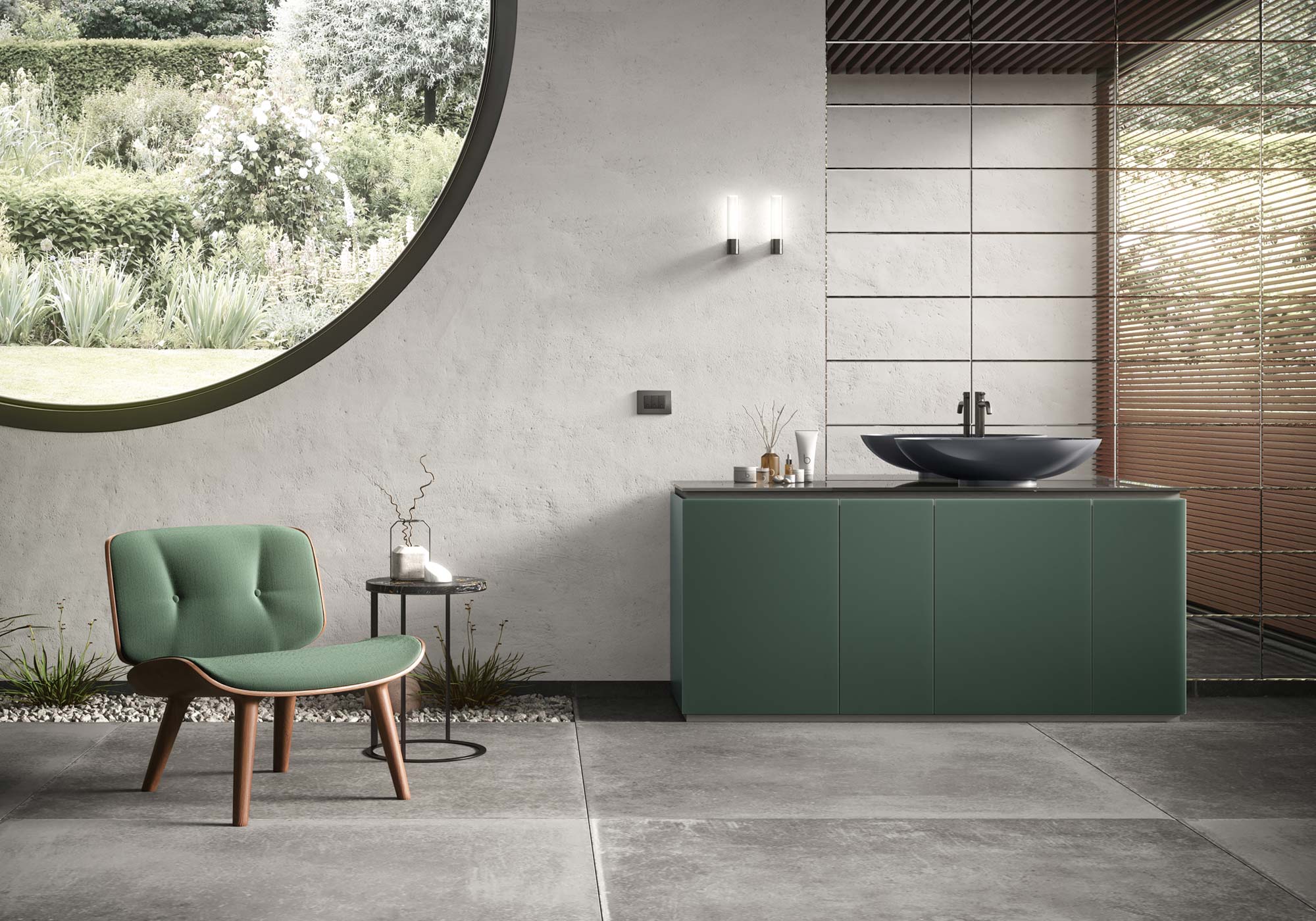 Meuble sous vasque posé au sol avec des formes simples et des lignes rigoureuses qui, même dans les dimensions les plus réduites, permet une bonne capacité de rangement. Le programme se développe avec des modules composables qui créent une modularité.
