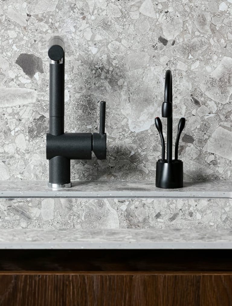 Inspirée de l’esthétique ornementale de la pierre Ceppo di Grè. Kone Mix est une solution en grès cérame qui restitue dans les espaces, le plus fidèlement possible, l’élégance intemporelle de la pierre lombarde , dans sa couleur classique gris clair et sous la forme décorative de grands cailloux.
