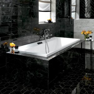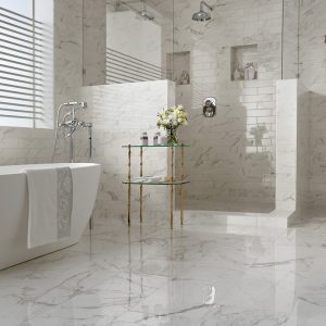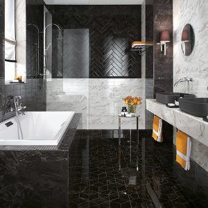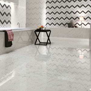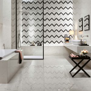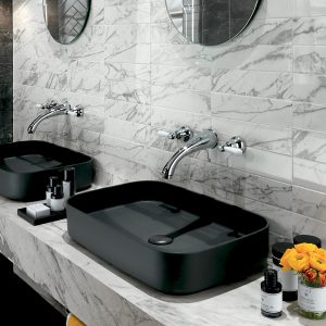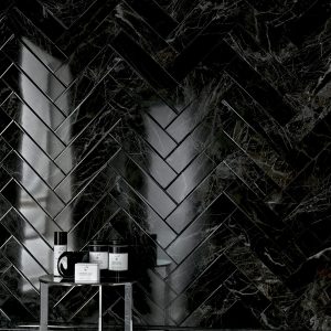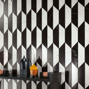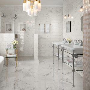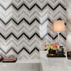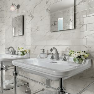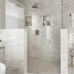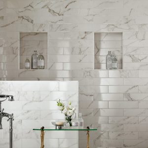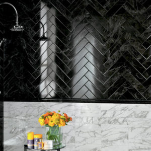Les carreaux Marble Brick au petit format 8 x 31,5 interprètent une decoration intérieure raffinée pour les murs de salle de bain, espace cuisine et lieux dédiés à la restauration, au shopping, et a l’accueil.