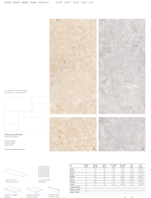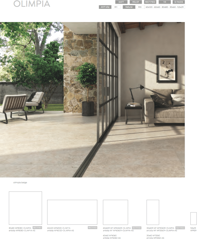 Cette série OLIMPIA a été créée avec l’effet du travertin naturel et vieilli, en conservant l’effet du passage du temps et la couleur d’origine, et en obtenant une série sobre et rustique pour des projets d’intérieur ou d’extérieur.