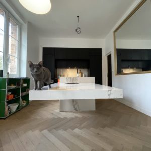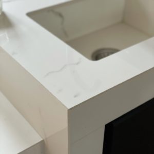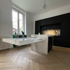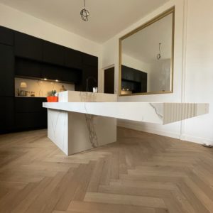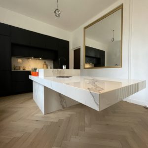 Nous vous présentons la réalisation (fourniture, façonnage & pose) d’un plan de travail avec un porte à faux de 140cm