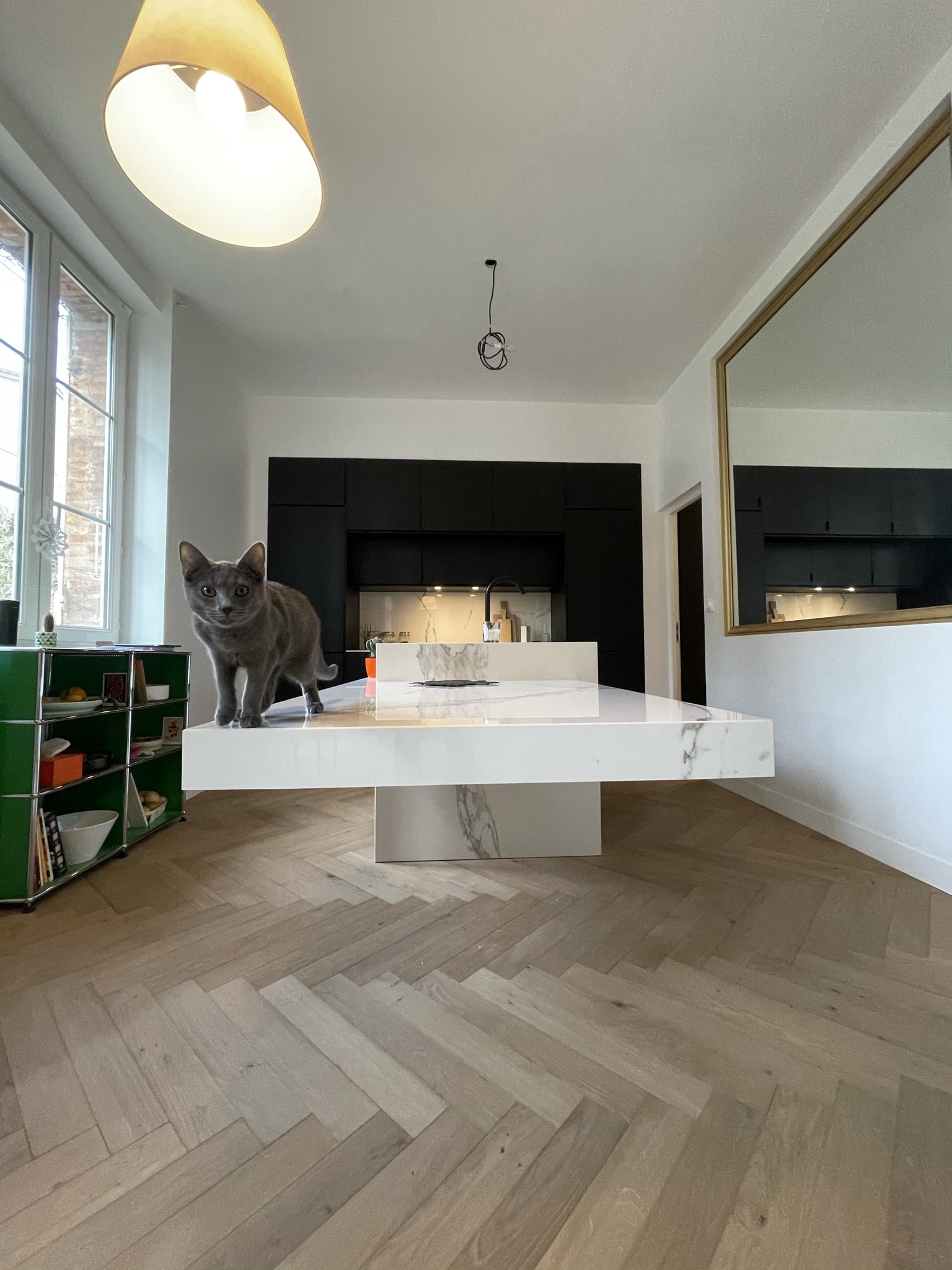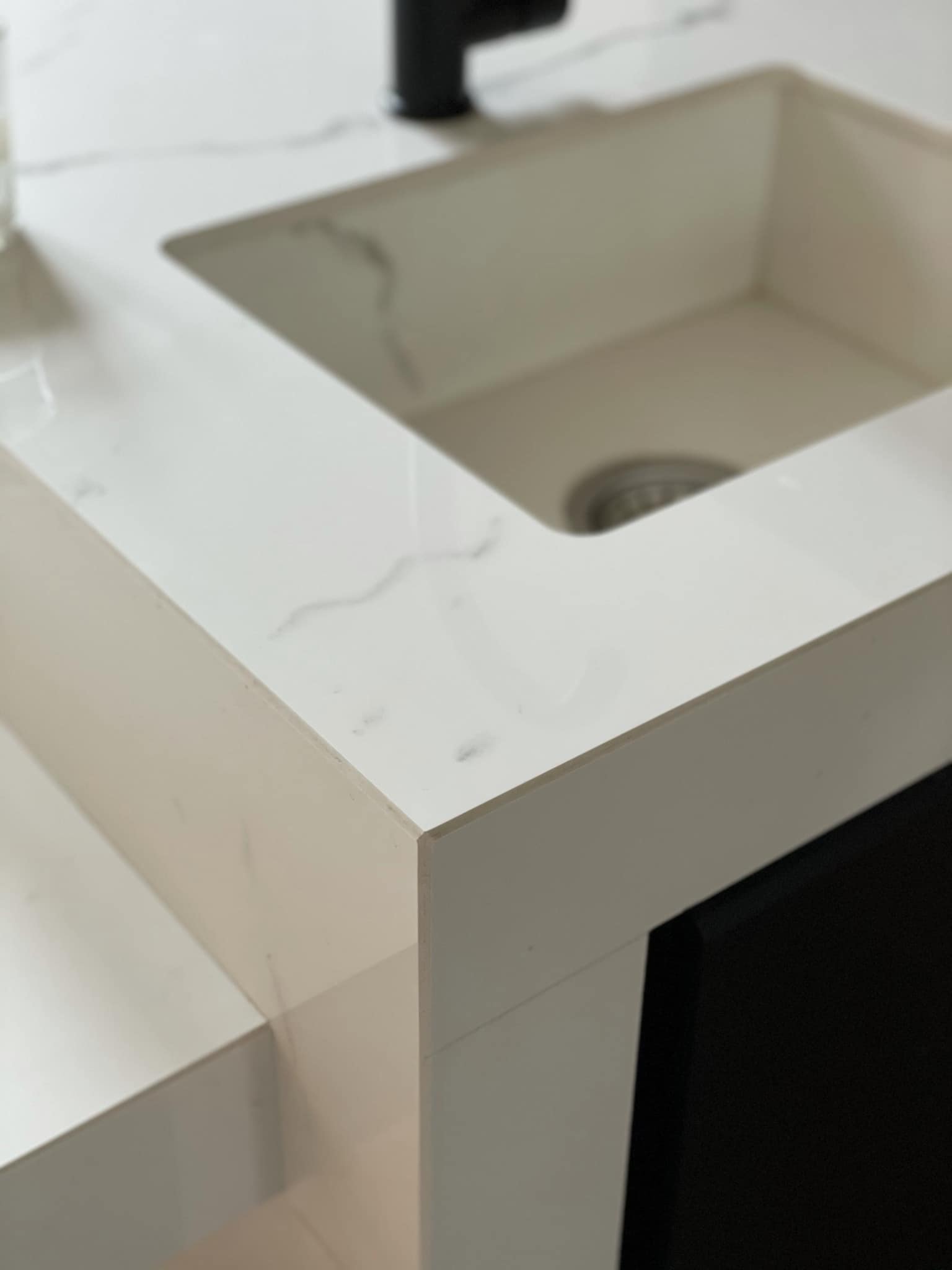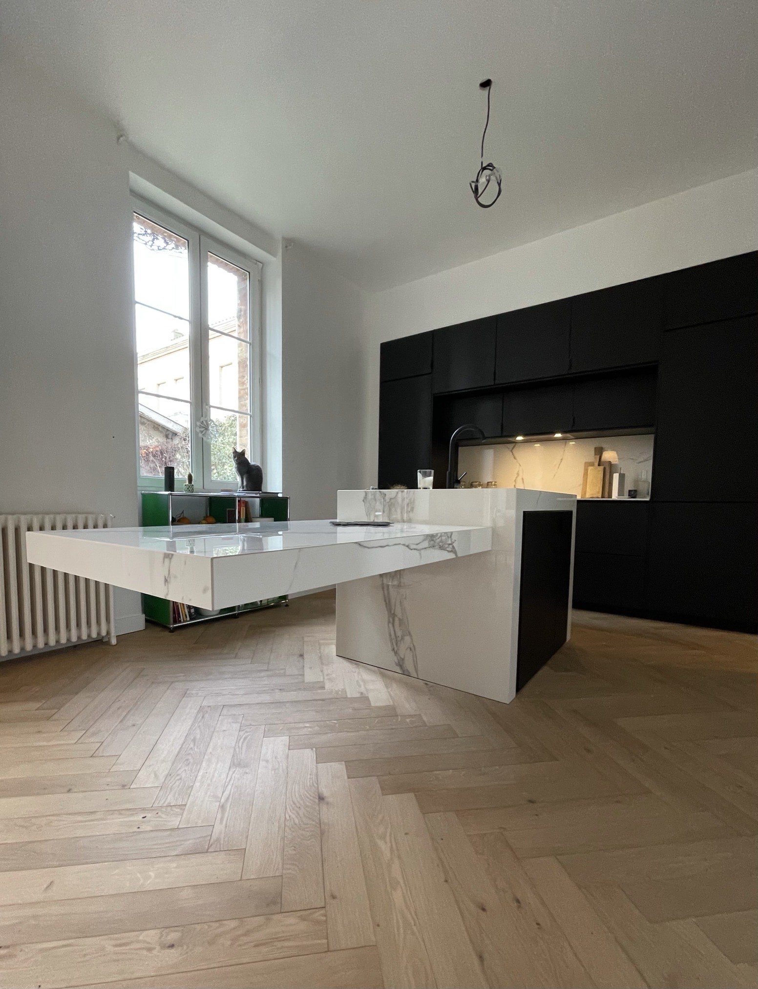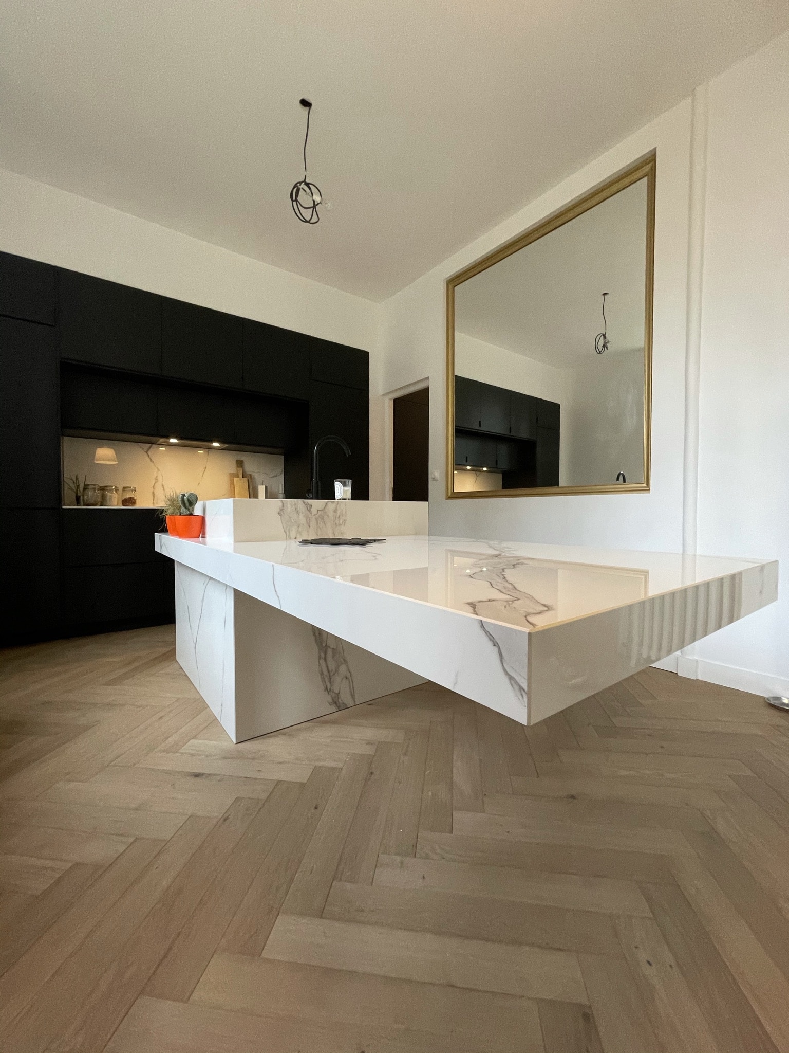 Nous vous présentons la réalisation (fourniture, façonnage & pose) d’un plan de travail avec un porte à faux de 140cm