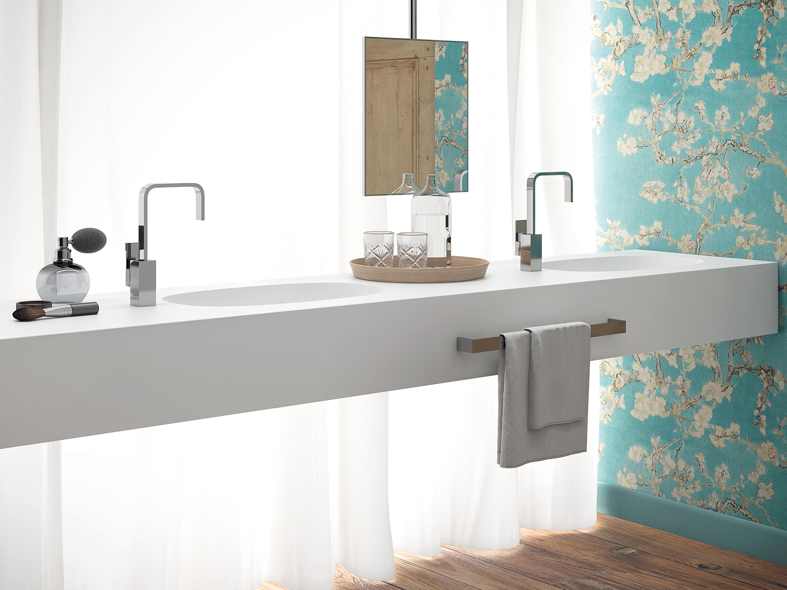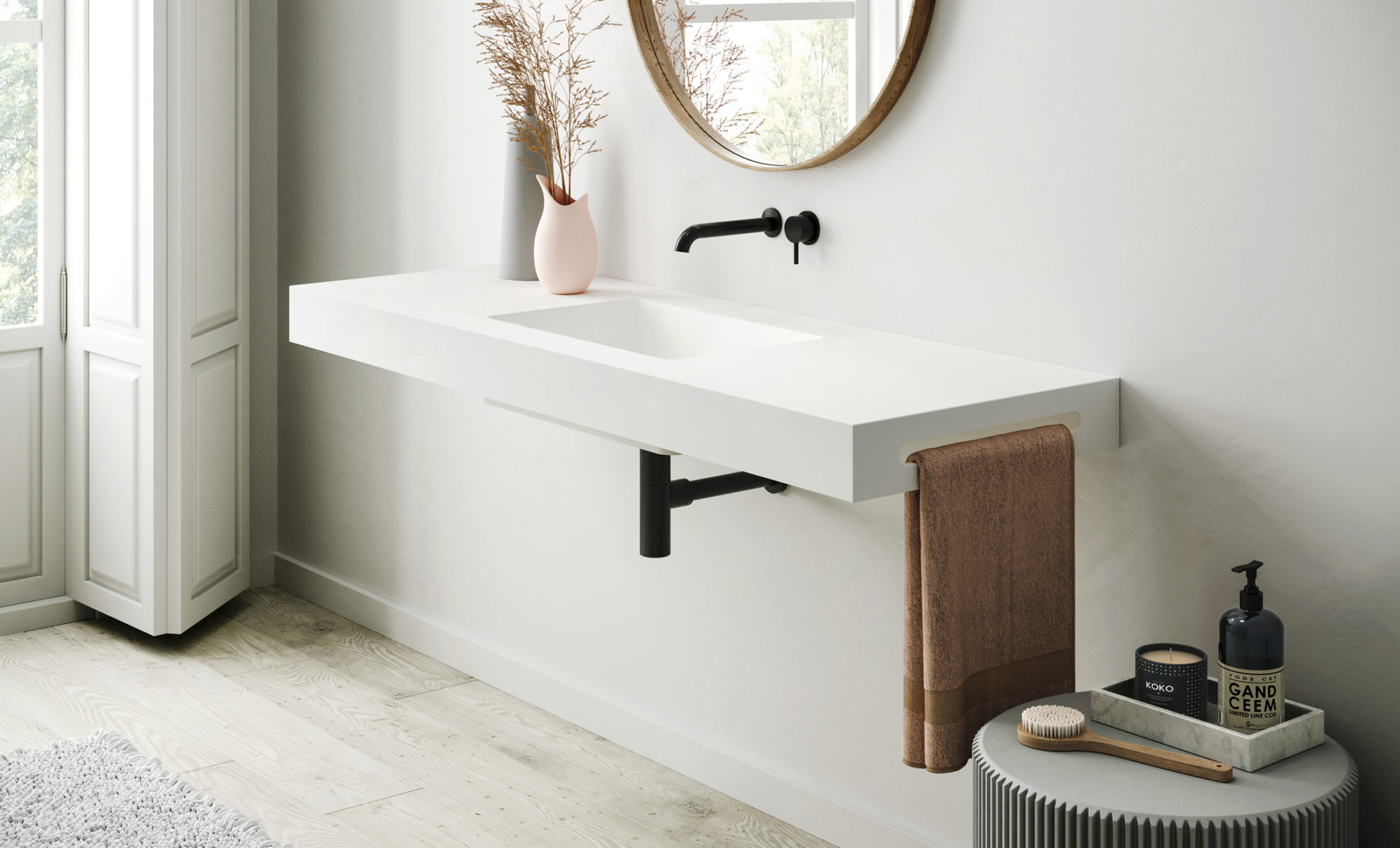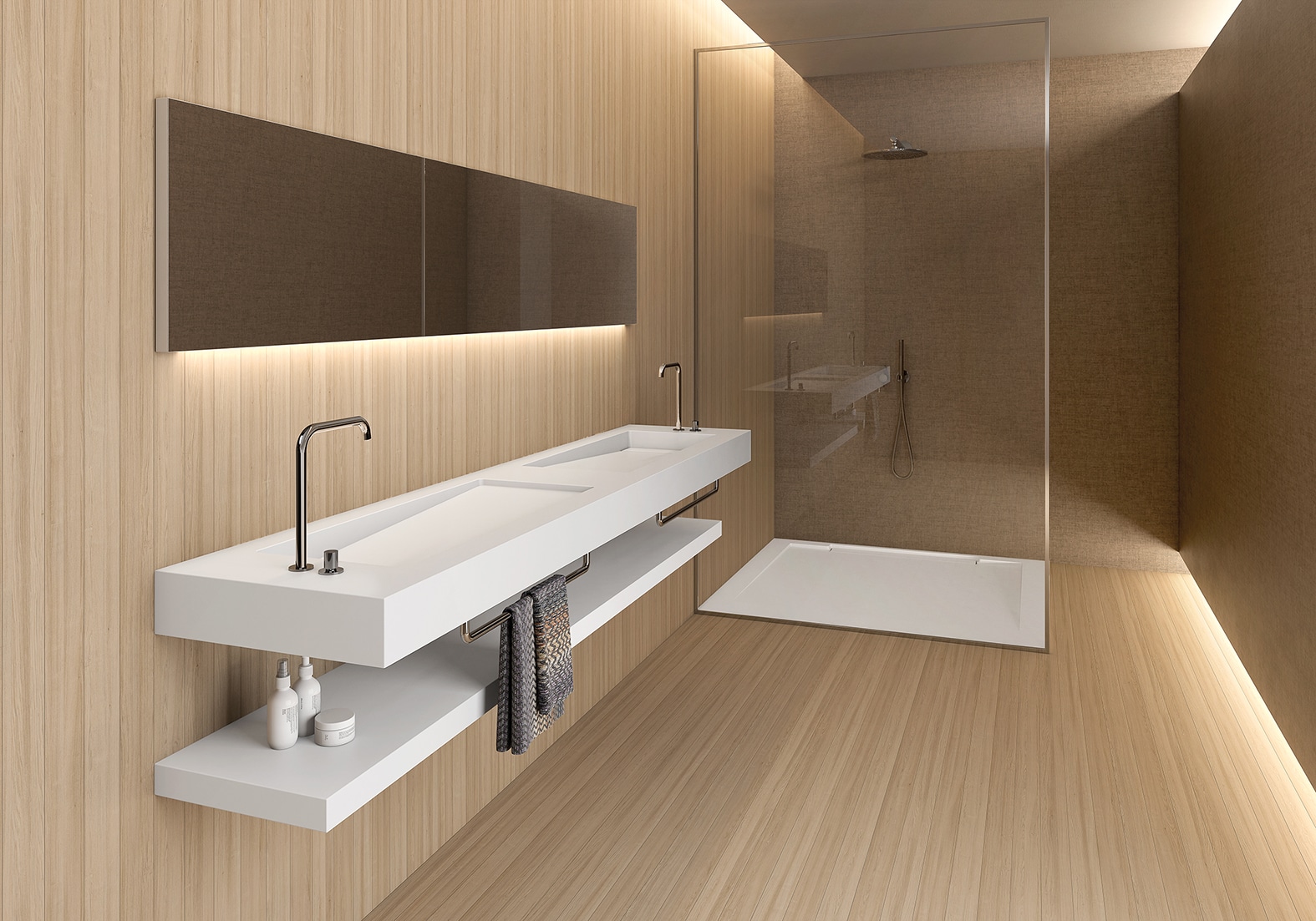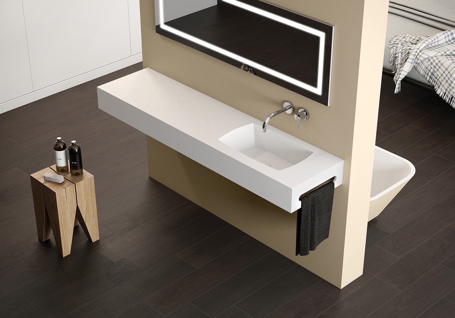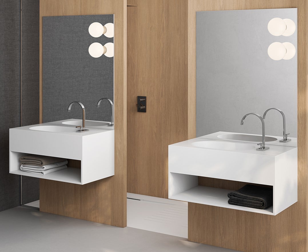 La collection Program a été développée afin d’offrir un grand éventail de possibilités pour designer votre plan vasque. Chaque pièce se prépare et se développe de façon individuelle, en partant choisissant largueur et longueur,il y a le choix parmi 22 modèles de vasque, son emplacement et les accessoires pour le personnaliser. Les plans vasques Program sont fabriquées en matière Scene® blanc en texture lisse ou ardoise, et finition mat