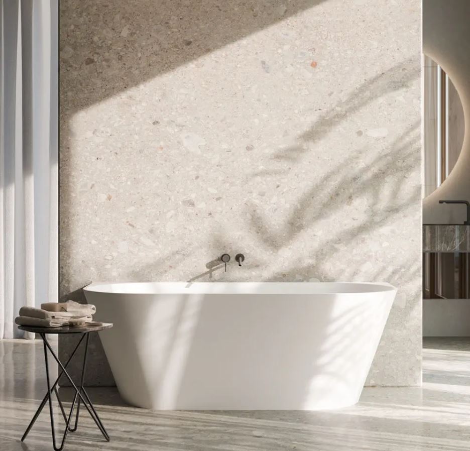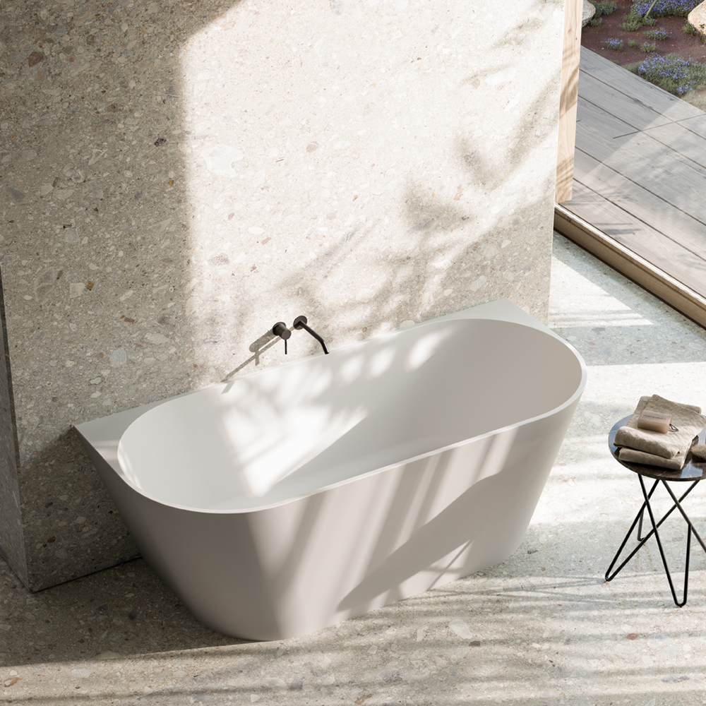 Formes douces et arrondies pour cette baignoire en MineraLIte blanc mat qui s’installe au mur.