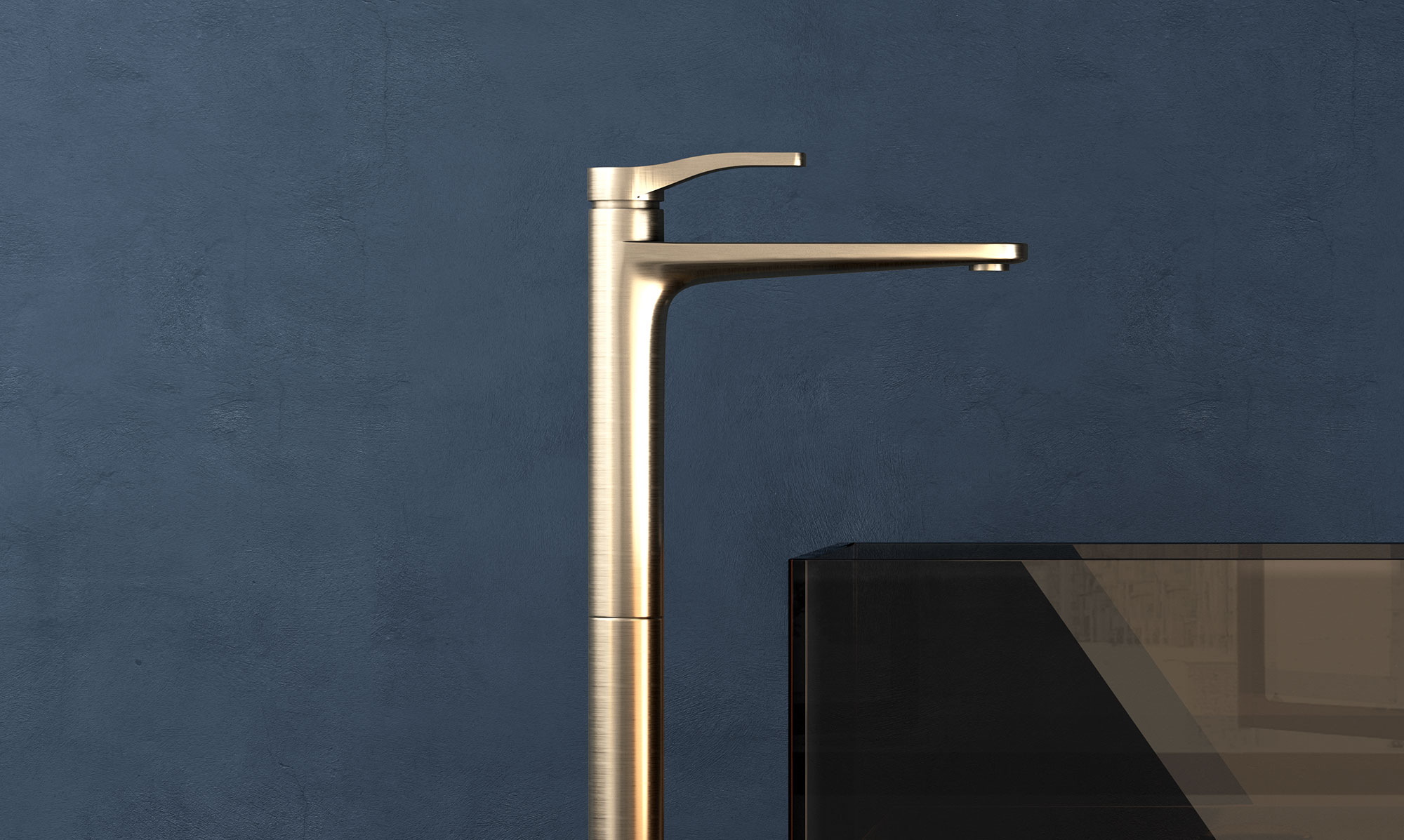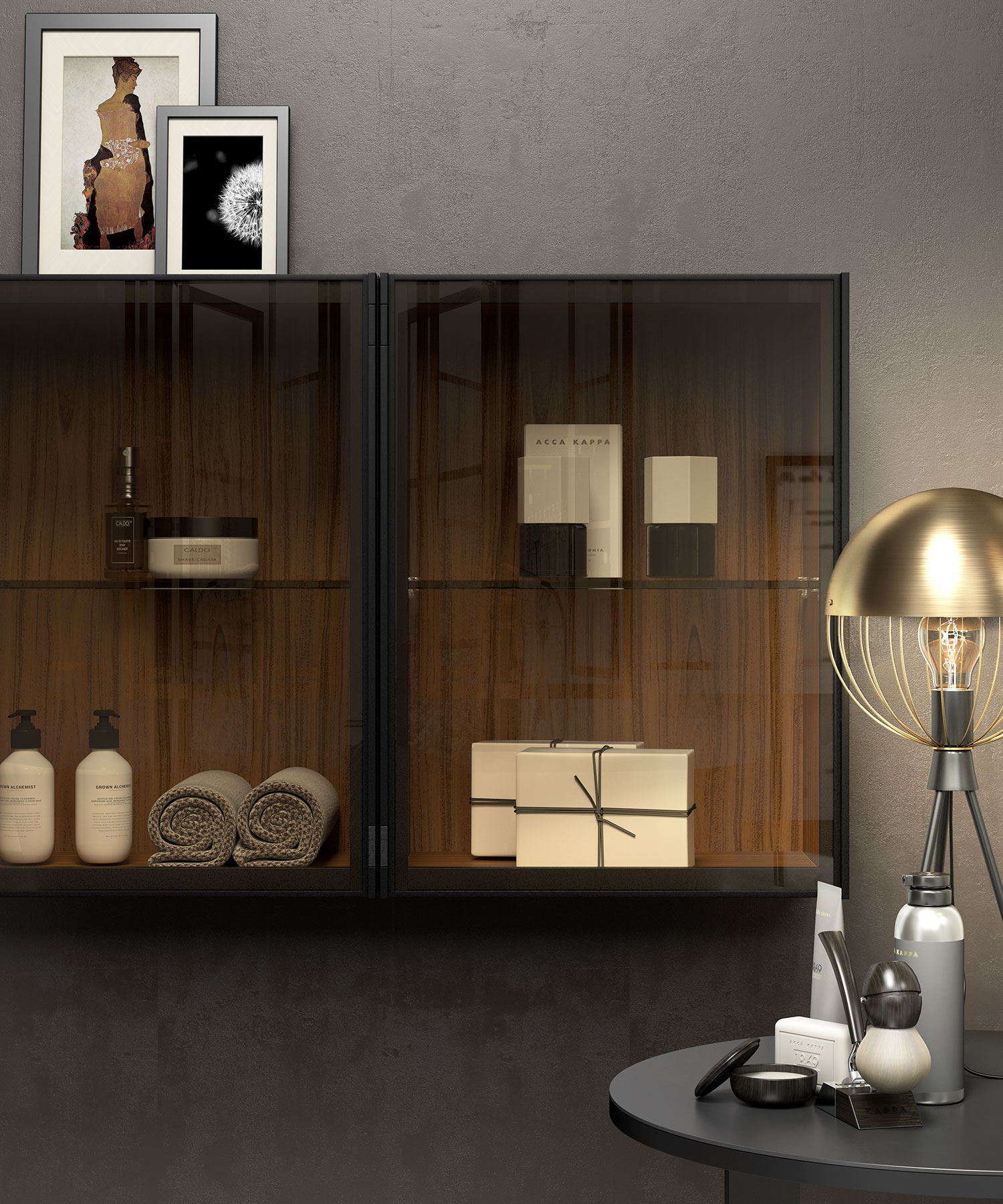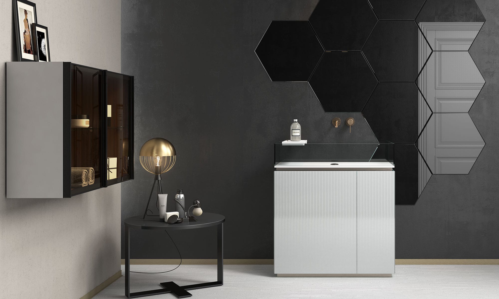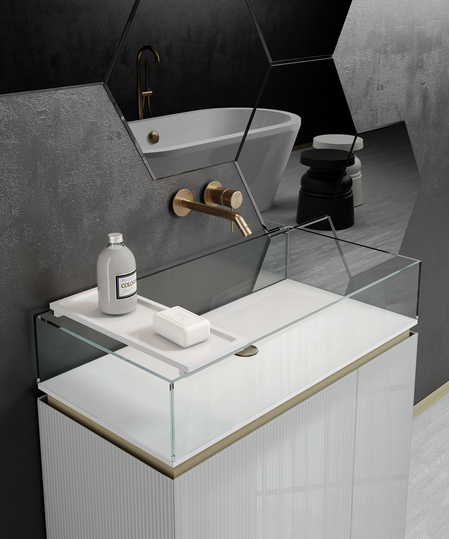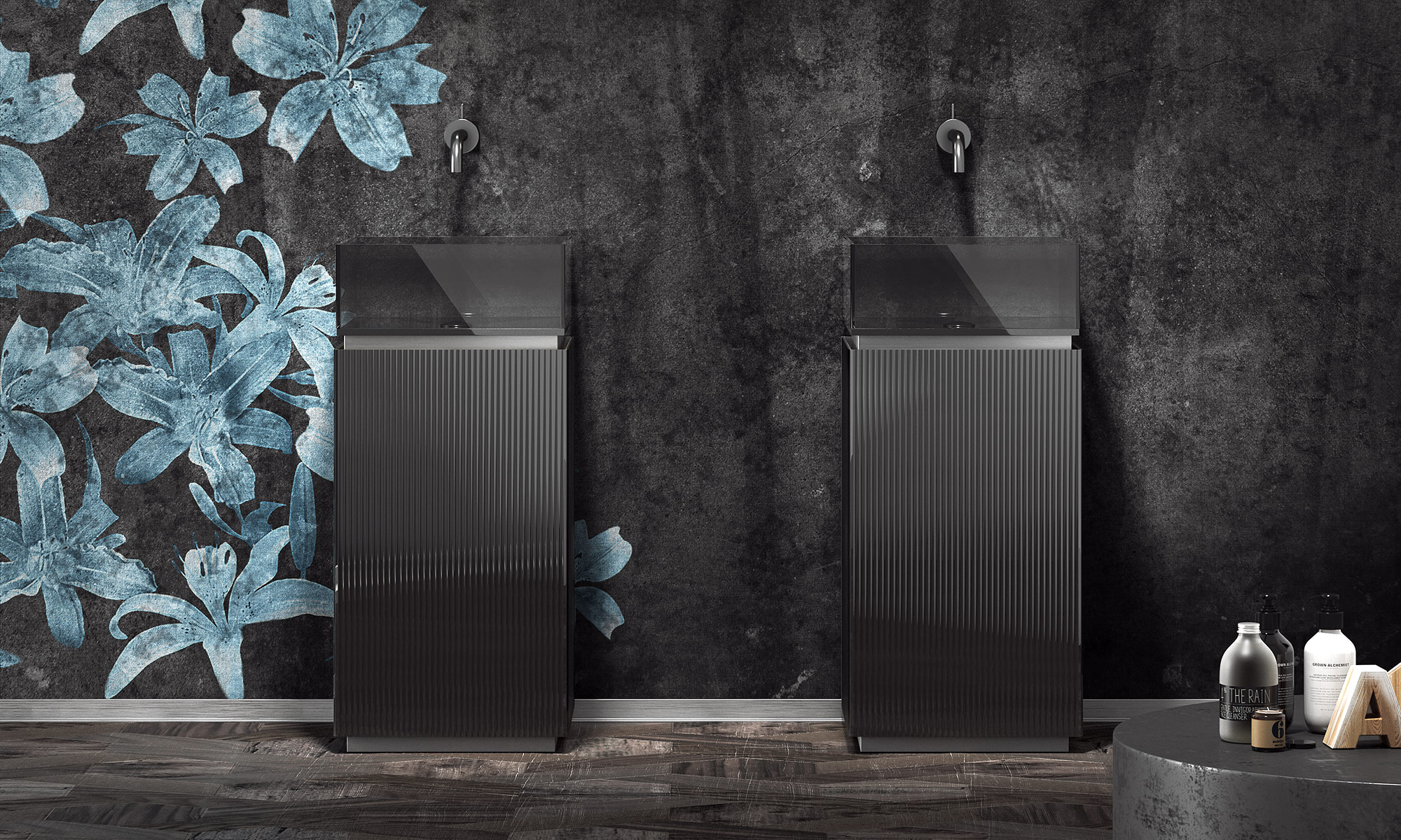 La collection Plisse est une synthèse de la rigueur formelle et de l’élégance de la matière, cette gamme donne vie à une série de vasques totem avec rangement, totalement réalisées en verre et inserts métallisés.