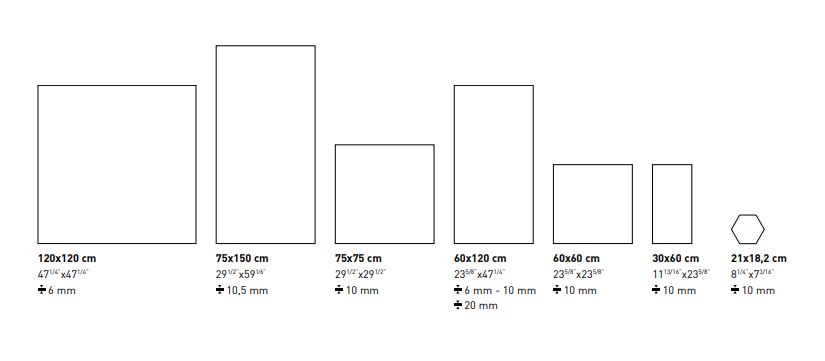 épaisseur 10mm : 21×18.2 – 30X60 –  60×60 –  60×120 – 75×75 – 75×150