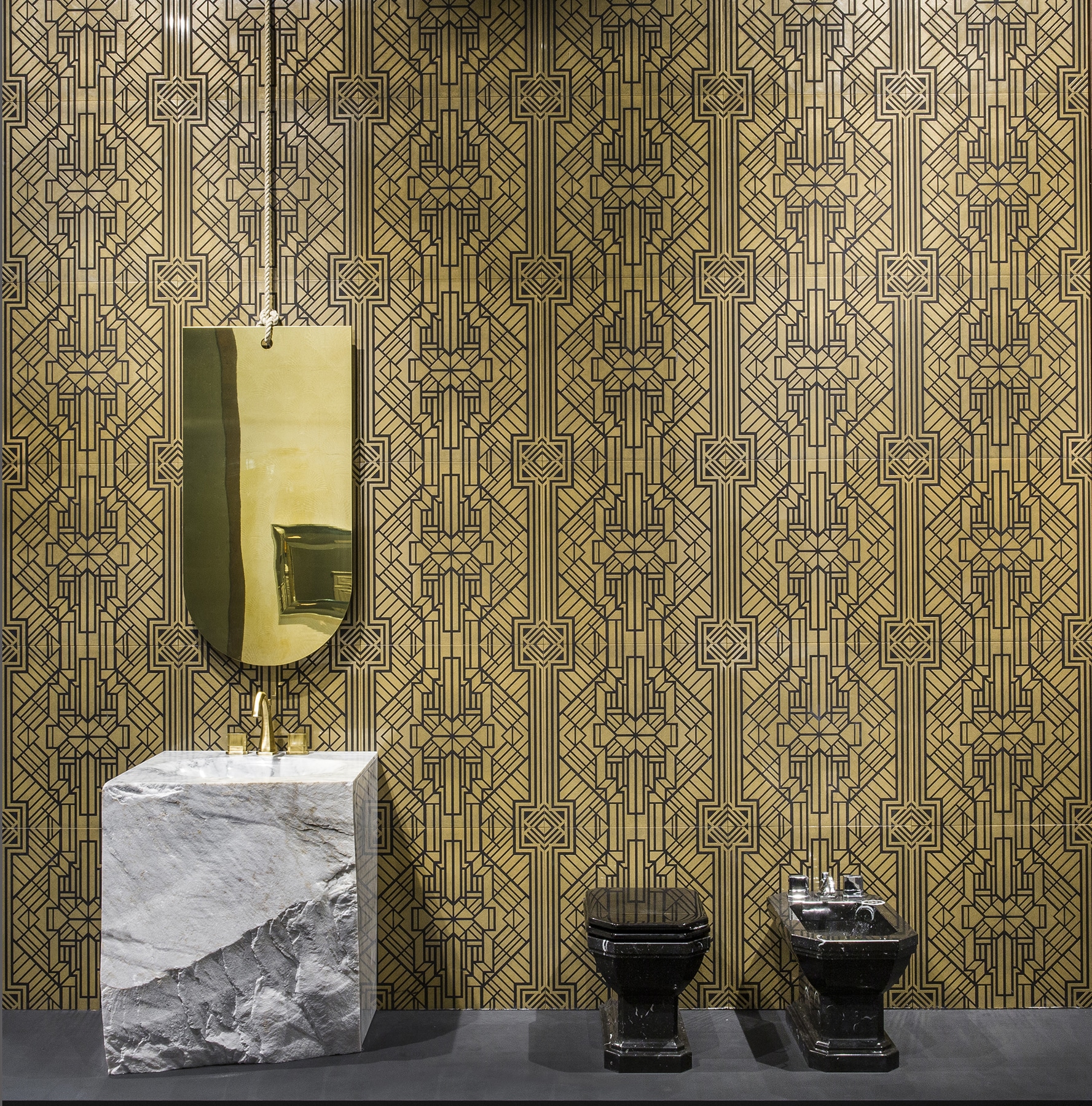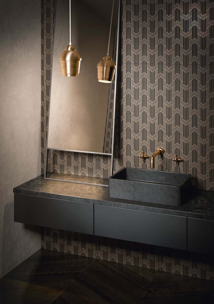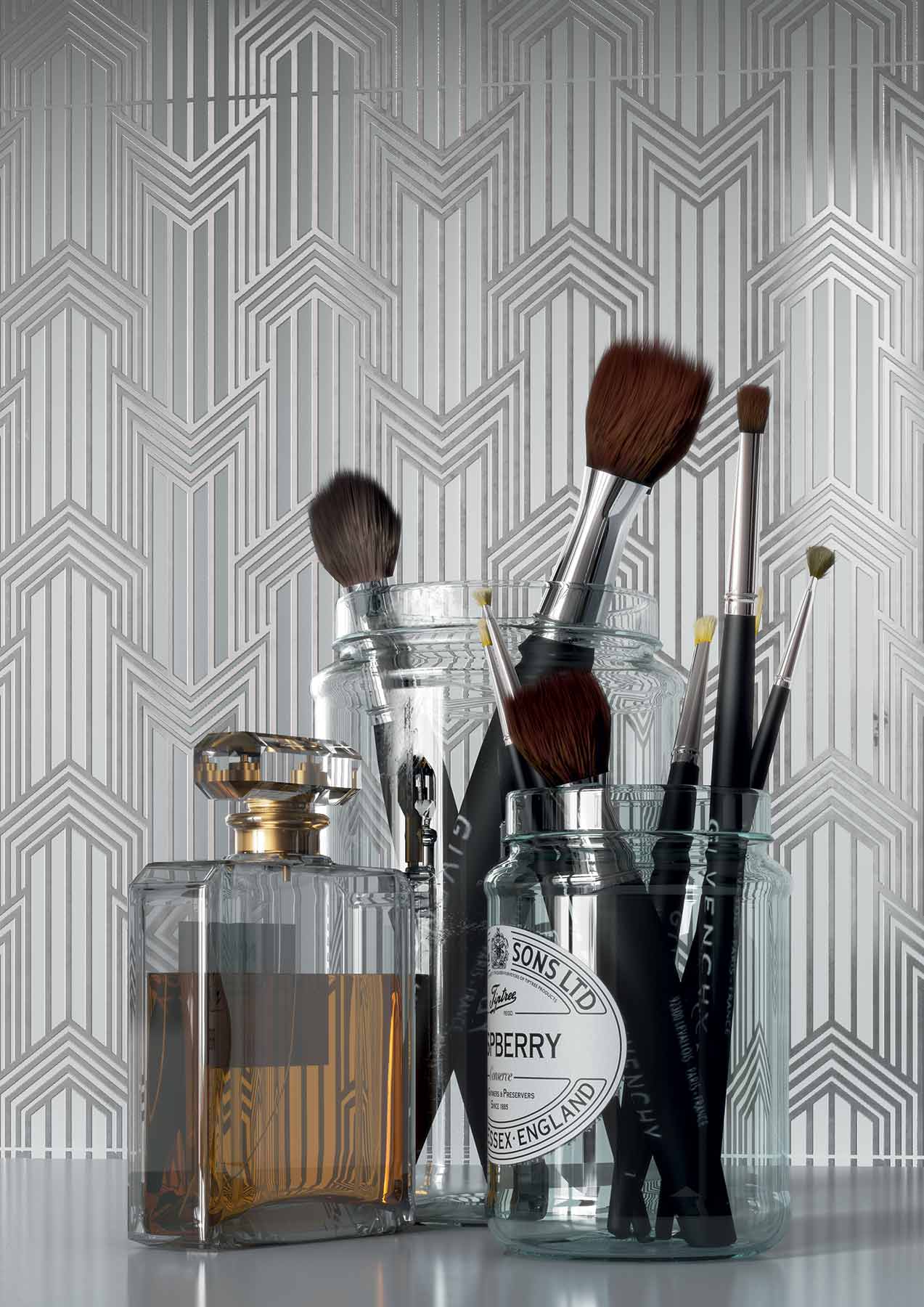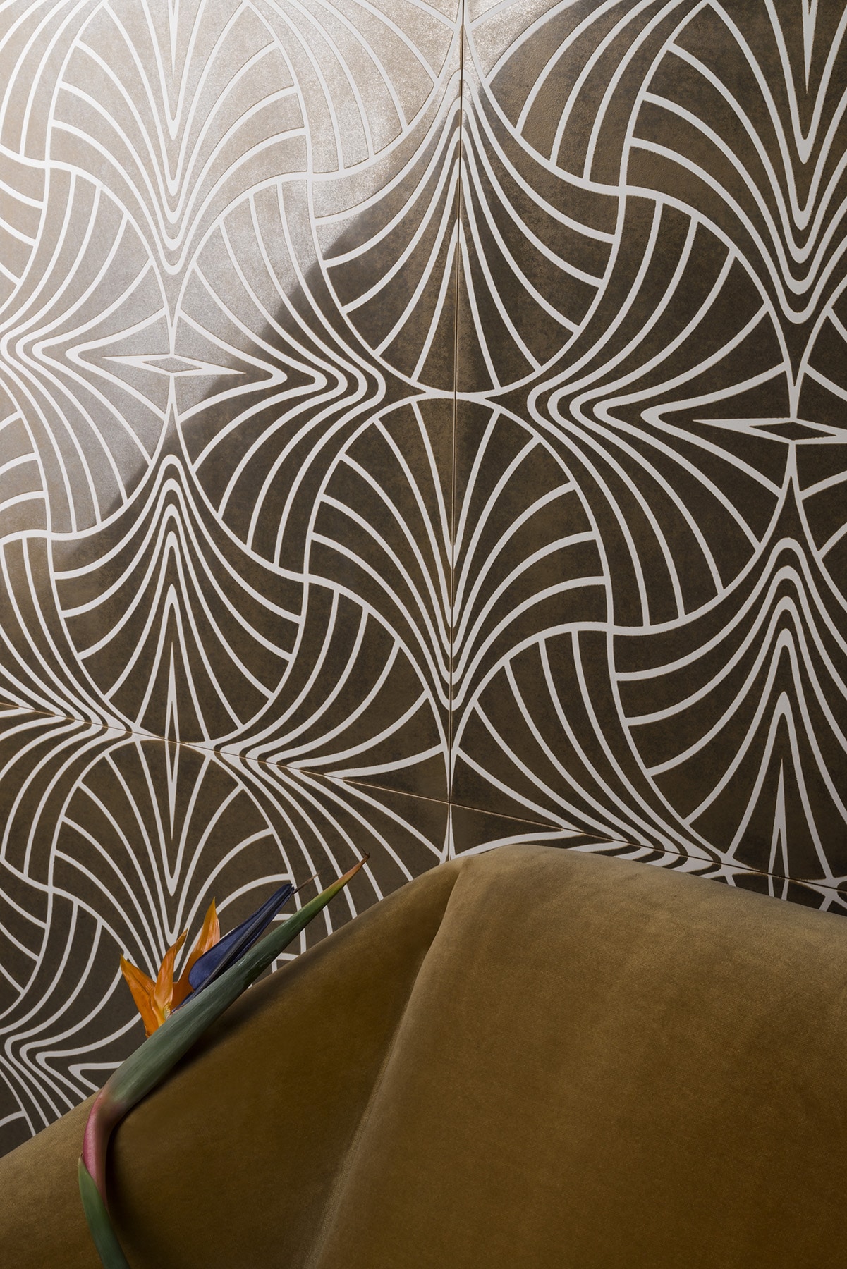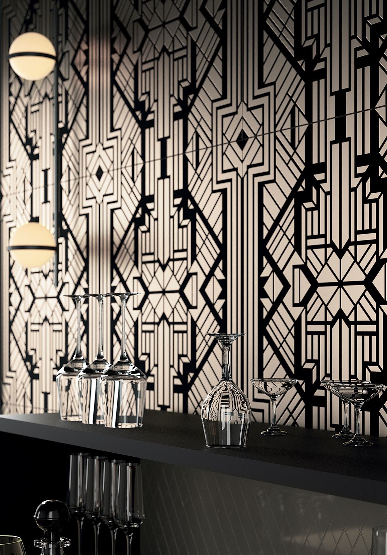 Énergie, vitalité, insouciance : les thèmes décoratifs de l’Art déco inspirent une harmonie de géométries et de couleurs. Une immersion totale, un retour à l’époque du Grand Gatsby, décliné dans les 4 décors des céramiques swing : Labyrinthe et Géométrie, aux lignes droites et rigoureuses, plume et paon, avec la douceur de leurs lignes arrondies. Disponibles en 6 combinaisons de couleurs, des classiques et élégants blanc sur blanc et noir sur noir, aux précieux tresses de laiton et du sterling silver sur noir ou blanc.