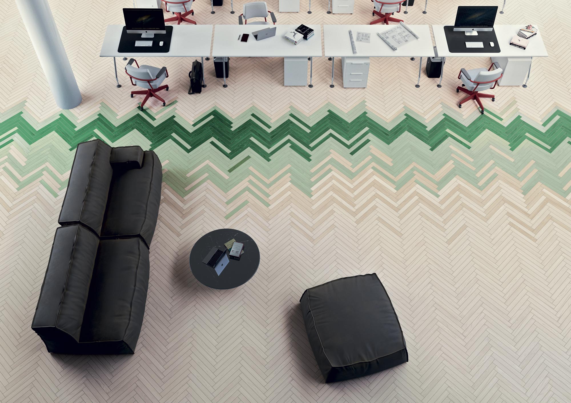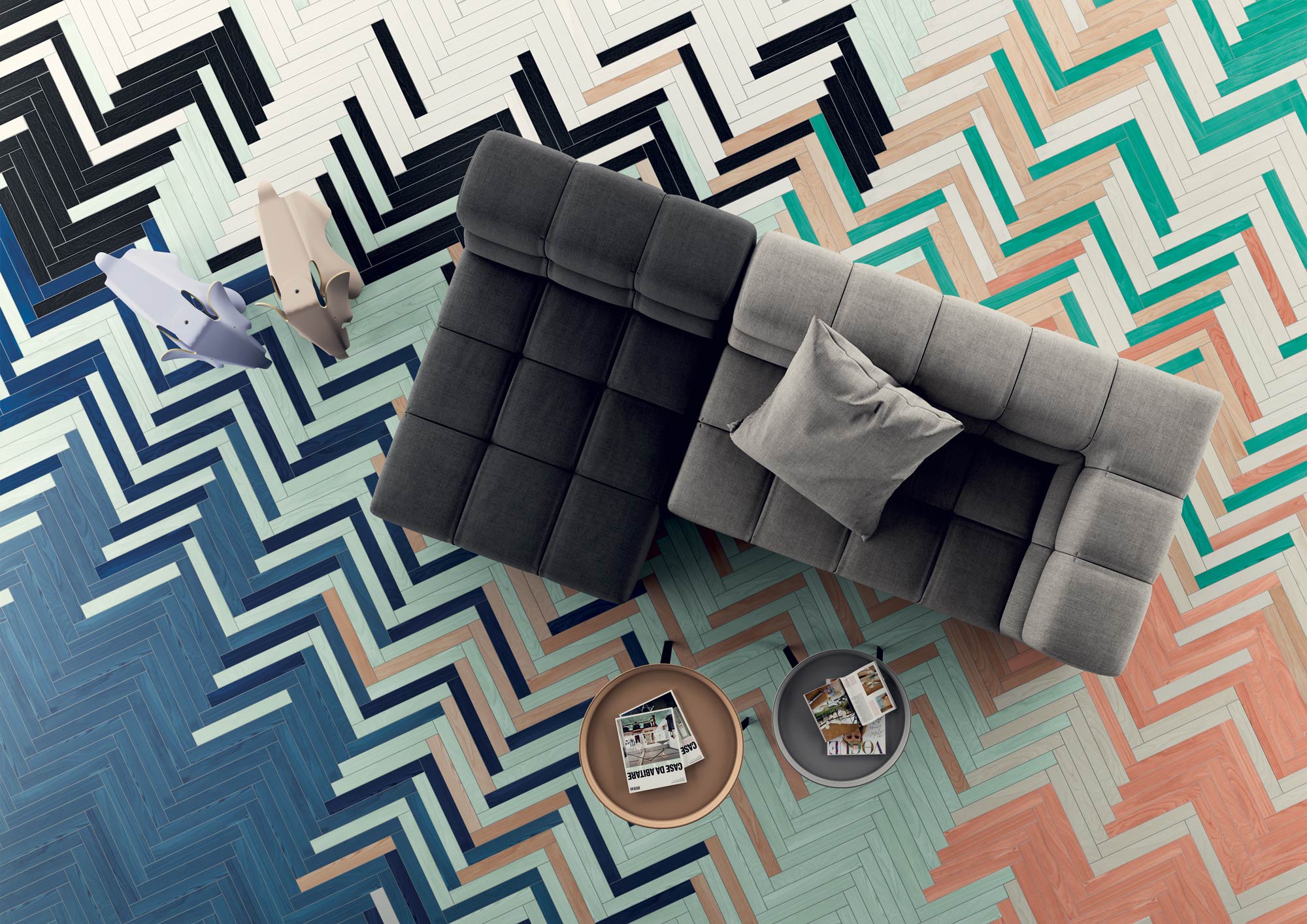 Technicolor est un produit industriel qui naît sur la base d’un mélange de onze essences de bois différentes. Trois tons neutres, Blanc, beige et Noir, 15 couleurs vives, un Blanc et un Noir purs. L’idée qui inspire ce programme entier est basé sur un bois de récupération, la collection reproduit un matériau qui donne une perception typique d’un produit artisanal. On le remarque par : un ombrage irrégulier, quelques différences de calibre à l’intérieur de la même boîte, des bords différents qui suivent les imperfections typiques du bois et des structures différentes. Point de force est la couleur qui permet une interprétation libre et multiple.
