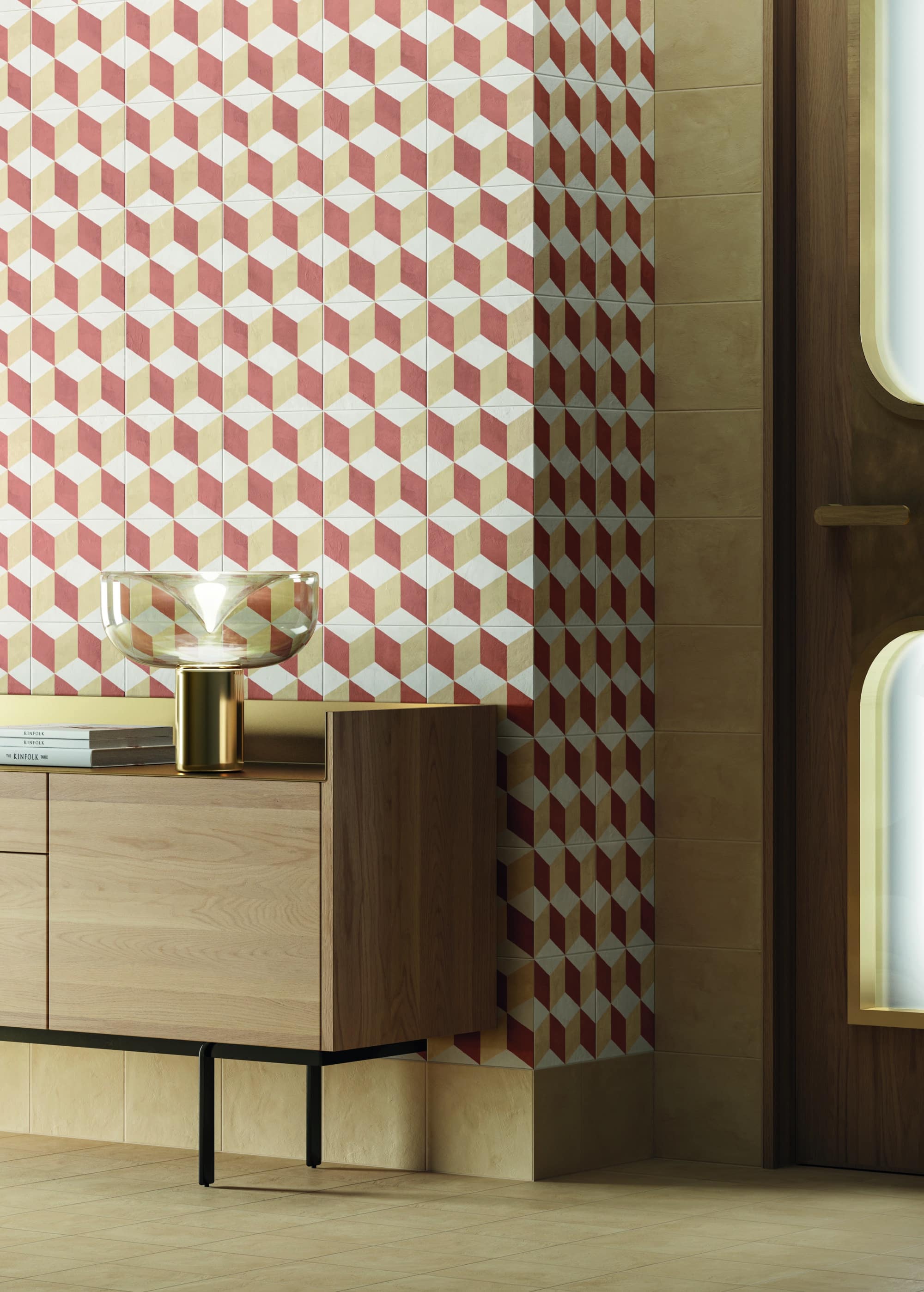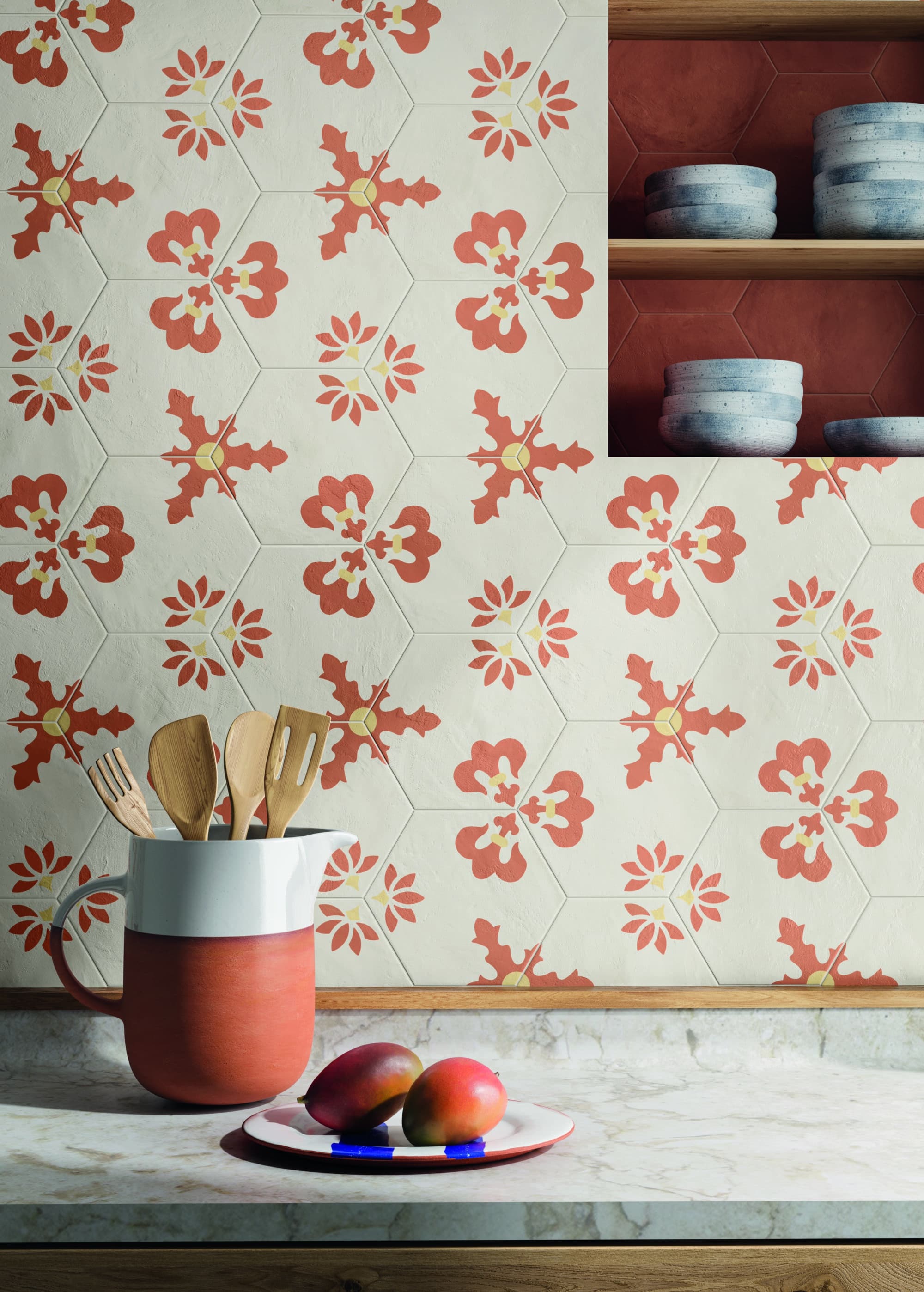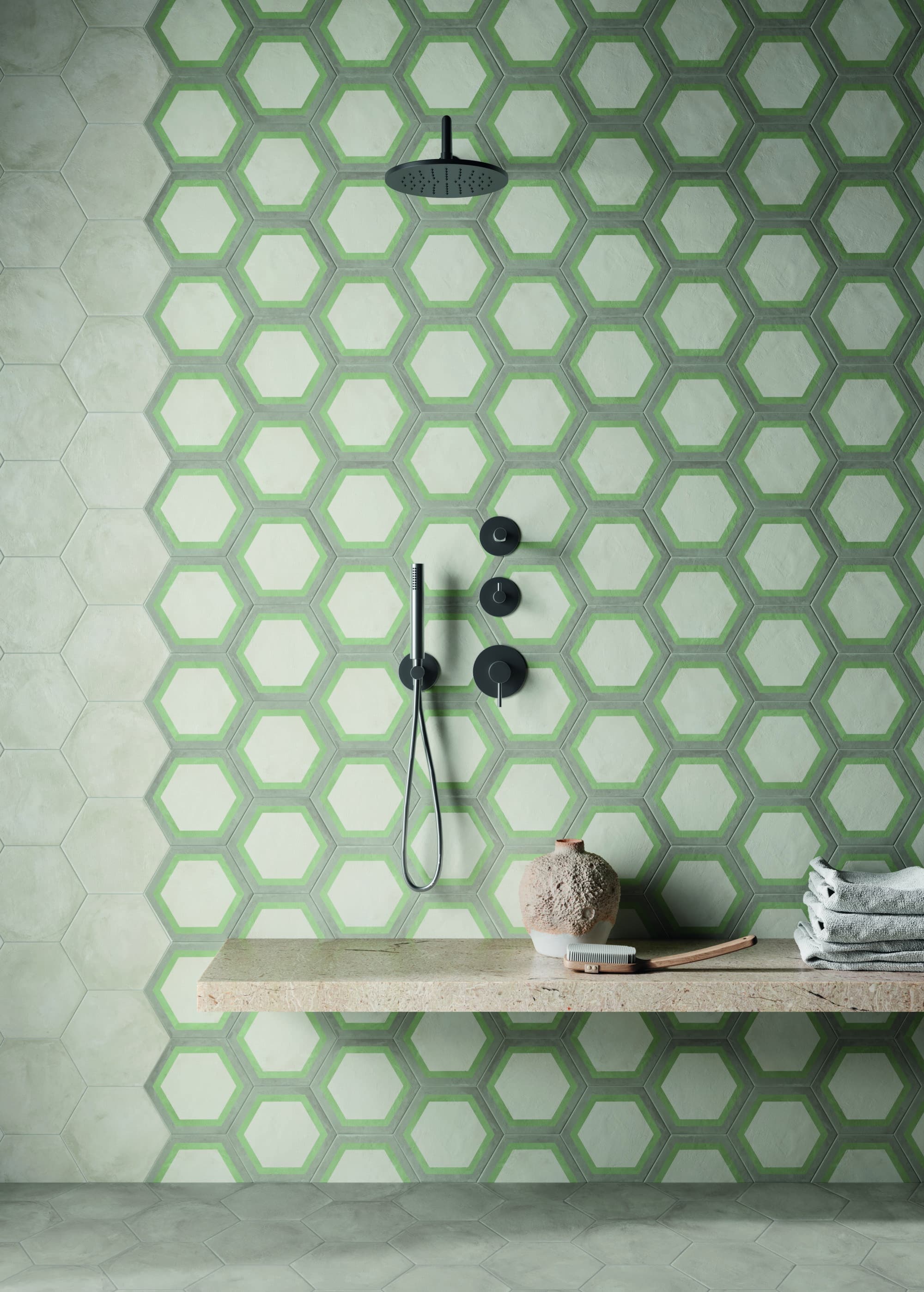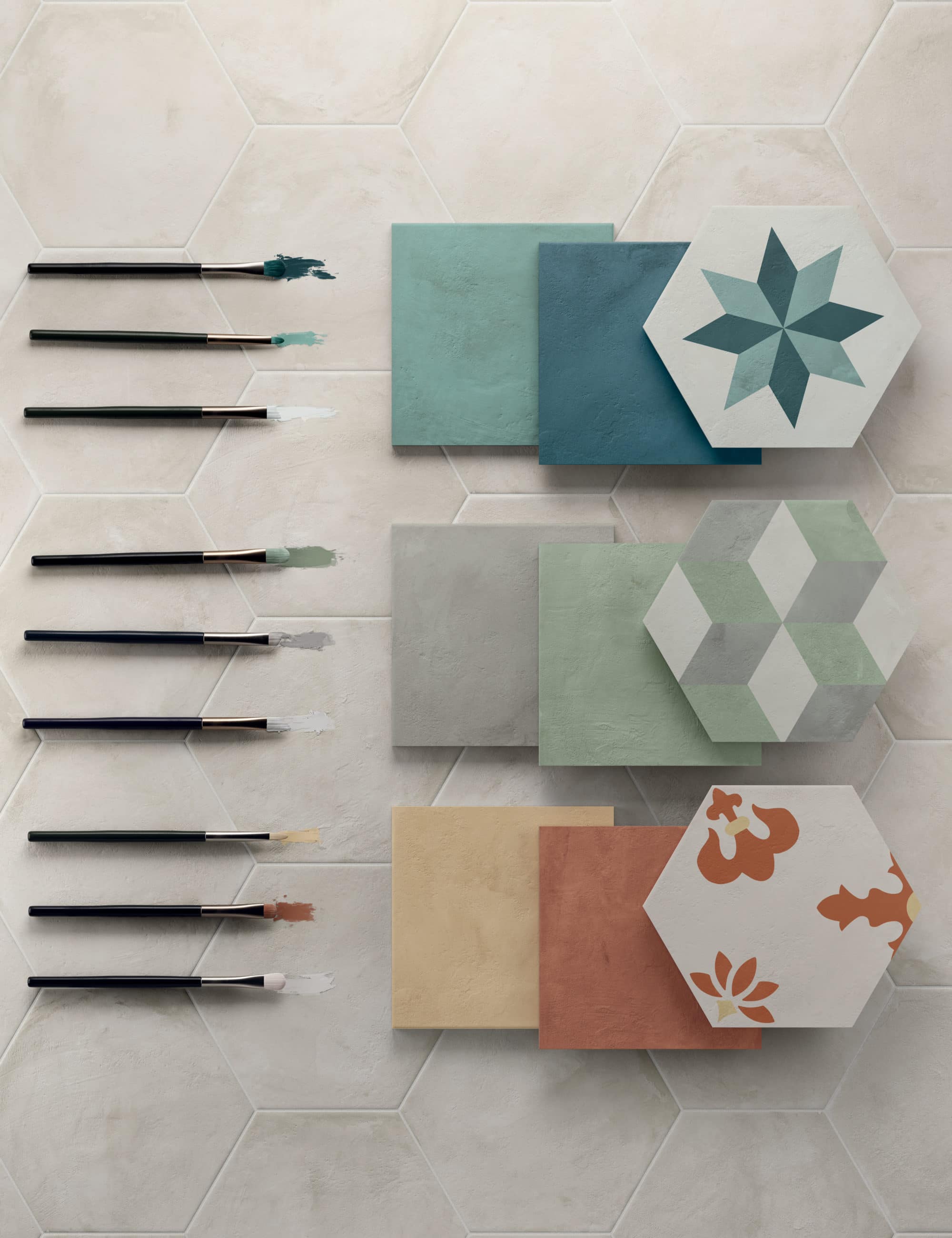 Une série en grès cérame, disponible en format hexagonal moderne 25×21,6 et en classique 20×20.