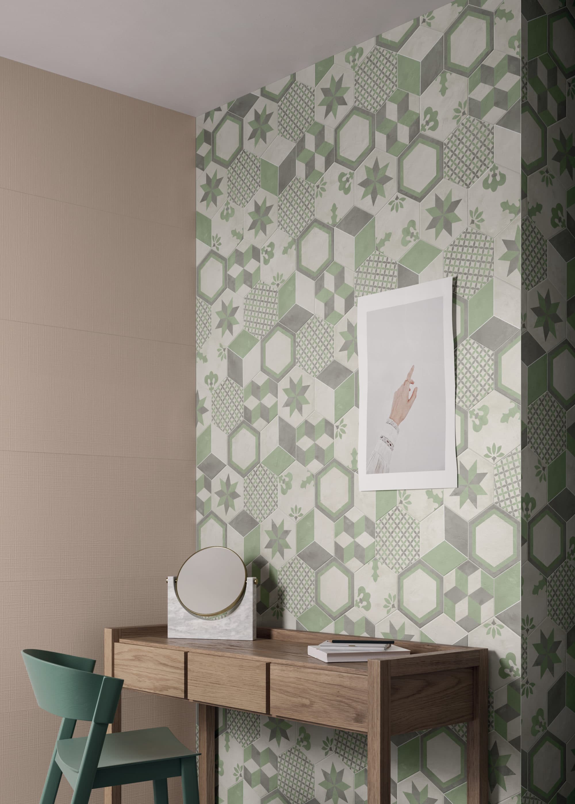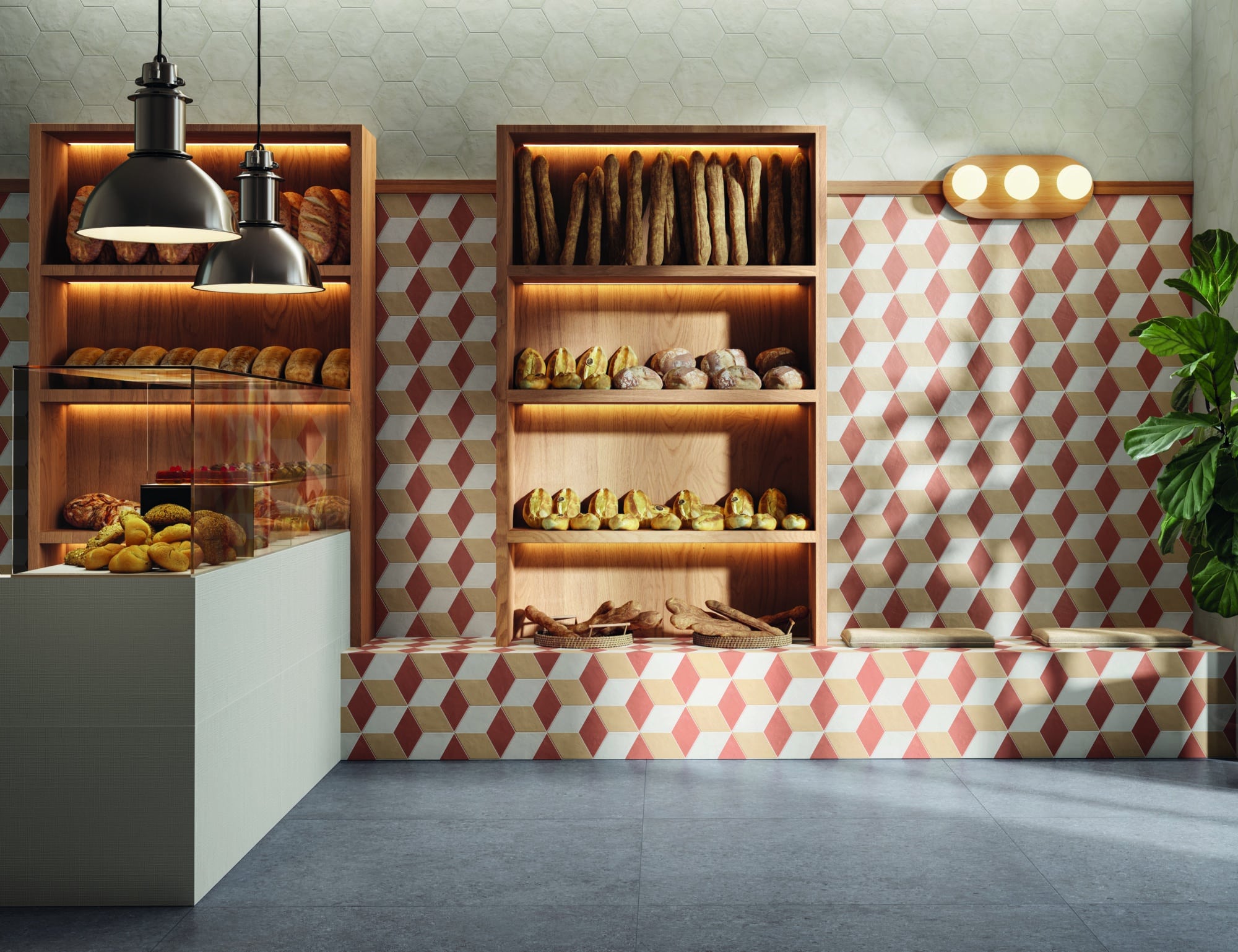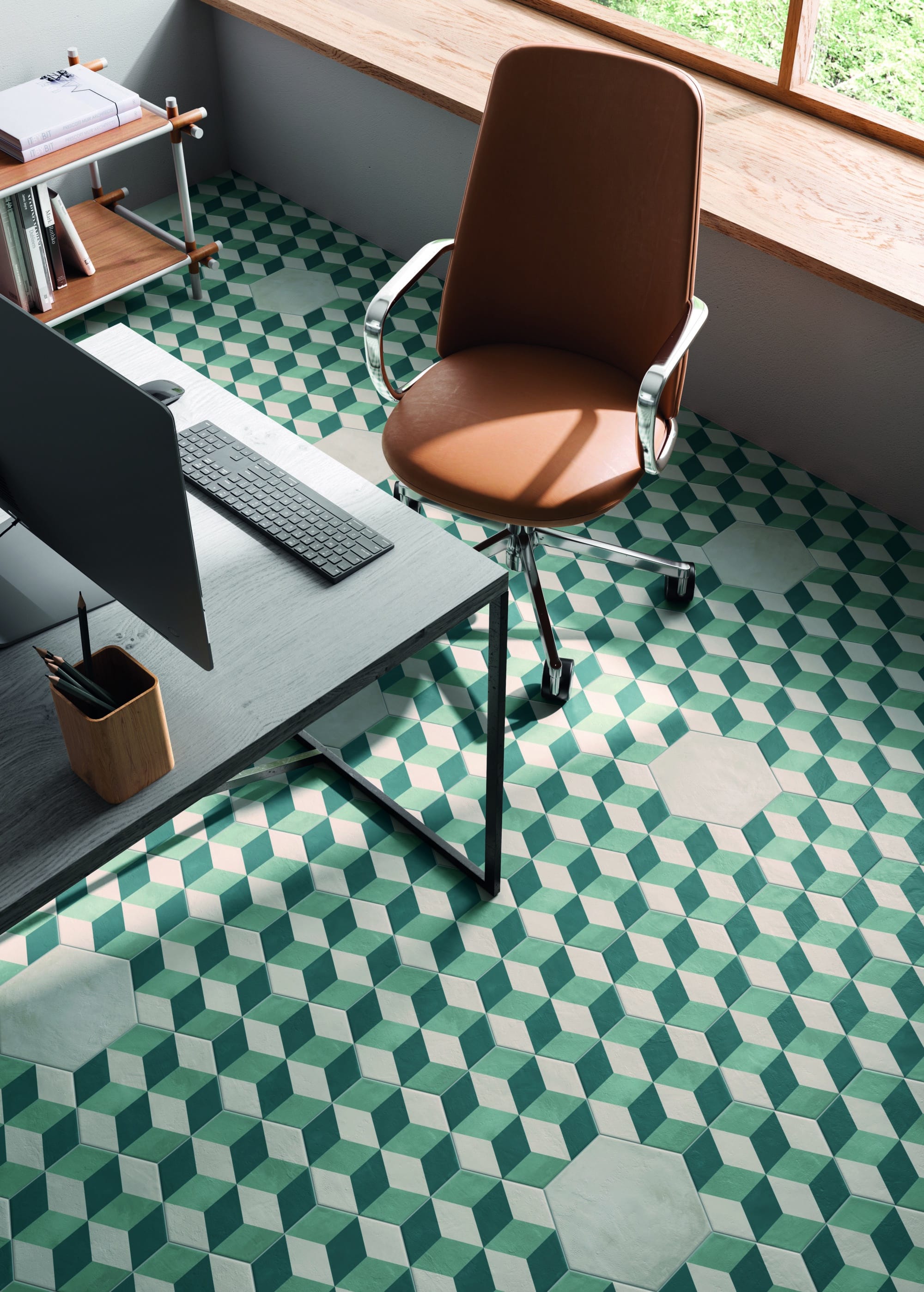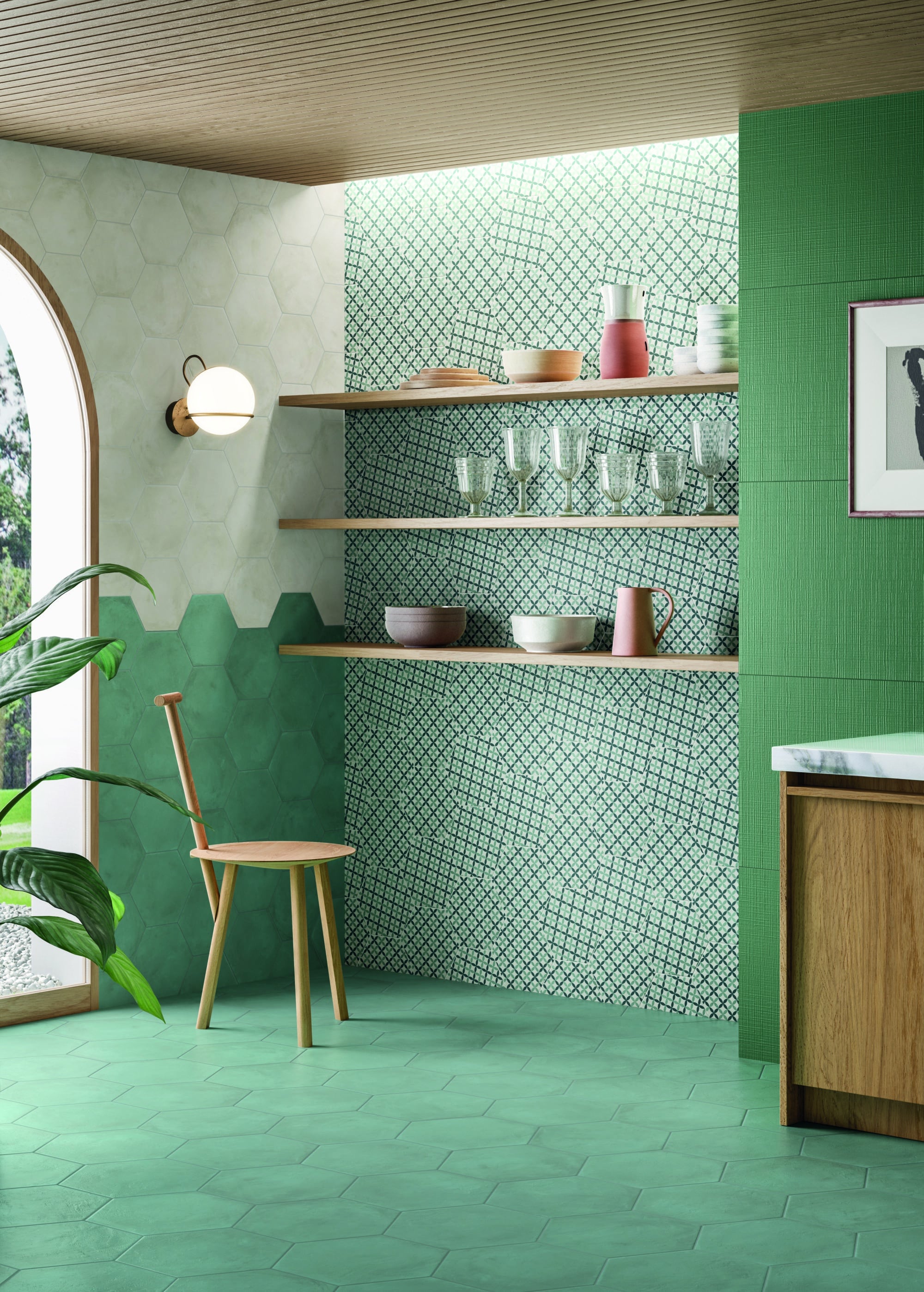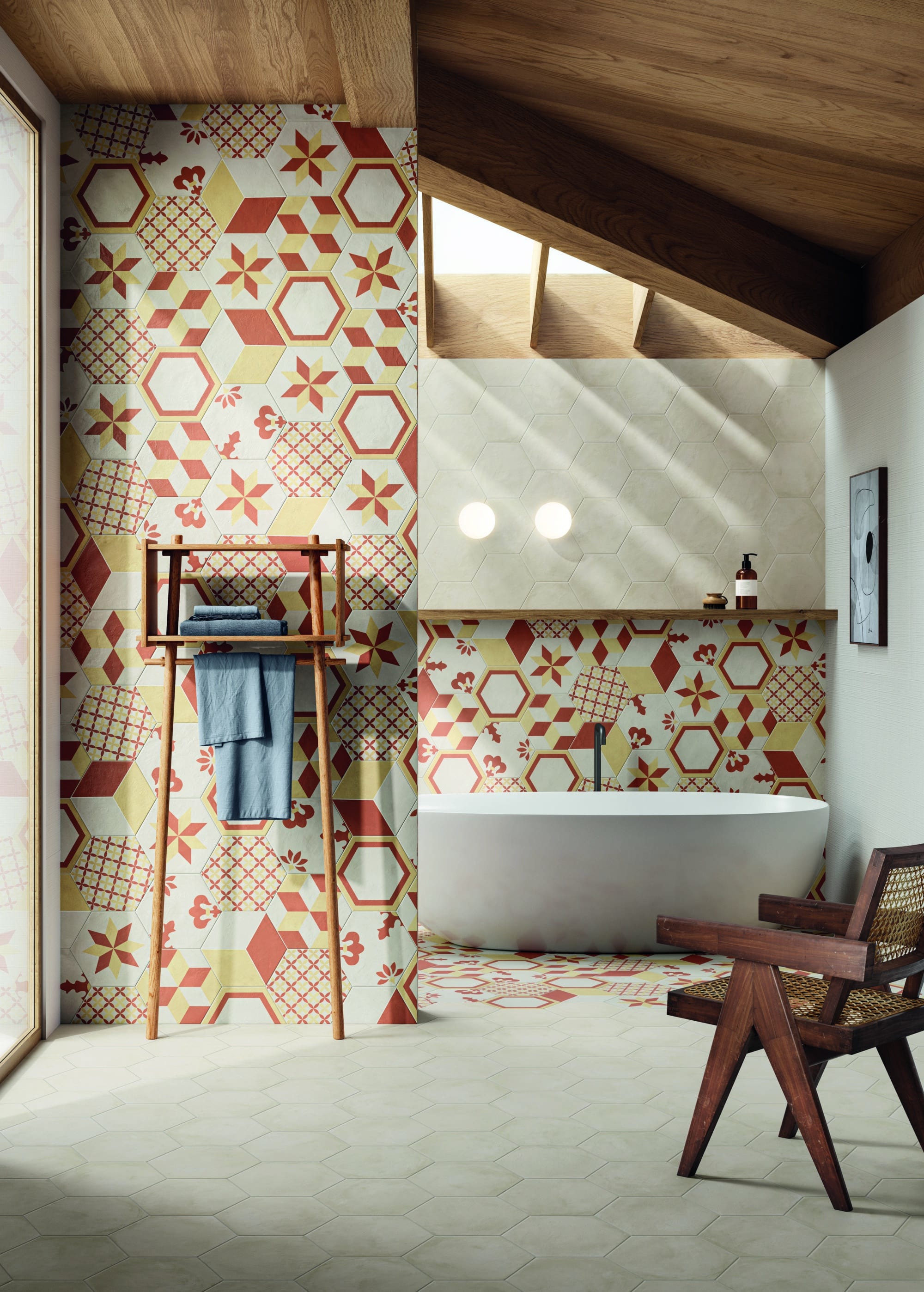Une série en grès cérame, disponible en format hexagonal moderne 25×21,6 et en classique 20×20.