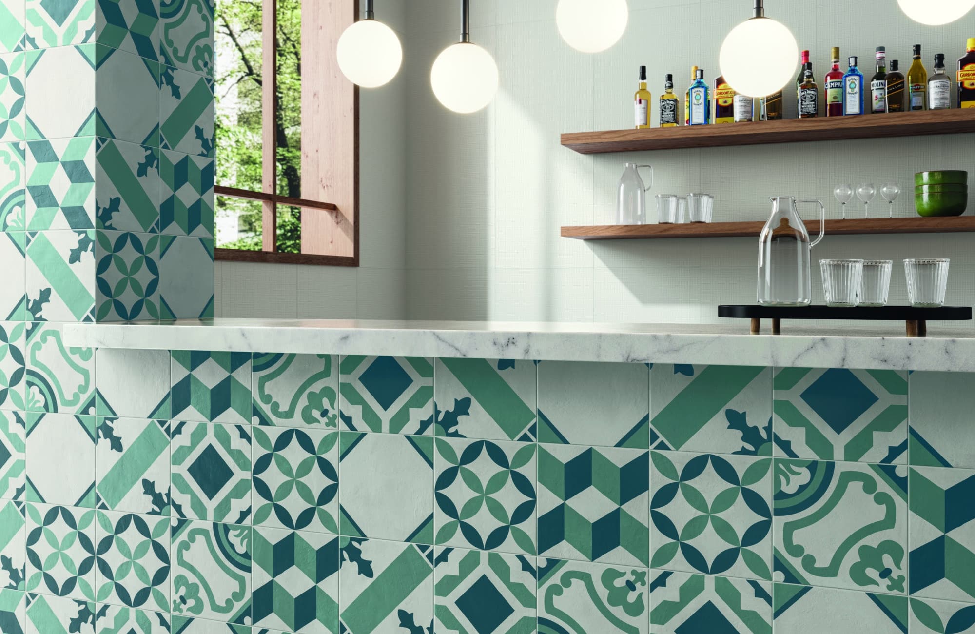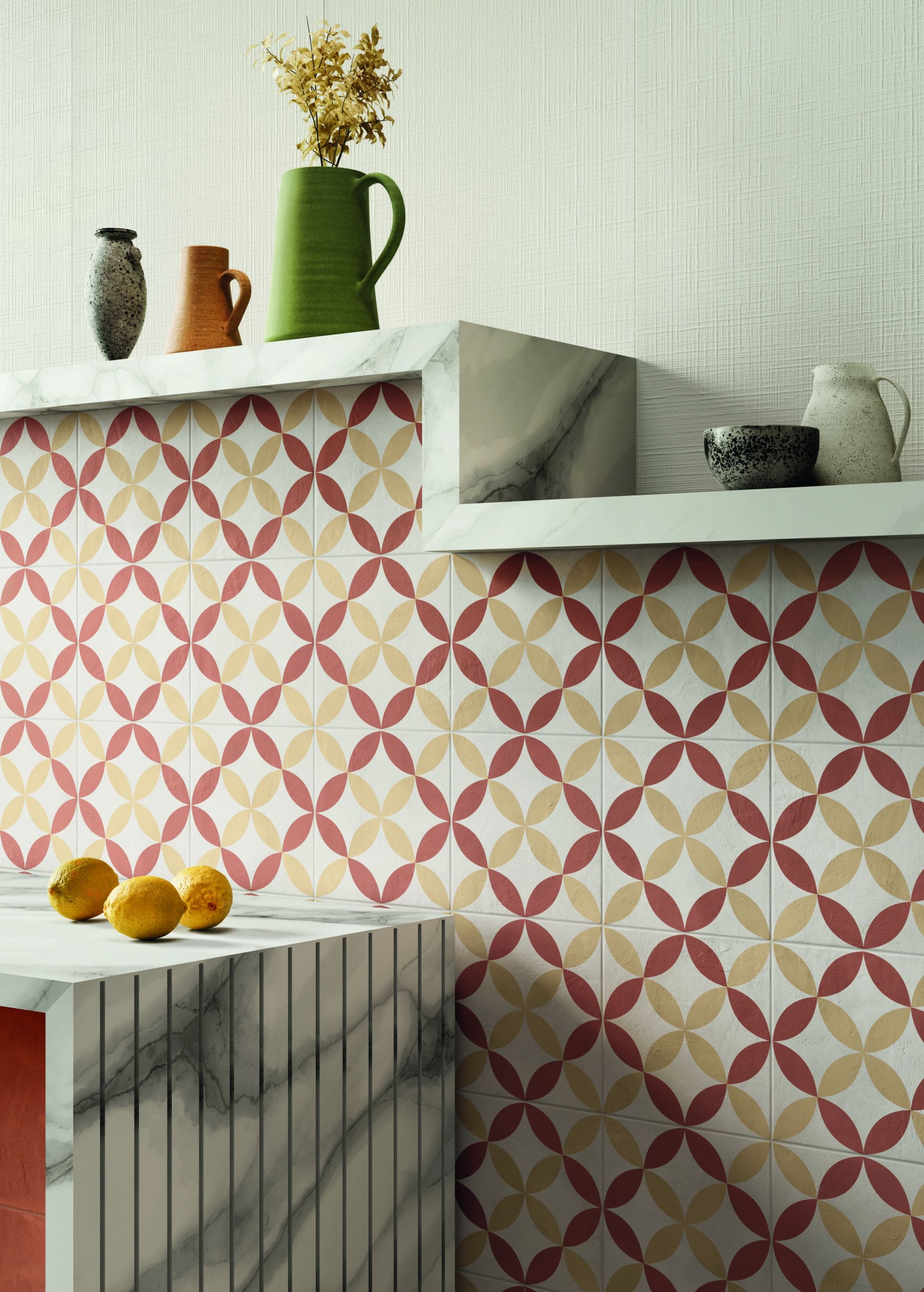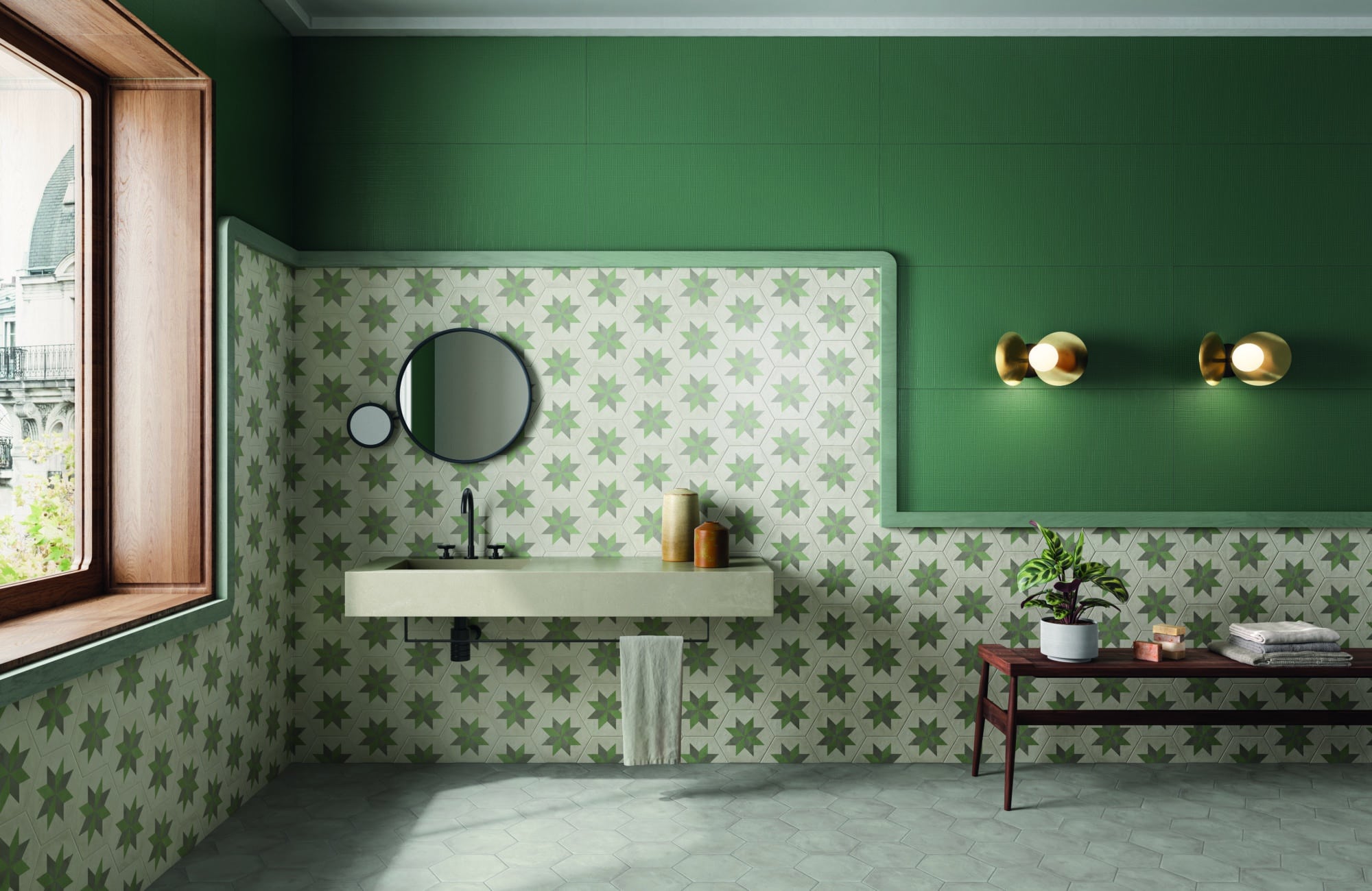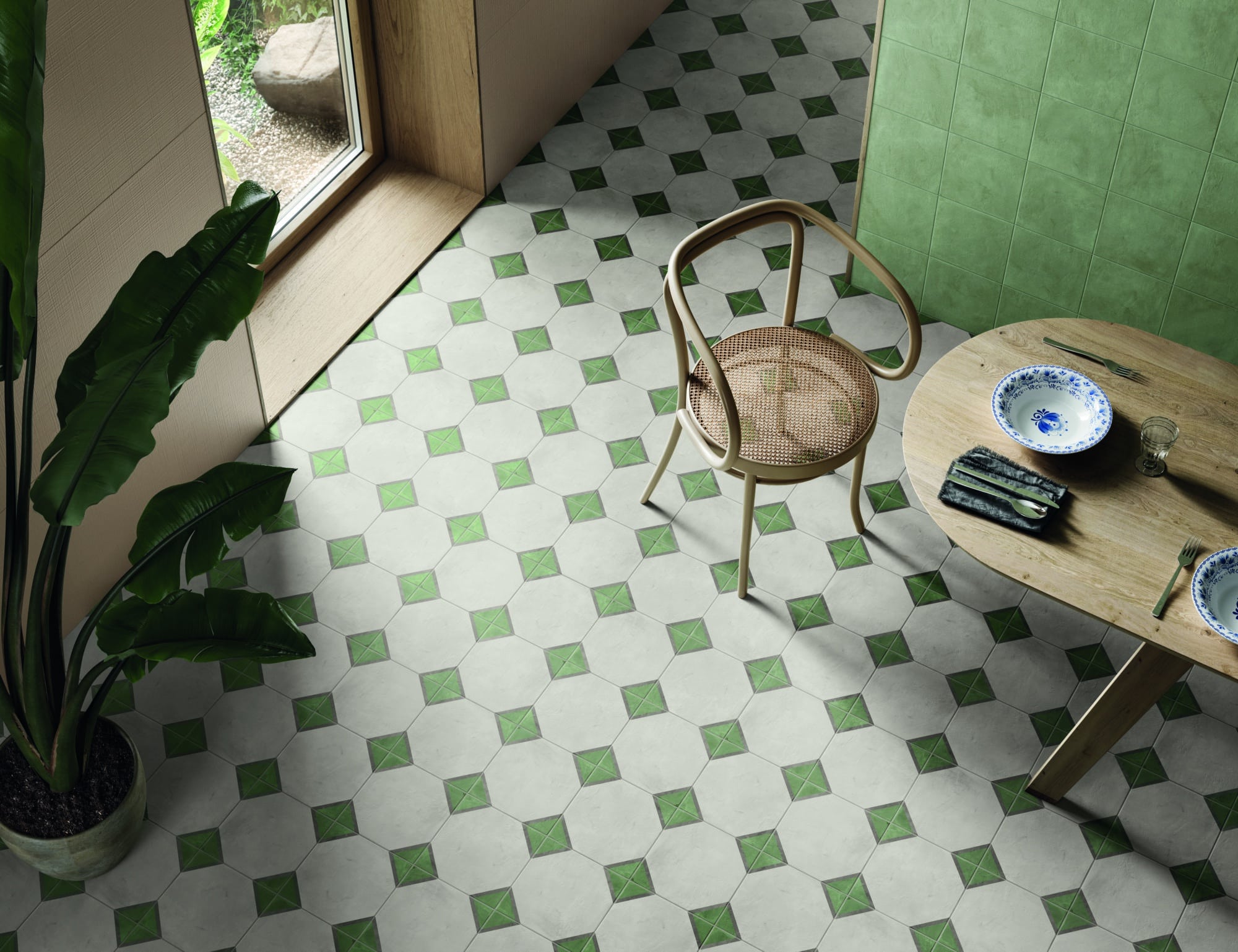 Une série en grès cérame, disponible en format hexagonal moderne 25×21,6 et en classique 20×20.