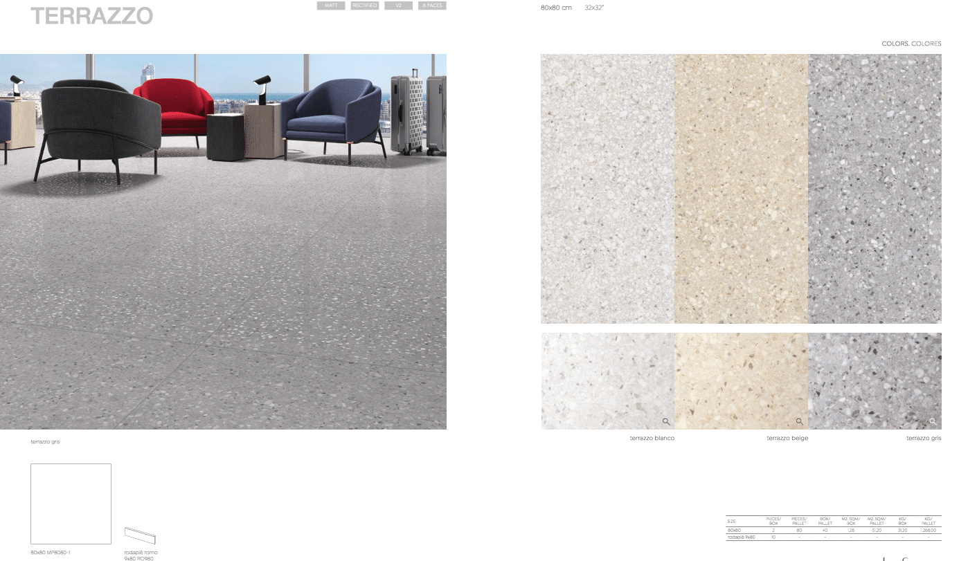 KENDAL La collection TERRAZZO existe en 3 tons neutres et une subtile touche de luminosité qui s’adaptent parfaitement à tous les styles de décoration. CARACTÉRISTIQUES FORMAT INTERIEUR : 80X80