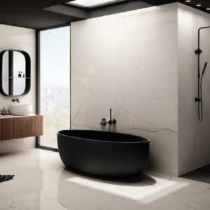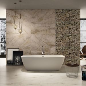 The Room prend sont inspiration de marbres précieux, en utilisant un langage actuel et contemporain. Réalisé en grès cérame pleine masse, disponible en quatre coloris et en formats 120×260 cm, 120×120 cm, 60×120 cm et 60×60 cm, tous de 6,5 mm d’épaisseur.