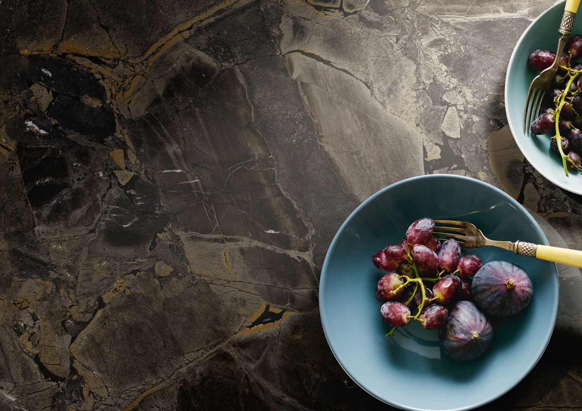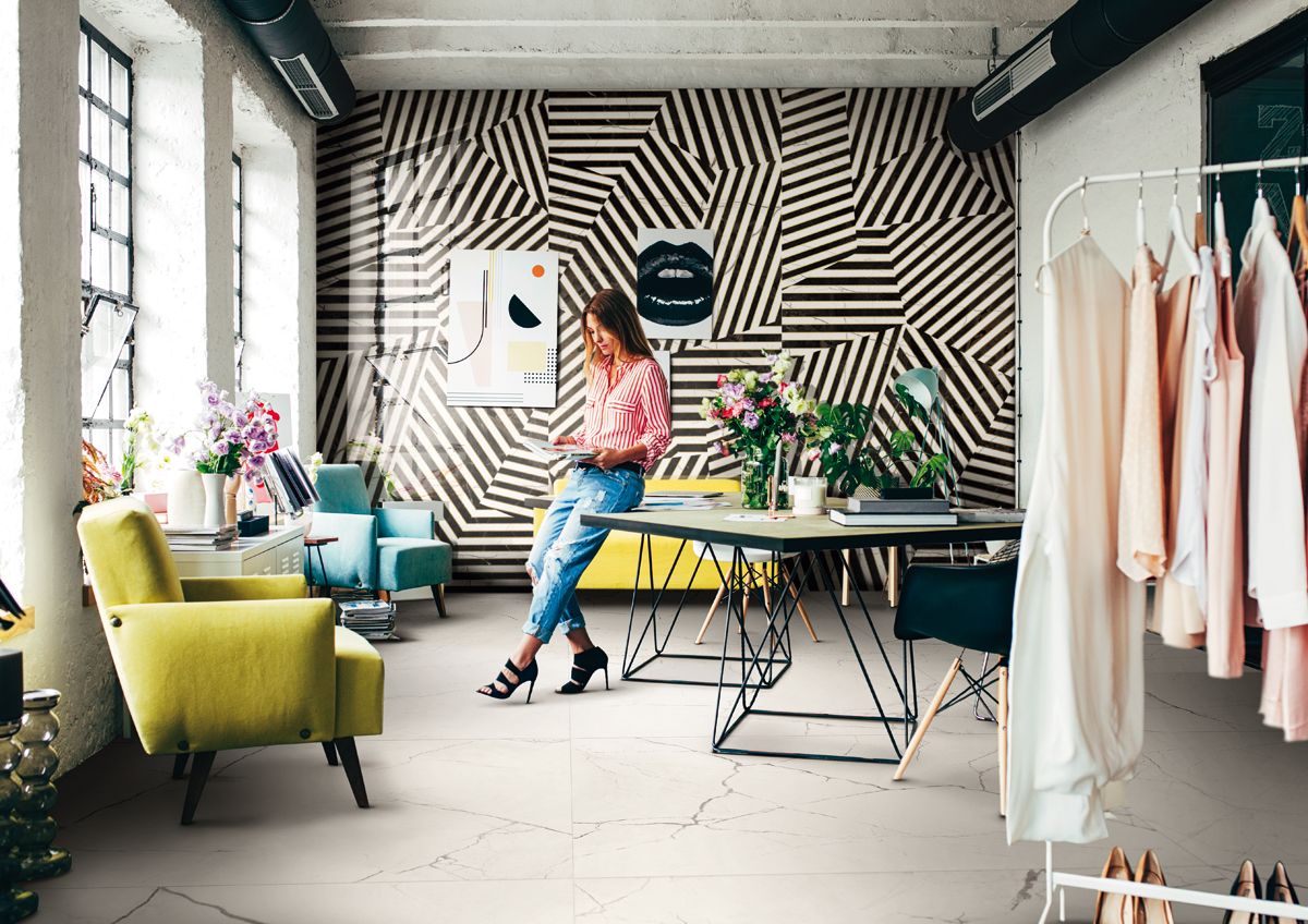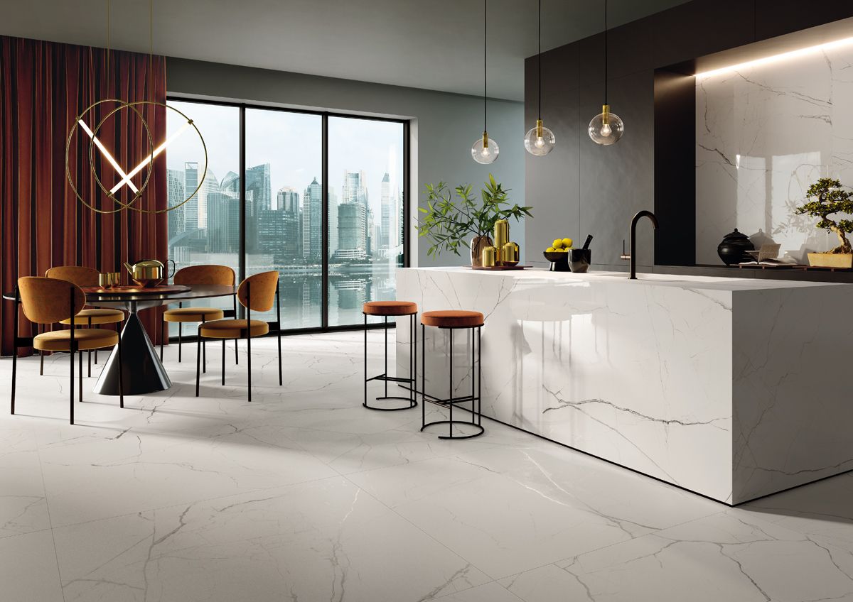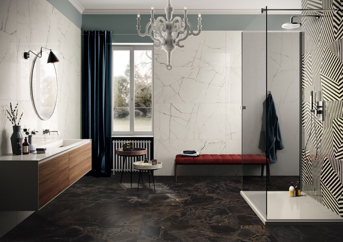 The Room prend sont inspiration de marbres précieux, en utilisant un langage actuel et contemporain. Réalisé en grès cérame pleine masse, disponible en quatre coloris et en formats 120×260 cm, 120×120 cm, 60×120 cm et 60×60 cm, tous de 6,5 mm d’épaisseur.