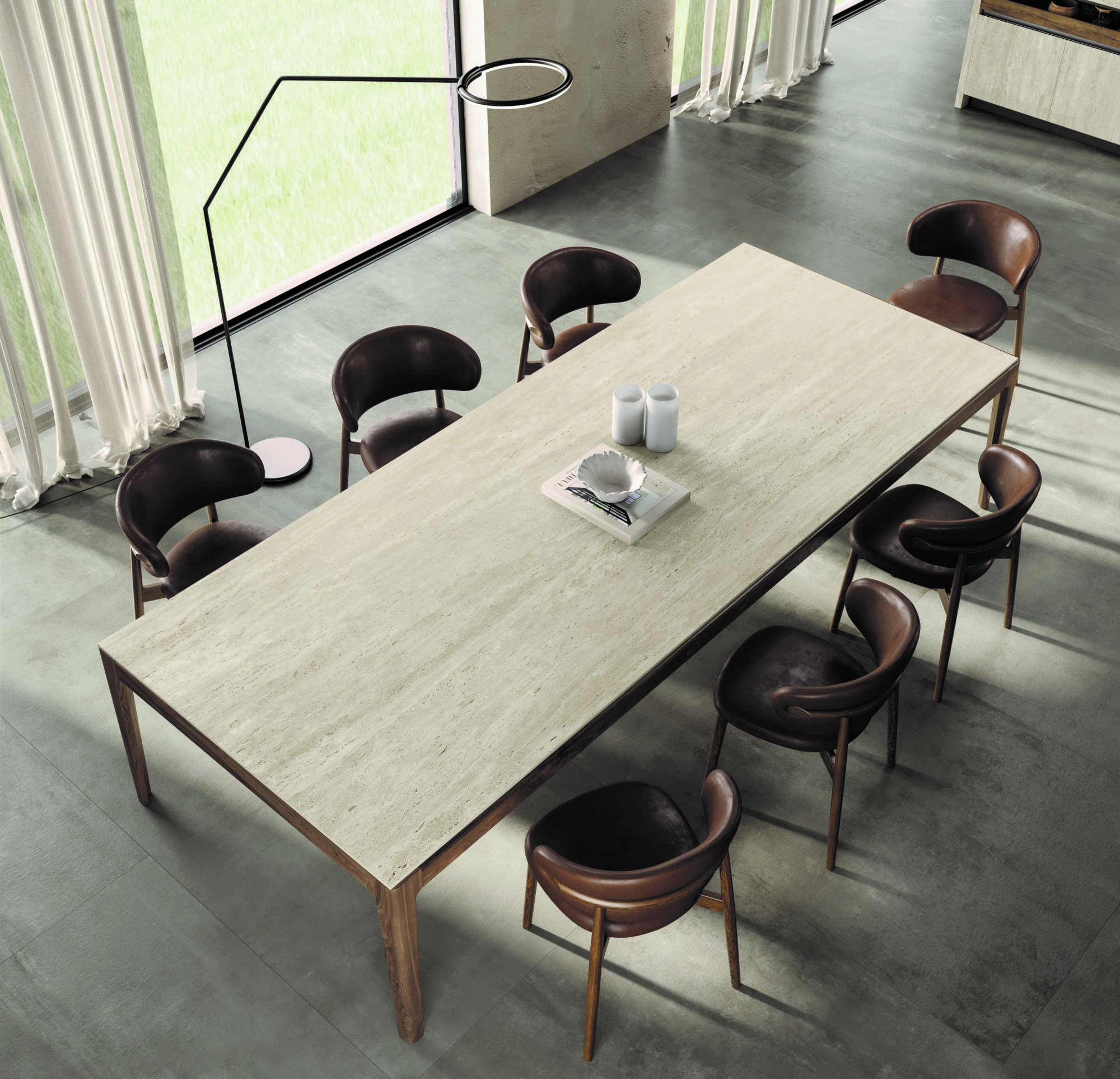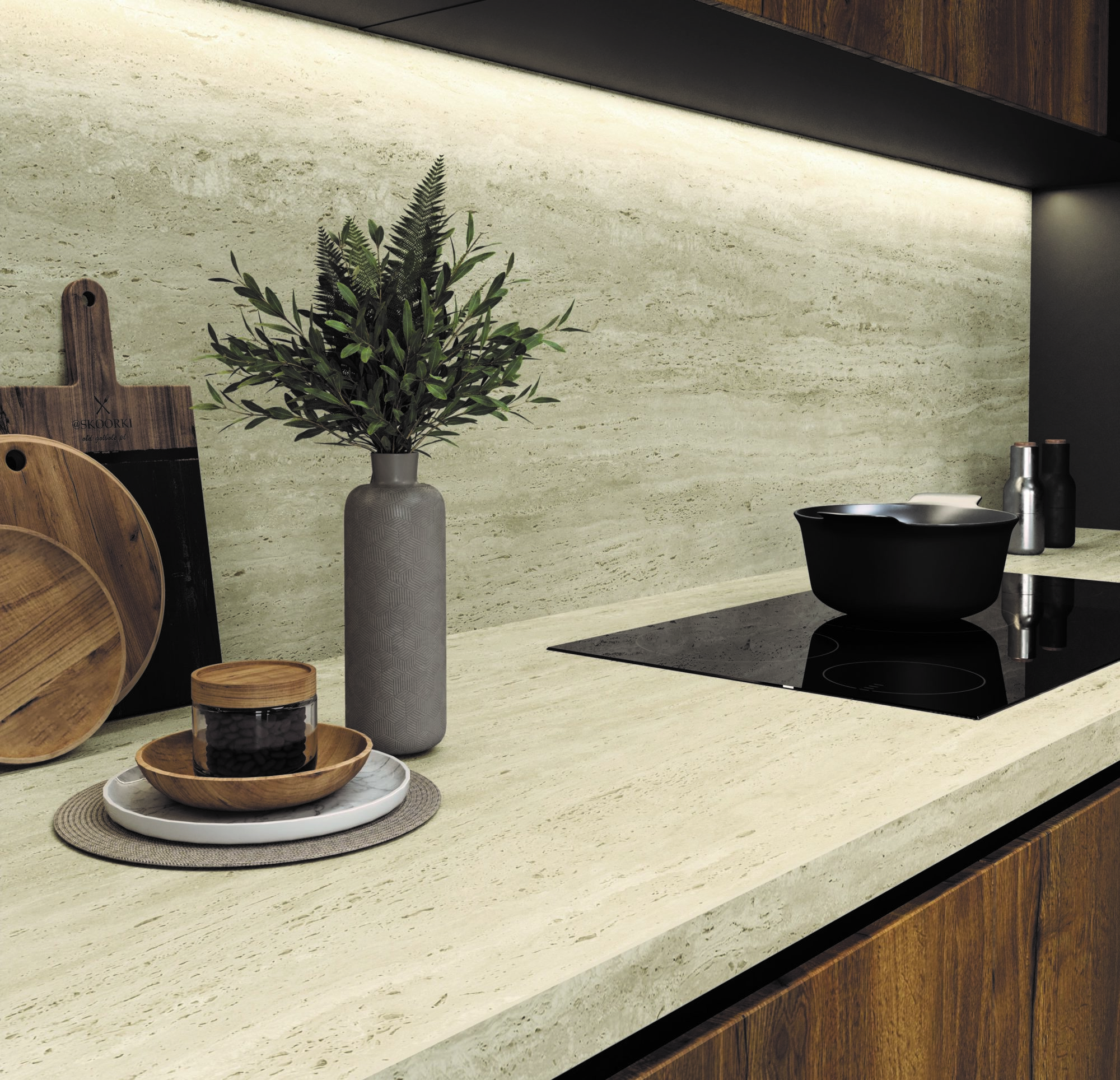 Les chaudes nuances de la grande surface céramique Travertino Pearl se marient parfaitement avec tous les environnements : des projets résidentiels aux commerciaux, aux espaces Horeca et aux milieux professionnels.