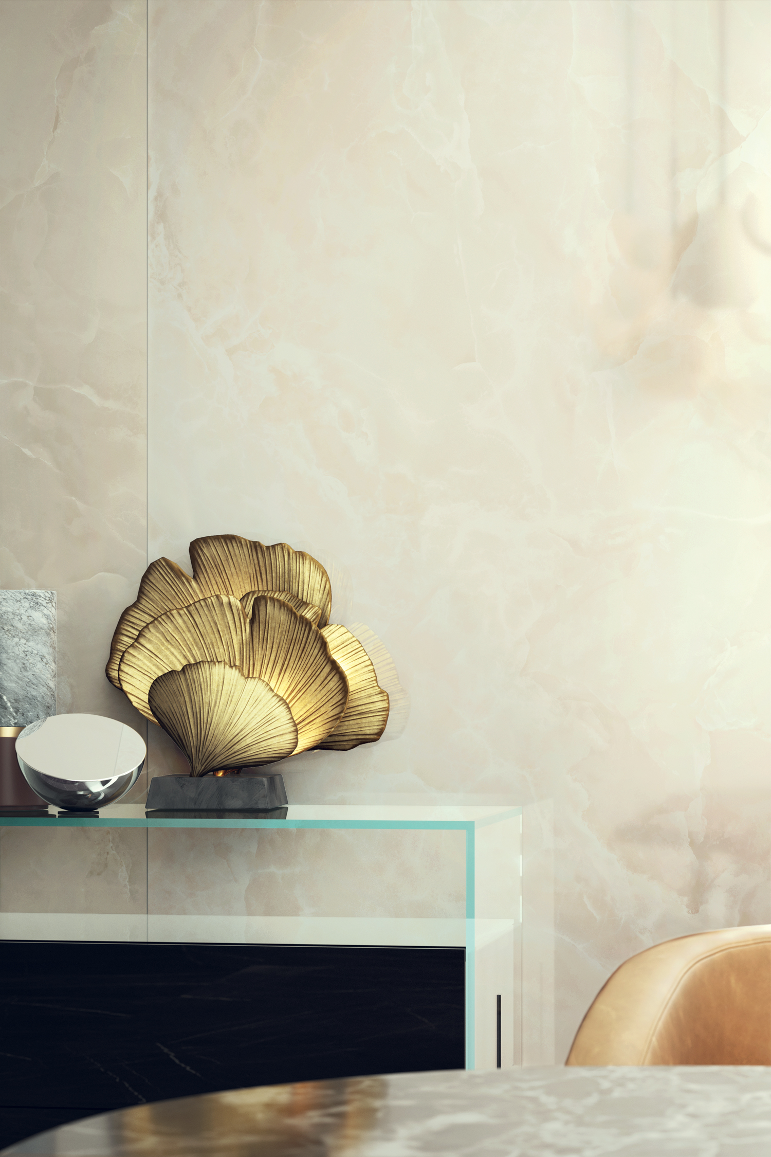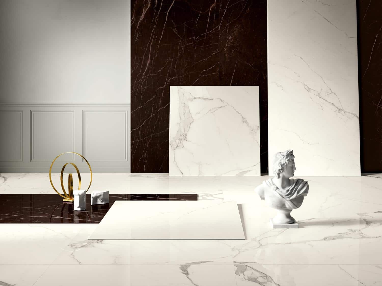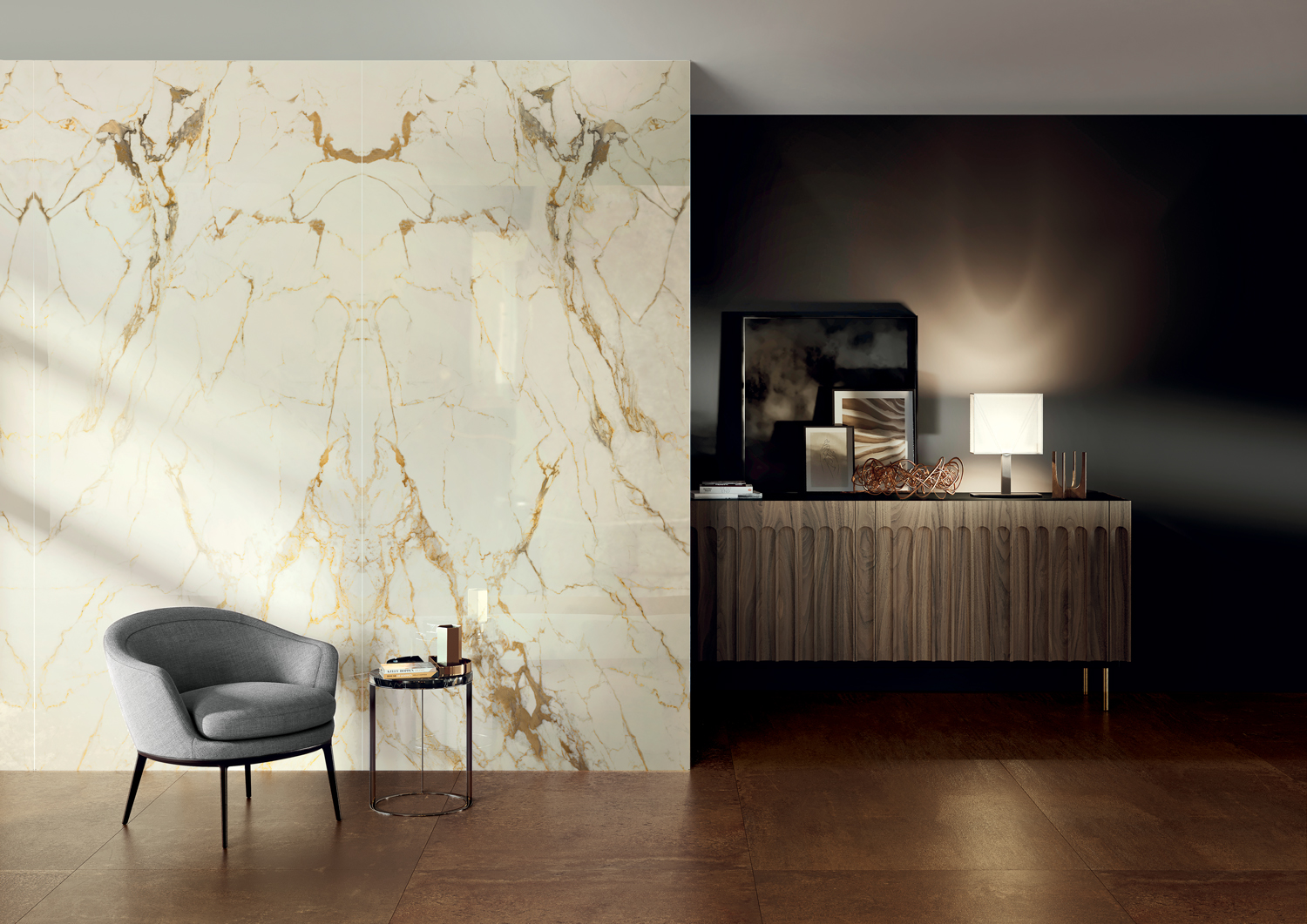 Des veinures légères composent les décors de cette collection, qui s’inspire du marbre dans l’expression la plus sublime de la culture classique.