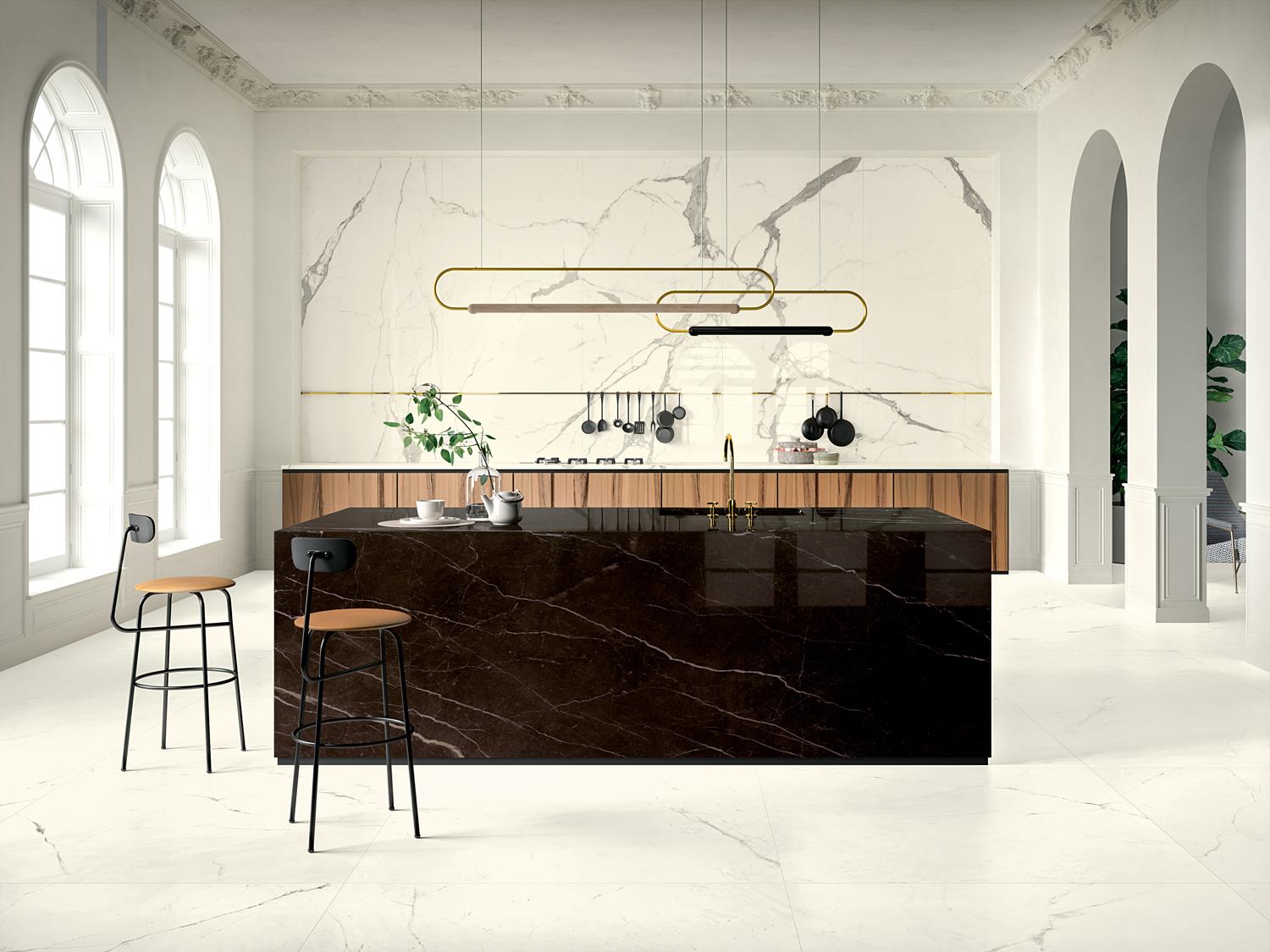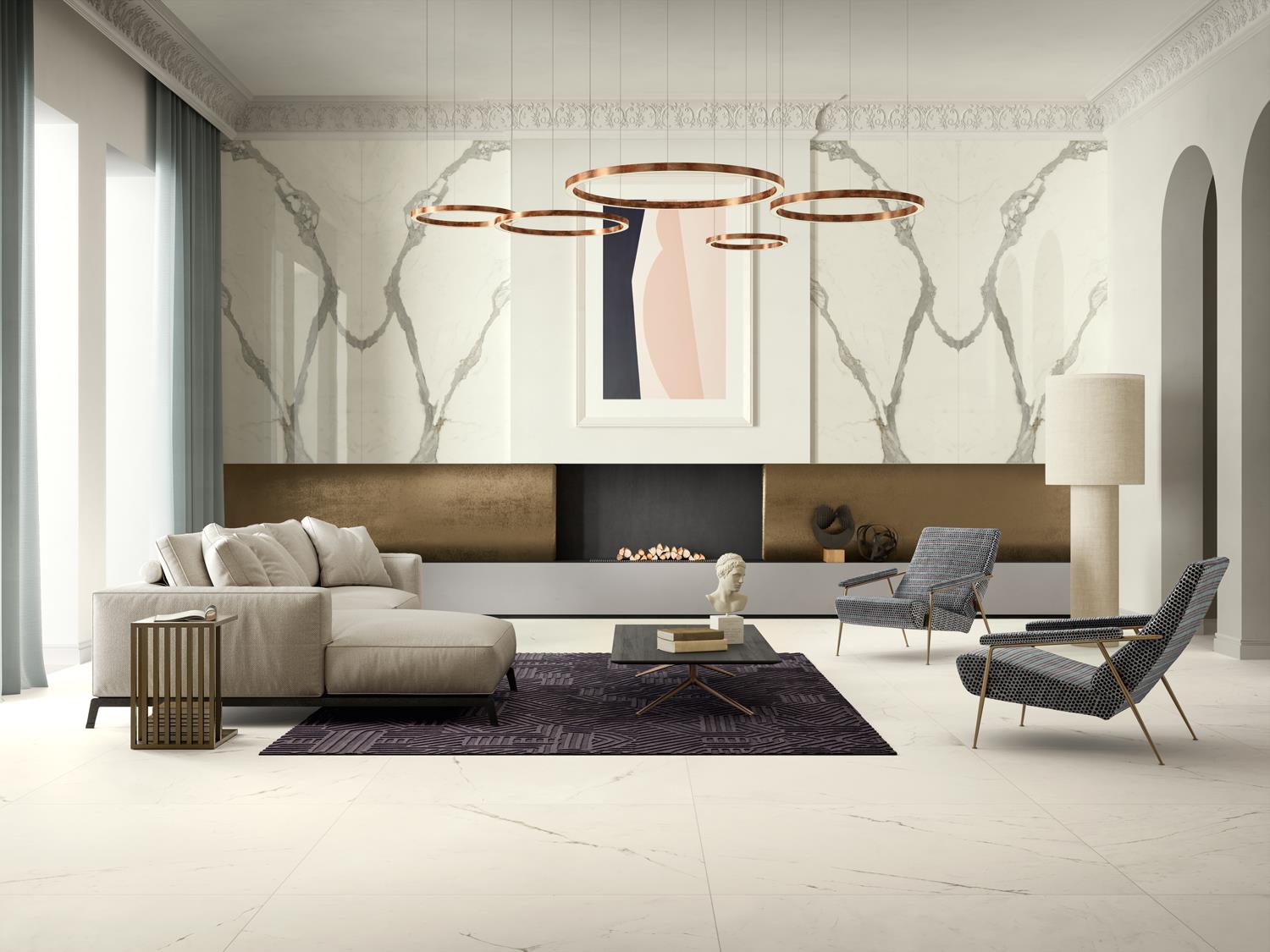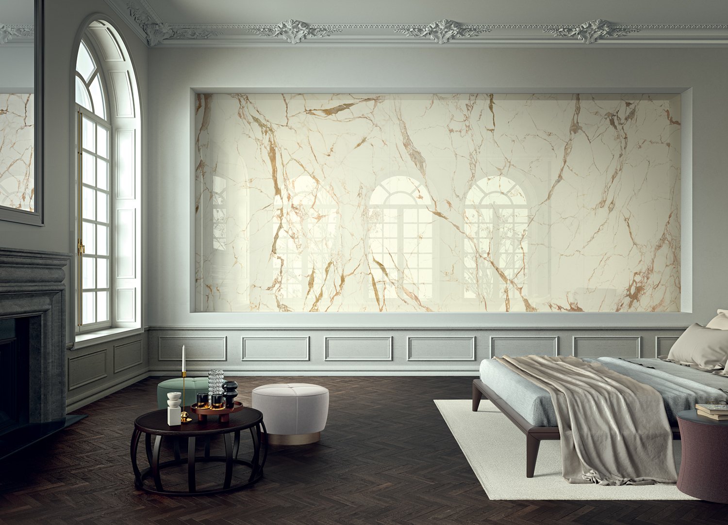 Des veinures légères composent les décors de cette collection, qui s’inspire du marbre dans l’expression la plus sublime de la culture classique.