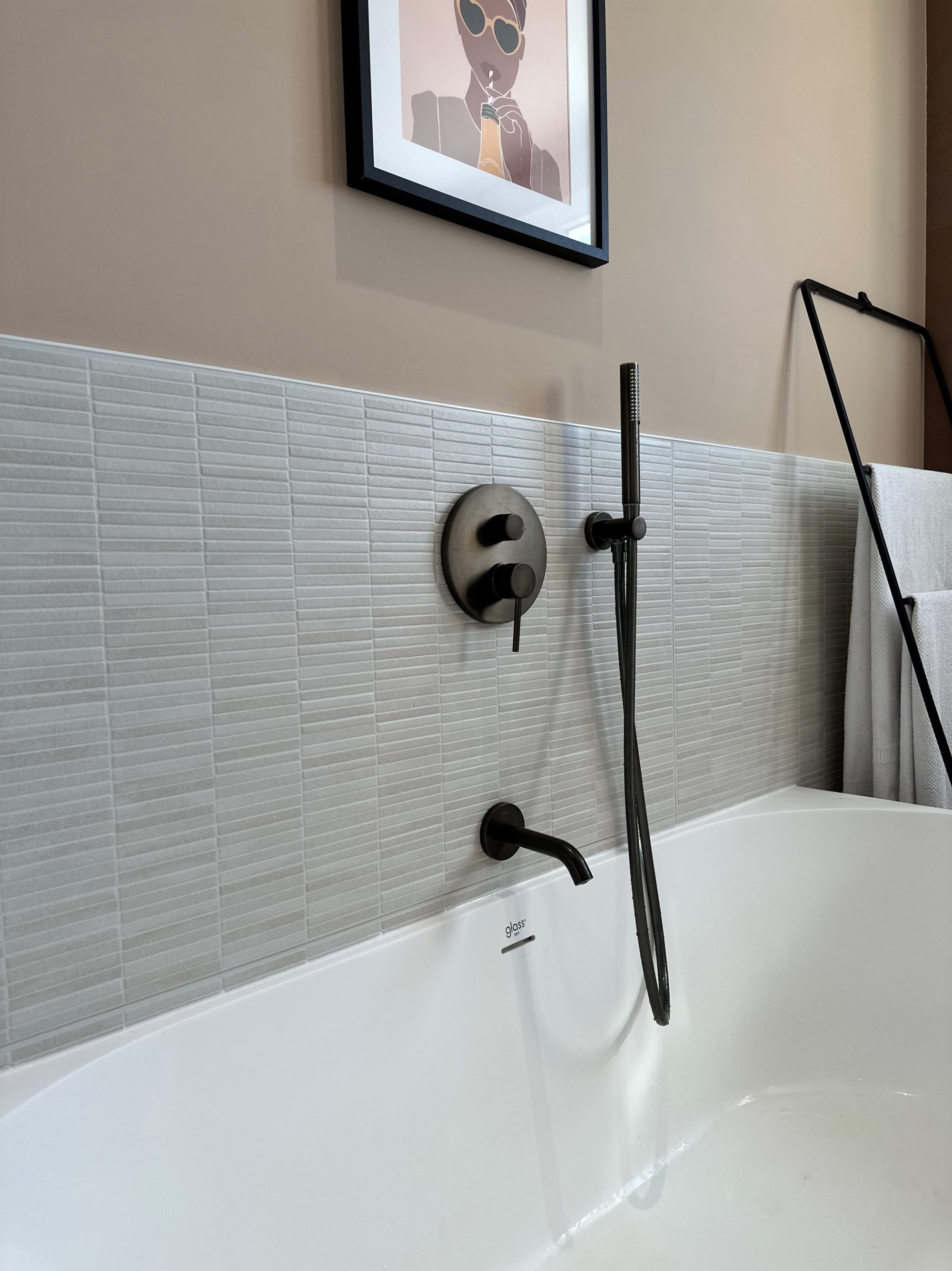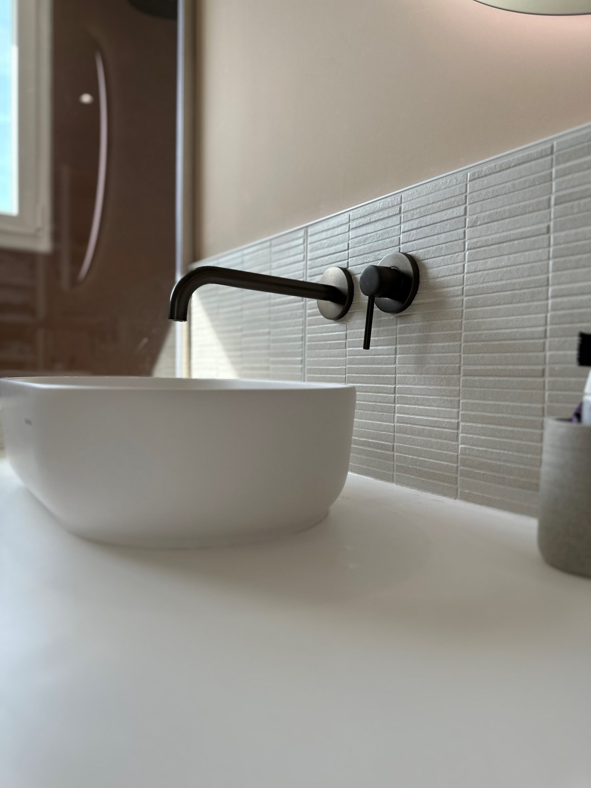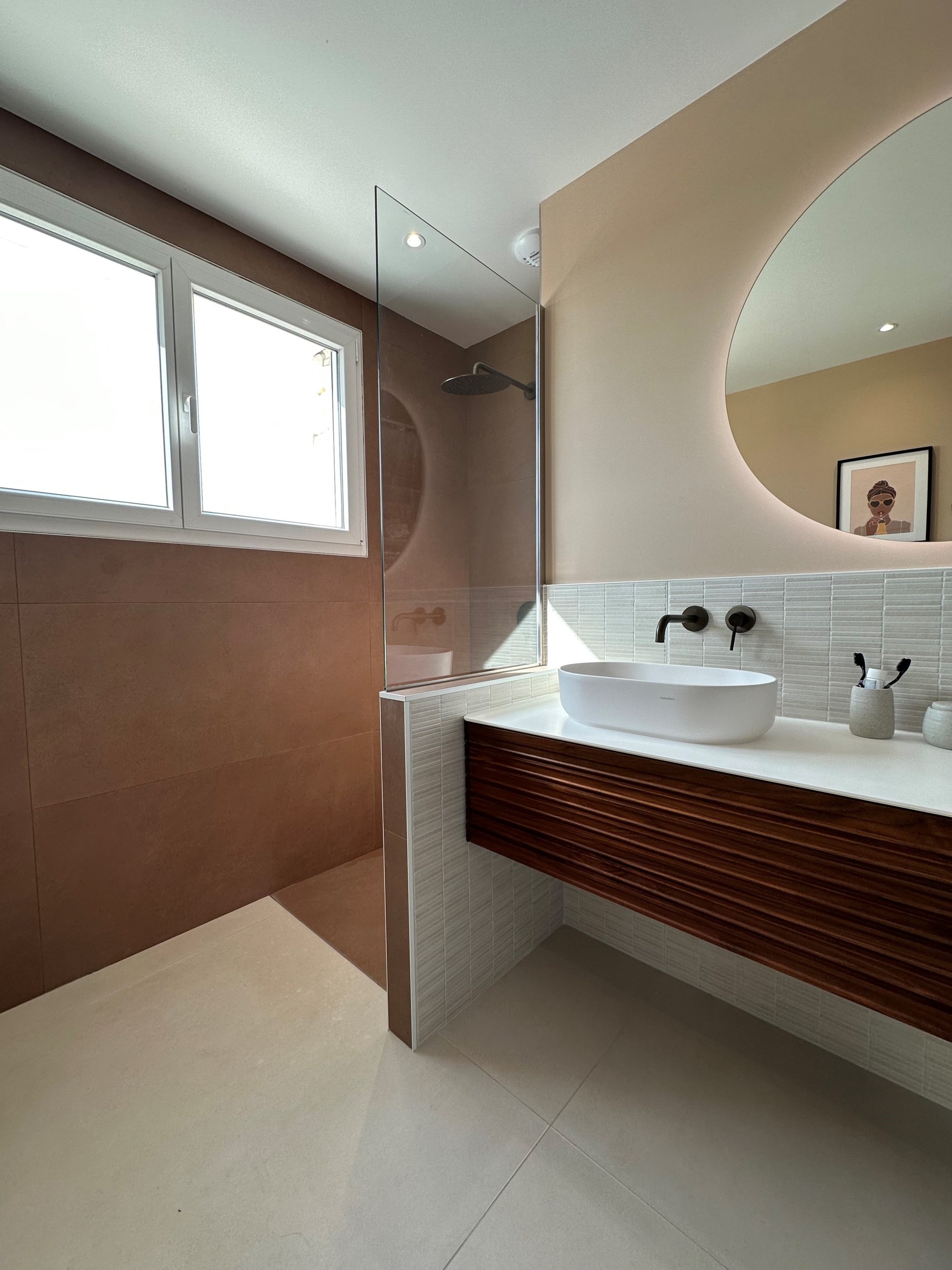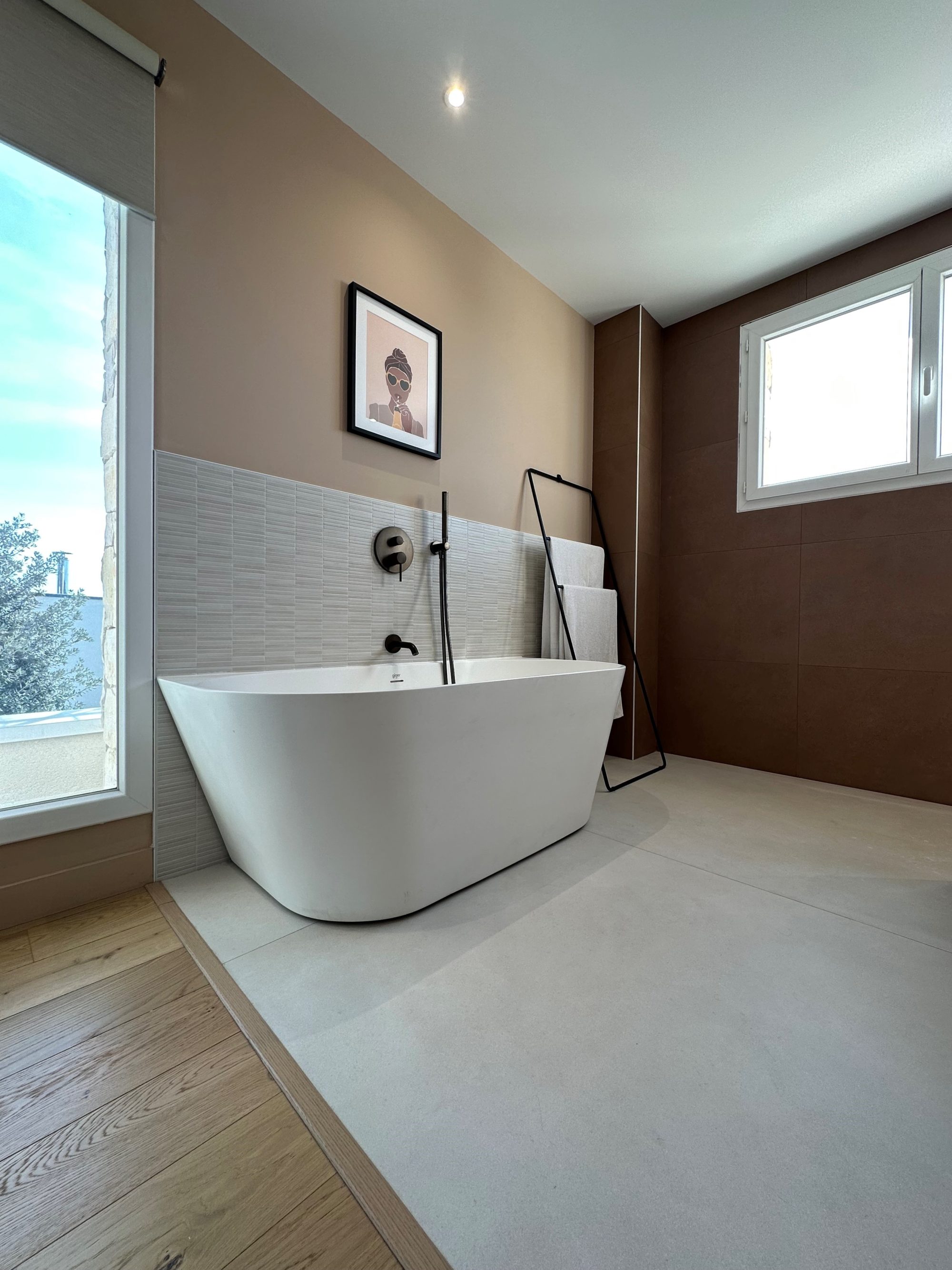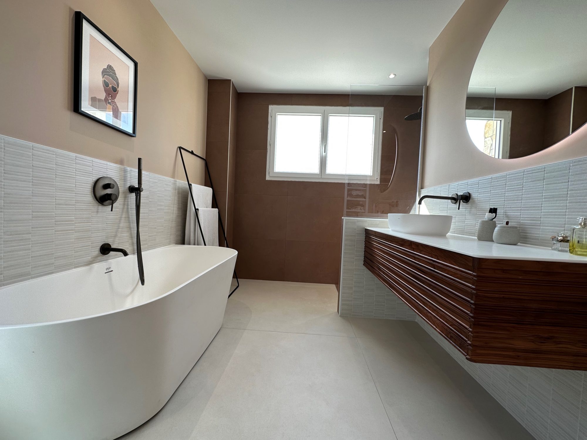 – SANITAIRES : meuble sur mesure noyer américain / baignoire ilot en corian / robinetterie « gun métal » encastrable